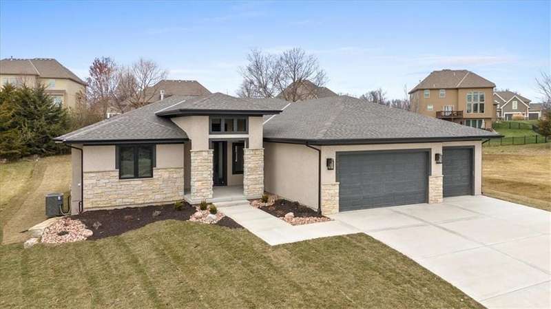 The Brooklyn by New Mark Homes is a 1.5-story walkout residence located in Cadencea thoughtfully designed, master-planned community by Hunt Midwest. With an estimated completion of December 2025, this 5-bedroom, 4.5-bathroom home offers over 2,800 square feet of elevated living, blending intentional design with everyday functionality.From the moment you arrive, the dimensional front elevation makes a striking impression. Inside, you'll find a spacious, open-concept layout featuring custom-built cabinetry, quartz countertops, a walk-in pantry, and an oversized islandideal for daily routines and effortless entertaining. The kitchen flows seamlessly into the great room, where a floor-to-ceiling tiled fireplace serves as a stunning focal point. A walkout deck extends your living space outdoorsperfect for relaxed evenings or weekend gatherings. Upgraded trim and designer-selected finishes throughout the home add depth, detail, and polish to every space. The main-level primary suite offers a quiet retreat with a spa-inspired bathroom, freestanding soaker tub, and dual vanities. A secondary bedroom on the main floor adds flexible space ideal for guests, a home office, or nursery. Upstairs, a loft anchors three additional bedroomseach with bath accessoffering privacy and versatility for family or guests. Cadence residents enjoy access to a range of neighborhood amenities, including a community pool, winding walking trails, and nearby Platte Purchase Park. Located in the award-winning North Kansas City School District and within Staley High School boundaries, this home delivers an ideal combination of style, location, and livability.