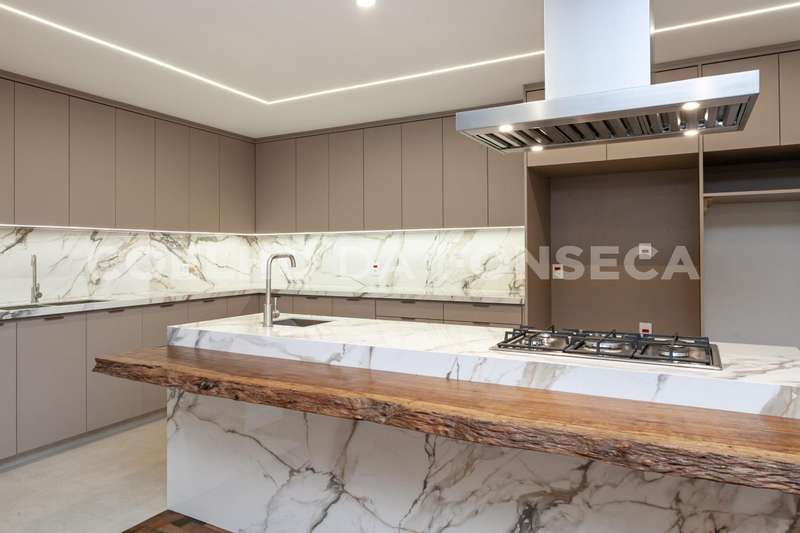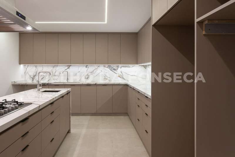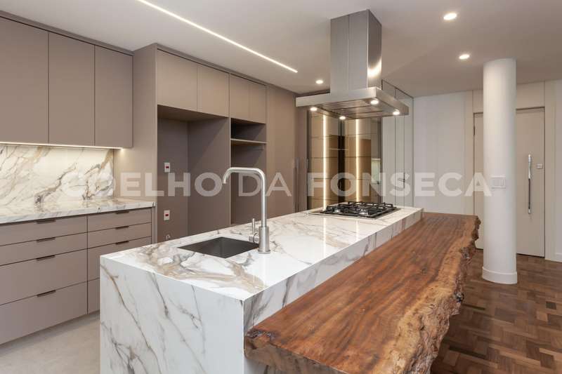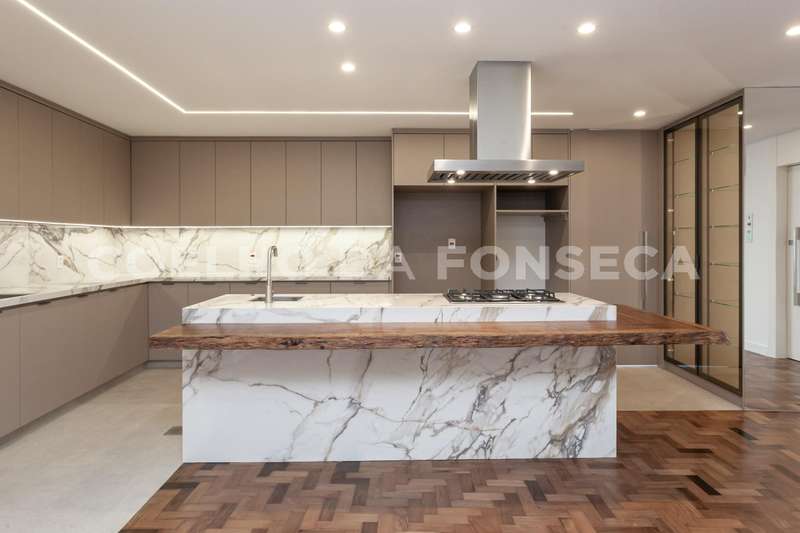 O living integrado com a cozinha apresenta uma ilha gourmet de pedra ultra compacta, bancada com marcenaria de estúdio e coifa sob medida com motor acústico, trazendo conforto e harmonia ao ambiente.