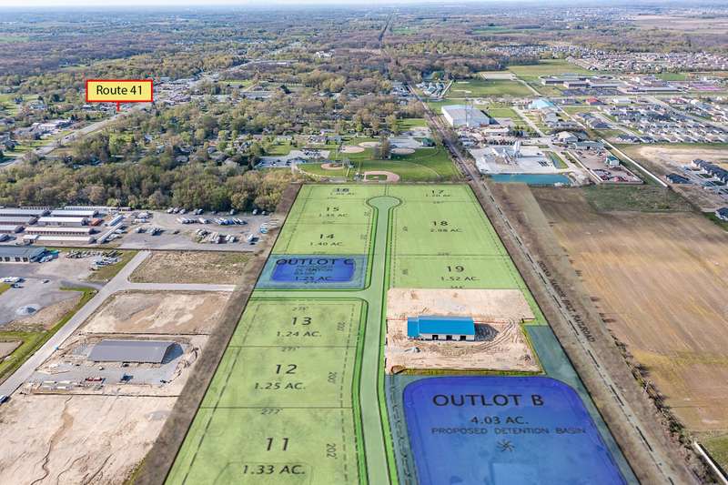 RAILSIDE Business Park. PREMIUM Lot 11 is zoned M1- Light manufacturing, automotive, food and beverage, lumber yard, construction contractors, government offices, glass and processing, lodging, storage, warehousing, assembly and many more business opportunities- full list attached.Great opportunity for all B-3 and M-1 uses in this growing area!!! The rail-site lots are develop-ready with roadway and utilities including Phase 3 electrical service. Multiple lots are allowed to be combined into one building site. Multi-tenant/occupants per buildings are allowed up to a total of three (3). Time to start planning!!!Great interstate connectivity as well as quick access to the Rt 41/Rt 231 and Rt 2 interchange on I-65 as well as Rt 10/Rt 114 gives access across to Illinois. Rt 41 north and south access from Chicago to the south are limitless.