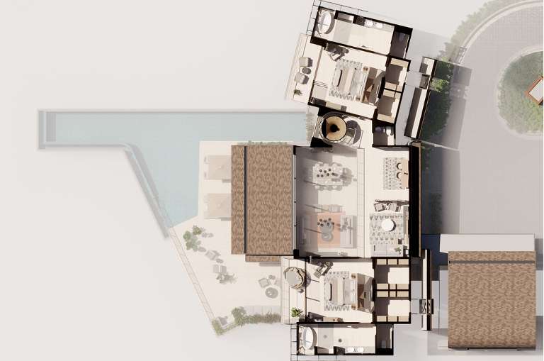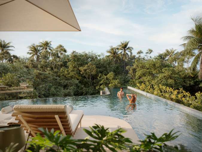 The highlight of Treehouse 3 is its seamless outdoor living experience. With over 216 square meters (2,324.74 square feet) of pool and terrace area, the space invites you to relax, recharge, and entertain. The infinity-edge pool visually merges with the treetops, offering a sense of floating above the forest. Whether enjoying a quiet morning coffee, a sunset swim, or hosting an intimate gathering under the stars, this setting delivers a truly immersive tropical lifestyle.