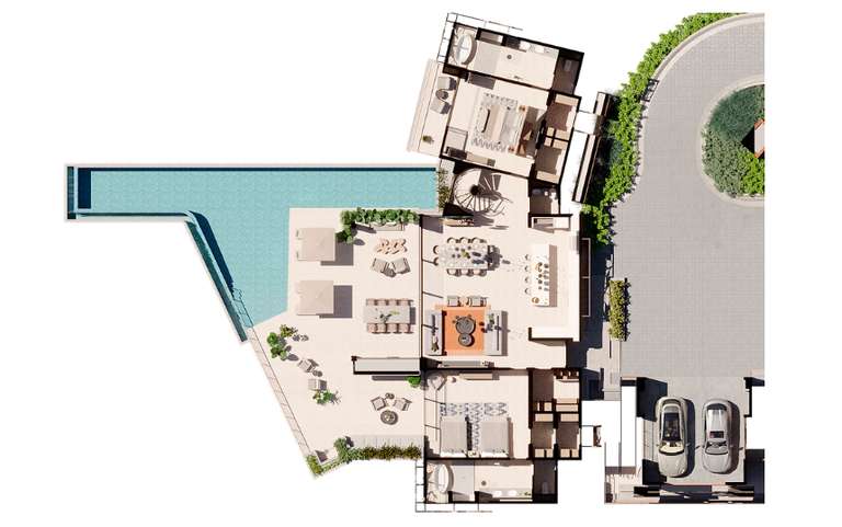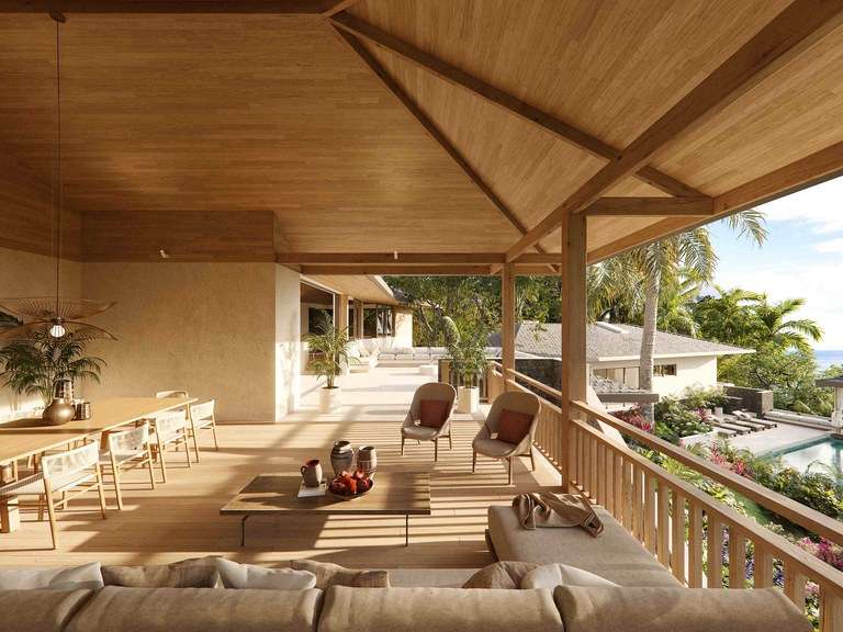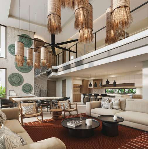 Spanning a total of 932 square meters (10,032 square feet), Treehouse 3 was built for those who seek both tranquility and sophistication. With 715.84 square meters (7,705.23 square feet) of air-conditioned interior space, the home features an expansive open-plan layout that blurs the boundaries between indoor and outdoor living. Large sliding glass doors open up to panoramic jungle views, flooding the living areas with natural light and tropical breezes. Every corner of the home is designed to connect you to the surrounding beauty, from the serene bedrooms to the flowing living and dining areas anchored by refined natural finishes and modern design elements.