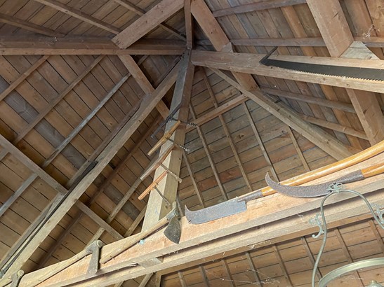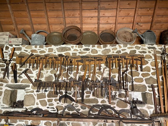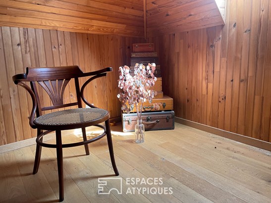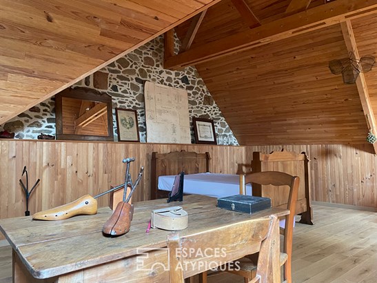 Near the entrance, a corridor where the old tools displayed in a row, leads us to a large room of 50sqm under a cathedral roof. The owner, passionate about books, has installed a large library there, to indulge in reading by the stone fireplace as beautiful as that of the living room. The staircase serves a large bedroom used as a dormitory, furniture and objects creating a nostalgic atmosphere, reminding us of memories of our childhood. The ground floor of this space has a bedroom, a separate bathroom and a laundry room.