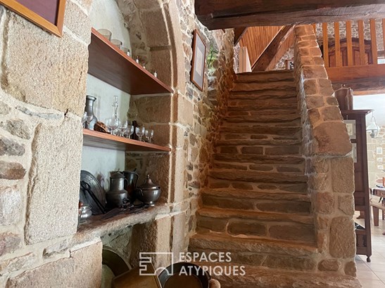 The large entrance of around 20sqm and its stone fireplace sets the tone: A double glass and wood door gives a glimpse of the immense kitchen-living room-lounge area of over 80sqm where the period fireplace sits in the heart of the room. The magnificent stone niches dating from the end of the 17th century complete this space where objects and antique pieces have found their place. By walking up the interior stone staircase, a mezzanine space has been created allowing a view of the living room. The owner had installed his bedroom there. In continuity, a bathroom and a dressing room, creating a master suite.
