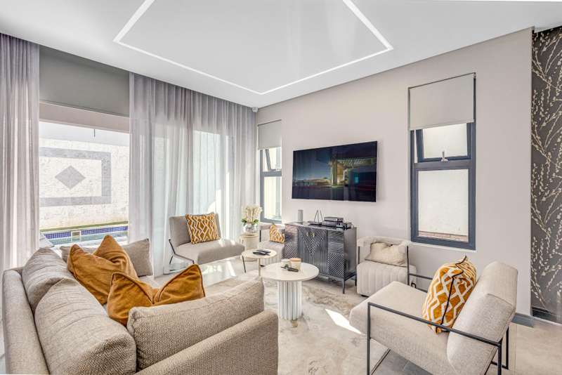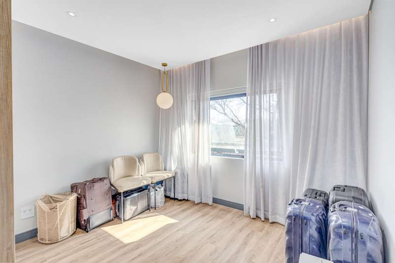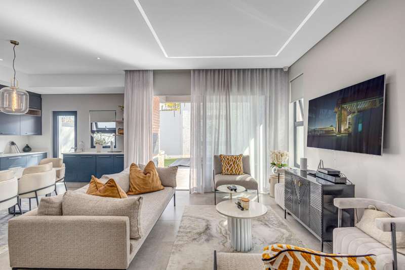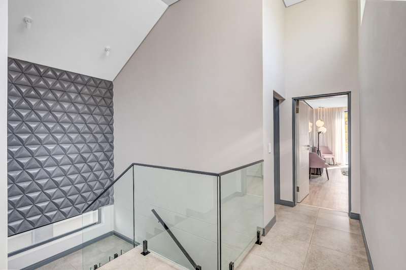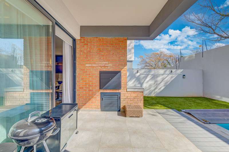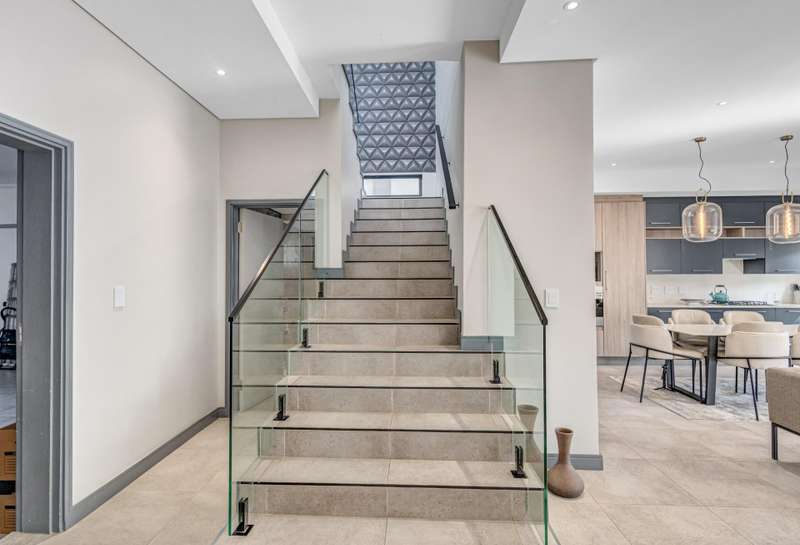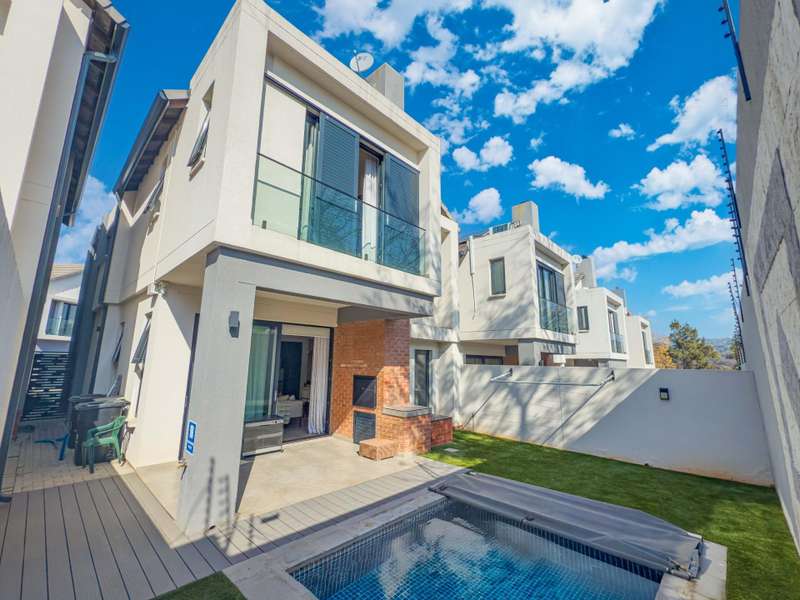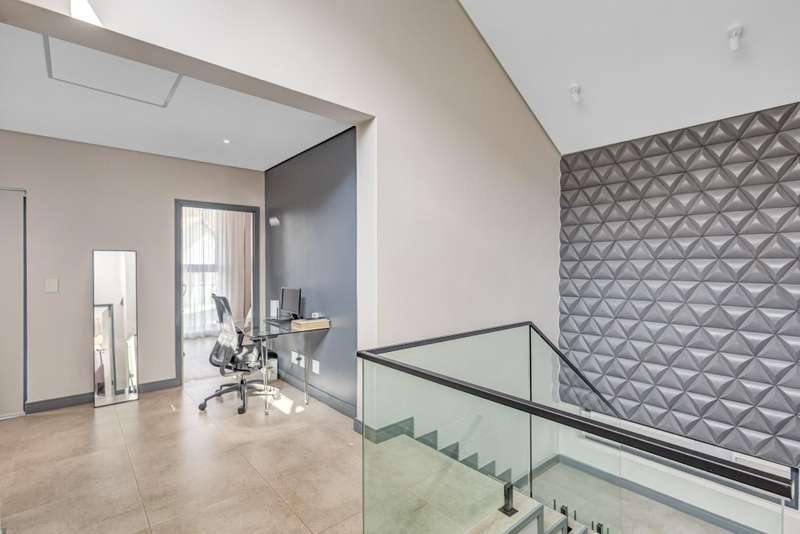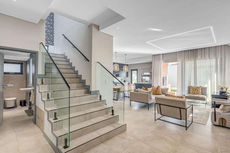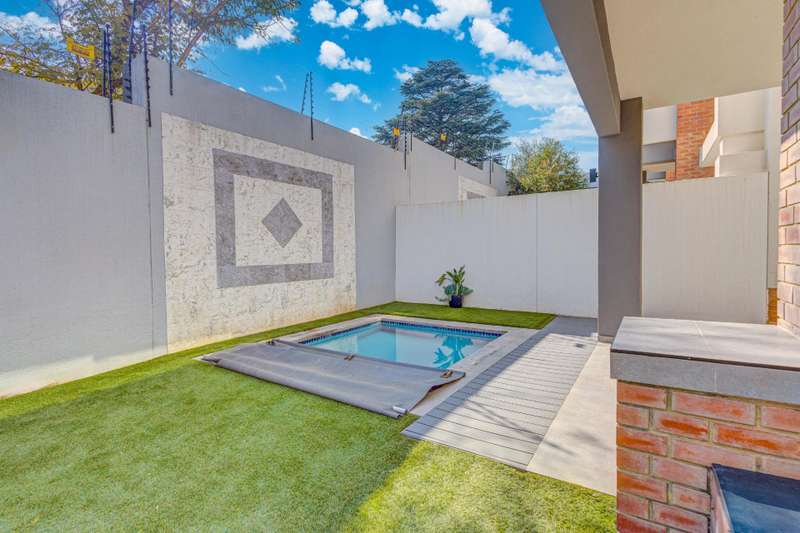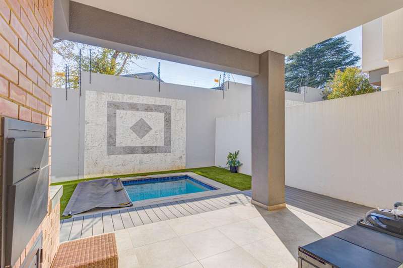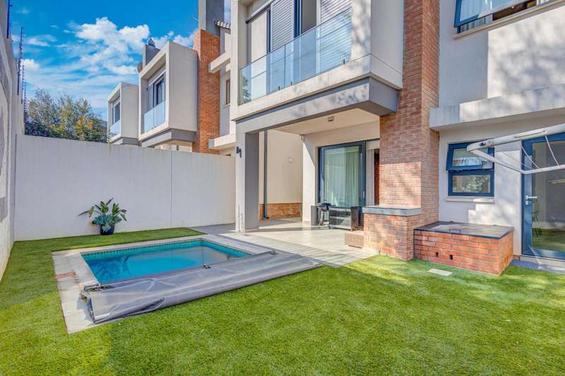 Discover sophisticated and secure living in the heart of Bryanston with this elegant cluster home situated in an exclusive estate. This contemporary residence seamlessly blends modern architecture with high-quality finishes and eco-friendly features, making it an ideal choice for those seeking both convenience and comfort. *Key Property Features:* - *Three Spacious Bedrooms:* Each room comes equipped with built-in closets, stunning pendant lighting, and private en-suite bathrooms. - *Three Sophisticated Bathrooms:* The en-suites of the main and second bedrooms feature both freestanding bathtubs and showers, adorned with chic European tiles, premium Giberit fixtures, and heated towel rails. The third bathroom includes a stylish shower. - *Open-Plan Living and Dining Area:* The inviting space seamlessly connects to a covered patio, complete with a built-in braai, ideal for entertaining guests or relaxing in solitude. Enjoy outdoor leisure in the private pool area, designed with a composite deck and a beautiful feature wall. - *Contemporary Gourmet Kitchen:* Outfitted with a SMEG gas hob, electric oven, extractor fan, and elegant Caesarstone countertops, this kitchen is a chef's delight. - *Striking Staircase Design:* Featuring a concrete accent and a frameless glass balustrade, accompanied by high ceilings that enhance the home?ÇÖs spacious feel. *Secure Parking:* The property includes a private double garage, along with additional visitor parking spaces. *Smart, Sustainable Features:* - 3KVA inverter with battery backup for energy efficiency - Retrofit solar geyser for environmentally friendly water heating - Backup water storage tanks for enhanced resilience - European double-glazed doors and windows with triple-locking systems for added security - 24/7 manned security and access control, featuring high walls, electric fencing, and CCTV surveillance in a gated community - An upstairs balcony offers stunning panoramic views of the complex and the Bryanston skyline - Communal swimming pool and braai facilities for residents' enjoyment *Location:* Nestled in a tranquil, tree-lined area of Bryanston, this home offers easy access to Sandton CBD and premier schools. *Additional Perk:* This property currently generates rental income of R39,000 per month, making it a valuable investment opportunity. Don?ÇÖt miss your chance to experience the ultimate in modern living in this luxurious Bryanston home!