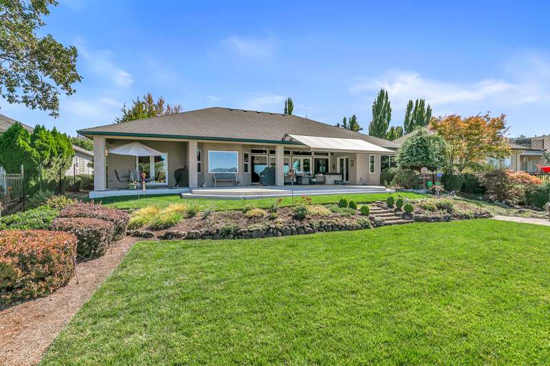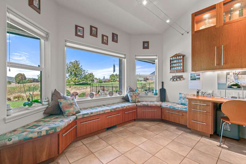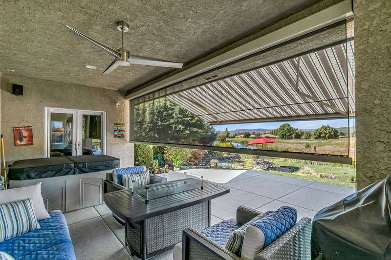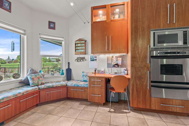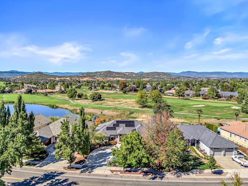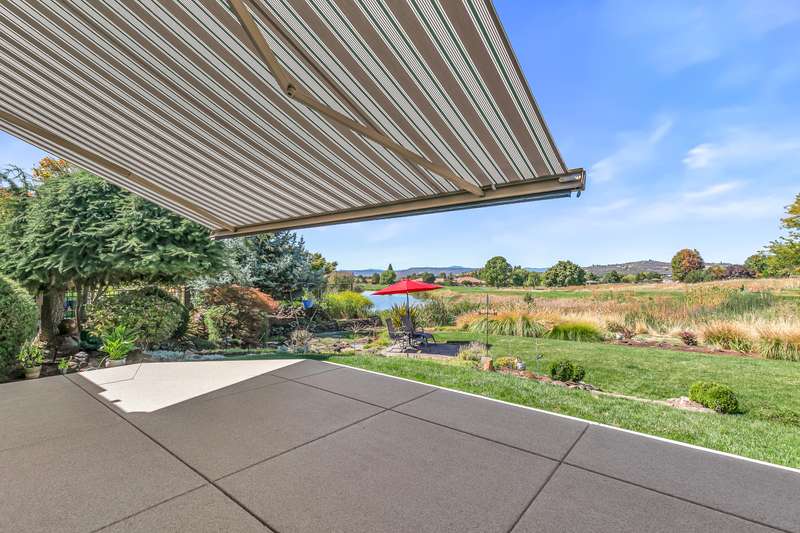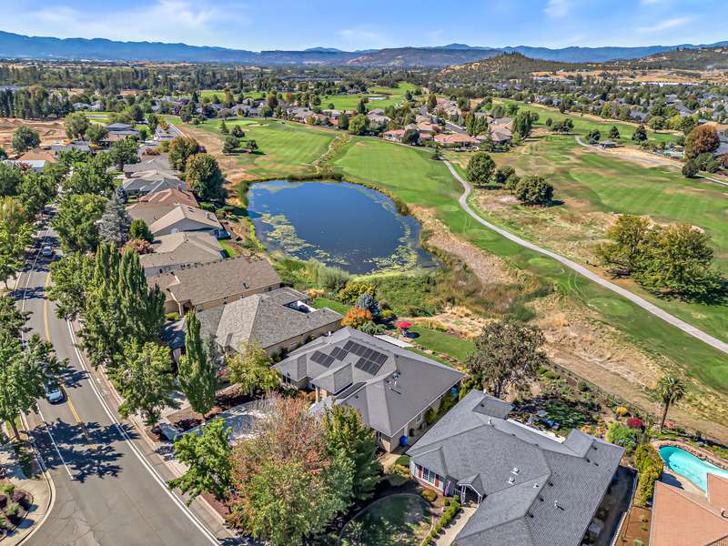 Relish breathtaking views of Eagle Point Golf Course's 5th green, 6th tee box, & serene vistas across a tranquil pond through expansive windows and French doors in this architecturally stunning contemporary home. The great room captivates with 12-foot ceilings, sleek engineered walnut floors, and custom solid cherry shelving, flowing seamlessly to a gourmet kitchen with high-end stainless-steel appliances and elegant cherry cabinets. A private office hides behind stylish French doors. This home boasts three bedrooms, including two luxurious primary suites with golf course views, one featuring a spacious tiled shower with a rejuvenating steam room, lg walk-in closet, and access to a covered patio. The third bedroom includes a versatile Murphy bed with built-in cabinetry. An extra-wide two-car garage accommodates a golf cart and workshop. High-tech lighting, a custom awning, and CAP concrete epoxy-coated patios and driveway elevate this modern masterpiece to unparalleled sophistication.