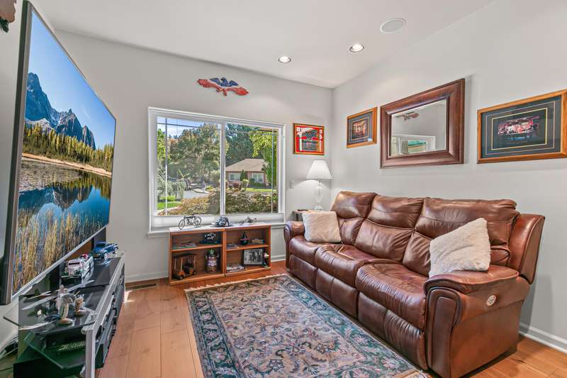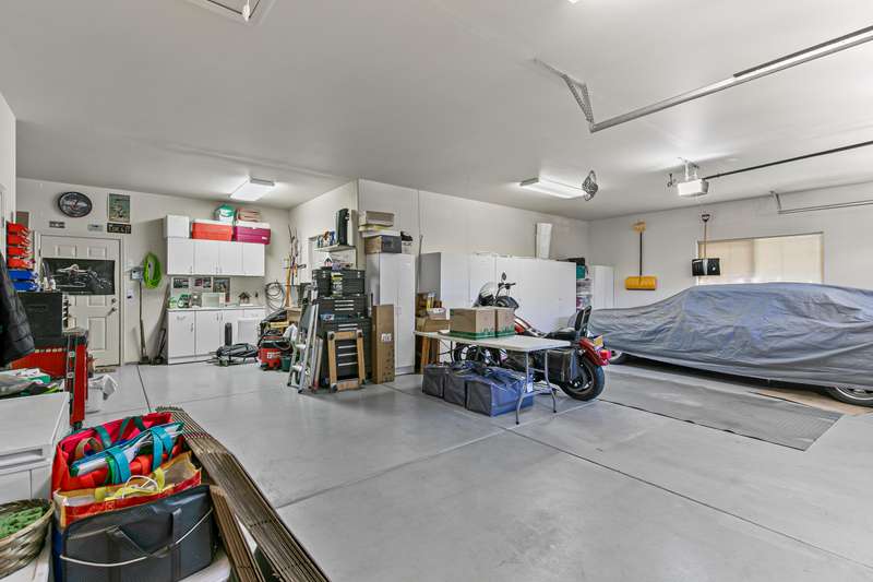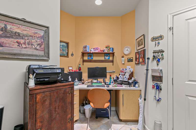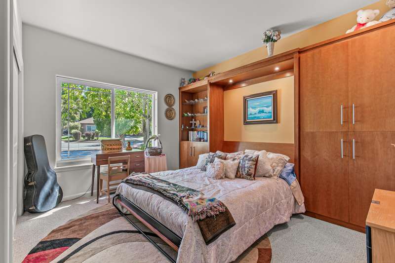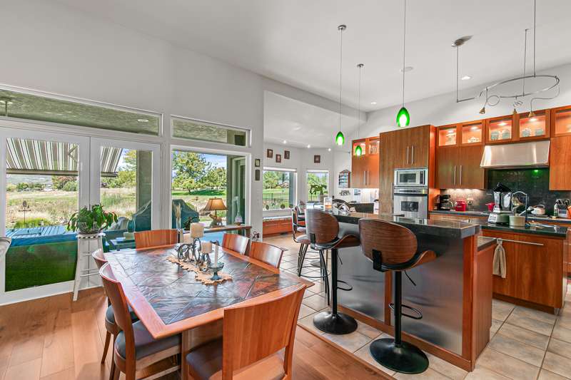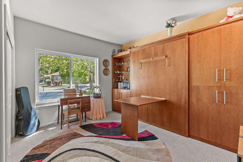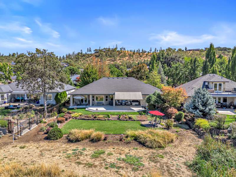 Relish breathtaking views of Eagle Point Golf Course's 5th green, 6th tee box, & serene vistas across a tranquil pond through expansive windows and French doors in this architecturally stunning contemporary home. The great room captivates with 12-foot ceilings, sleek engineered walnut floors, and custom solid cherry shelving, flowing seamlessly to a gourmet kitchen with high-end stainless-steel appliances and elegant cherry cabinets. A private office hides behind stylish French doors. This home boasts three bedrooms, including two luxurious primary suites with golf course views, one featuring a spacious tiled shower with a rejuvenating steam room, lg walk-in closet, and access to a covered patio. The third bedroom includes a versatile Murphy bed with built-in cabinetry. An extra-wide two-car garage accommodates a golf cart and workshop. High-tech lighting, a custom awning, and CAP concrete epoxy-coated patios and driveway elevate this modern masterpiece to unparalleled sophistication.