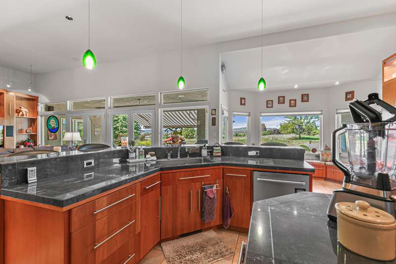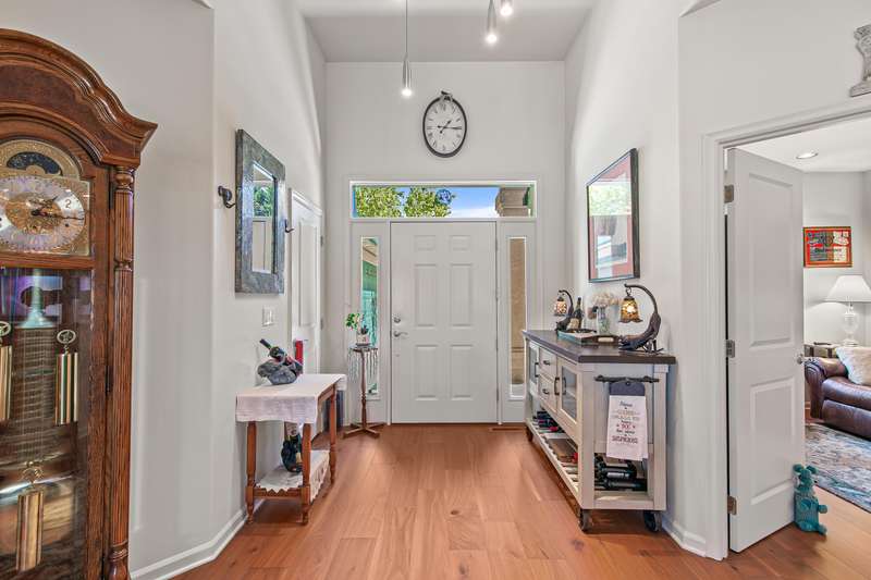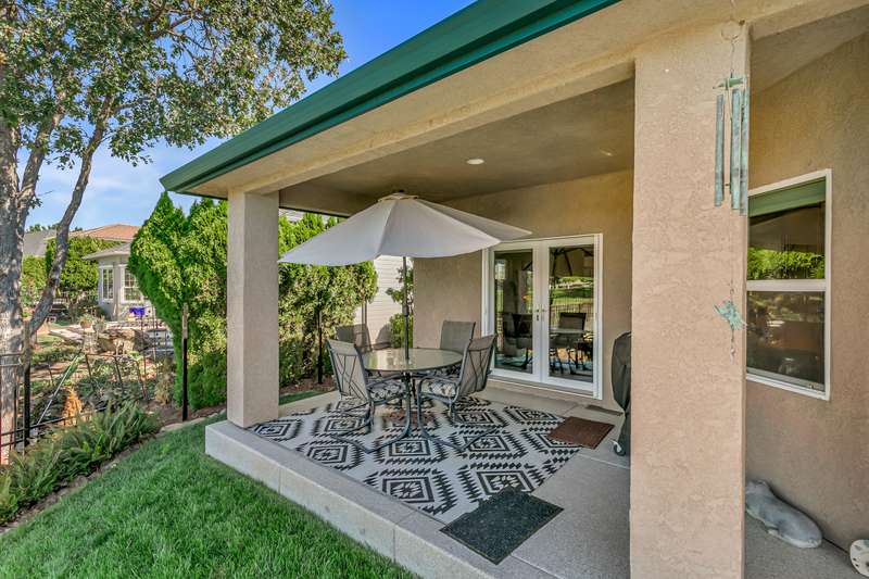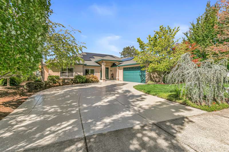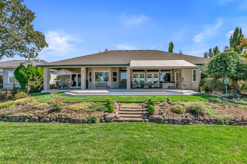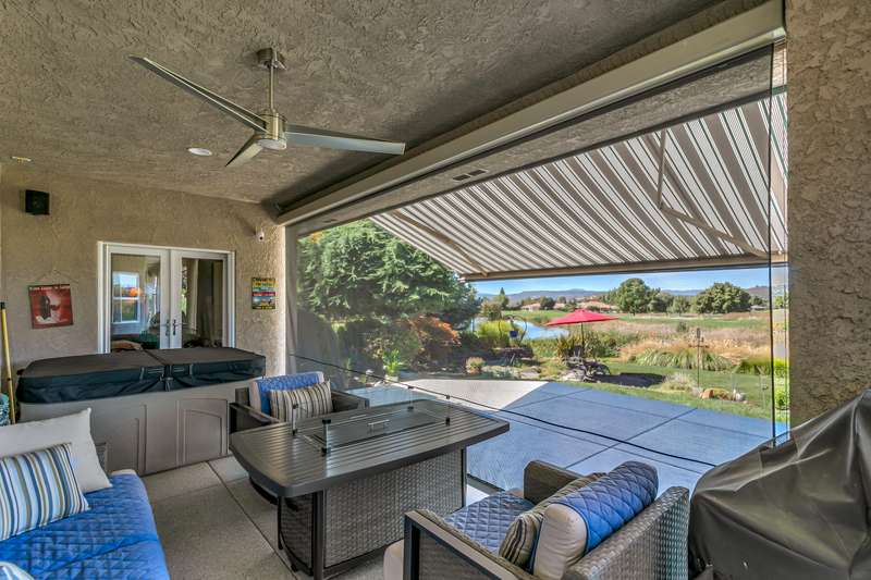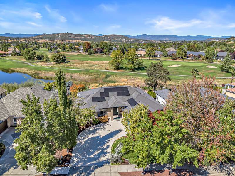 Seller is willing to pay $15,000 towards Buyer's closing costs! Relish breathtaking views of Eagle Point Golf Course's 5th green, 6th tee box, & serene vistas across a tranquil pond through expansive windows and French doors in this architecturally stunning contemporary home. The great room captivates with 12-foot ceilings, sleek engineered walnut floors, and custom solid cherry shelving, flowing seamlessly to a gourmet kitchen with high-end stainless-steel appliances and elegant cherry cabinets. A private office hides behind stylish French doors. This home boasts three bedrooms, including two luxurious primary suites with golf course views, one featuring a spacious tiled shower with a rejuvenating steam room, lg walk-in closet, and access to a covered patio. The third bedroom includes a versatile Murphy bed with built-in cabinetry. An extra-wide two-car garage accommodates a golf cart and workshop. High-tech lighting, a custom awning, and CAP concrete epoxy-coated patios and driveway