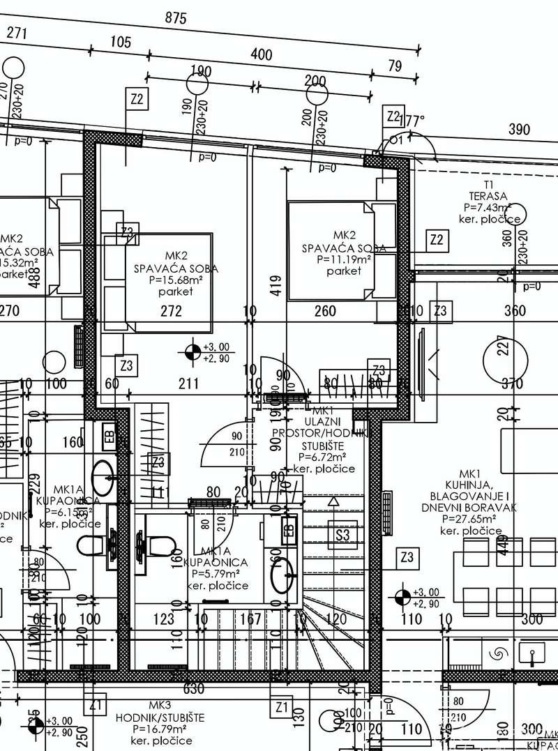 Apartment S-03 - Duplex (Ground floor + 1st floor) - living space 78.79 m2 (2 bedrooms + 2 bathrooms) + terrace (17.94 m2 x 0.2 = 3.59 m2) + garden (8.03 m2 x 0.1 = 0.80 m2) + outdoor parking PM3 (12.50 m2 x 0.2 = 2.5 m2); total net area: 85.68 m2 = 481,950 EUR