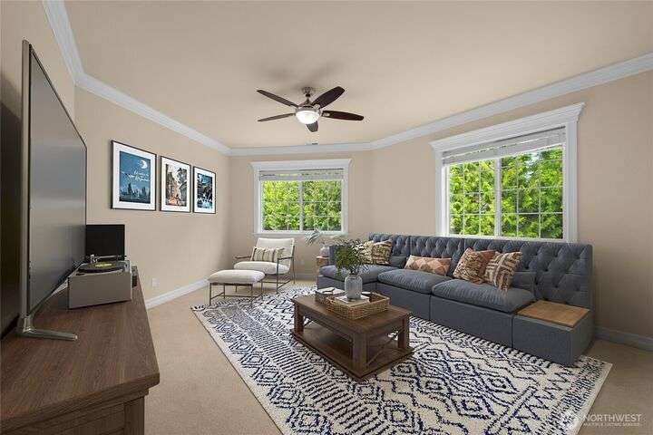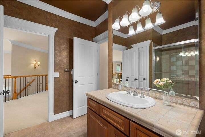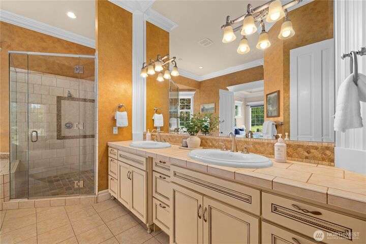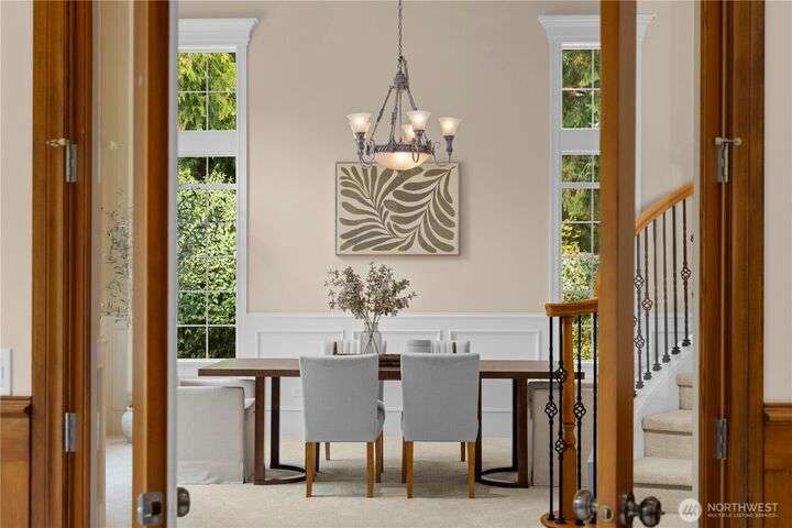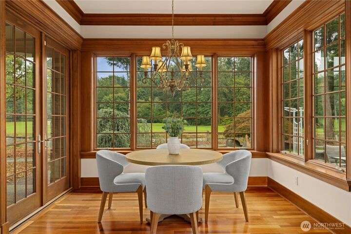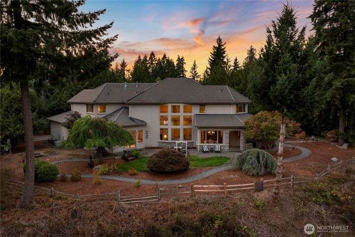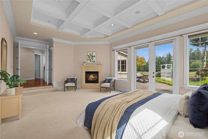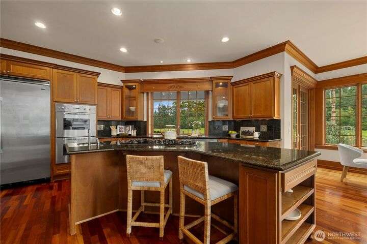 Behind the gates of Washington National Golf Club, a treelined drive leads to this former Street of Dreams home on a private half-acre overlooking the 17th fairway and reflective ponds. Beyond the patio, manicured fairways unfold against a quiet backdrop of evergreens. Inside, cherry hardwoods and crisp millwork lend warmth and elegance, while the Viking-appointed kitchen with double ovens, prep sink and wine cooler anchors gatherings. The main-floor primary suite offers a cozy fireplace, coffered ceilings and a spa-inspired bath. Upstairs, 3 en-suite bedrooms, a large bonus room, and dual staircases add versatility, complemented by a 3-car garage with golf cart bay. Here, craftsmanship and setting define a lifestyle both rare and refined.