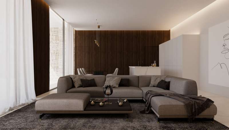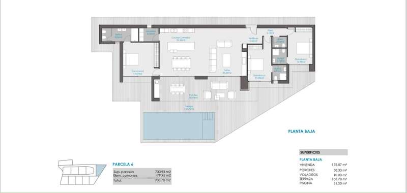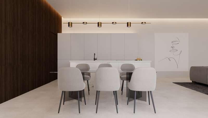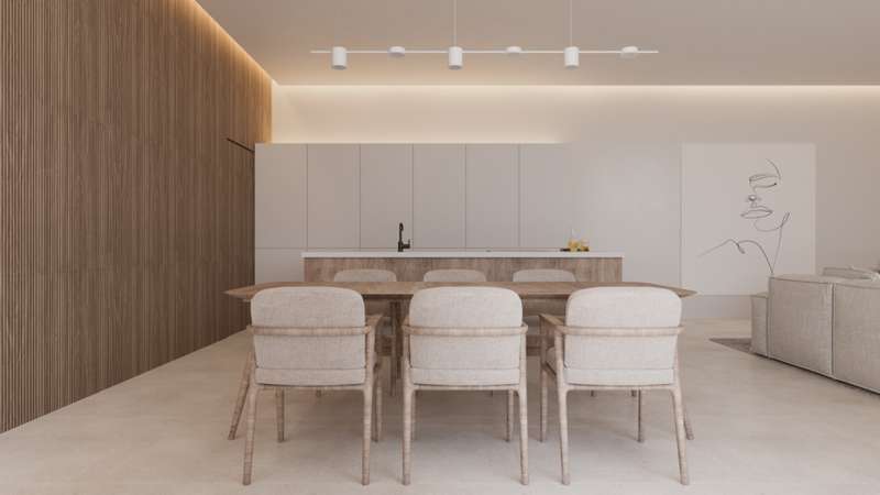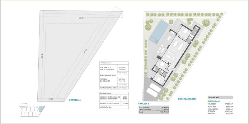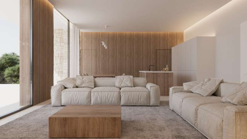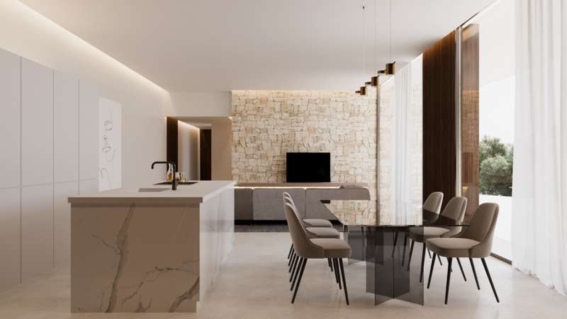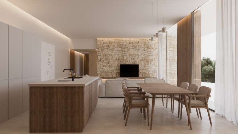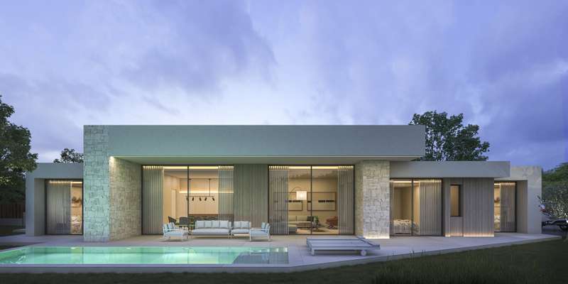 PARCELA 6. Exclusive modern villa project located in a private residential between the beach of Las Rotas and the foothills of the Montgó, in Dénia (Alicante), a short distance from the marina and all essential services. The residential complex is conceived as a unique set consisting of 7 different architectural models, unified under the same concept of avant-garde design and the use of materials that are naturally integrated into the environment. The house is comfortably distributed on one floor and includes a spacious living/dining room with open kitchen, laundry area, three double bedrooms with en suite bathroom, courtesy toilet and covered terrace next to the living room with direct access to the pool and the garden. The kitchen, of the Santos brand, is delivered equipped with induction plate, integrated extractor hood, osmosis equipment, fridge, freezer, oven and microwave. Outside, there is a saline pool with pre-installation of heating, Mediterranean style garden with autochthonous vegetation and automatic irrigation, perimeter seto for greater privacy and pergola for two vehicles with metal structure and covering canvas. The qualities have been carefully selected to ensure maximum comfort: underfloor heating, air conditioning through heat pumps, 3kw photovoltaic installation and domotic system to control lighting, air conditioning and motorized curtains, also in remote. The exterior carpentry will be of minimalist aluminum with thermal bridge breakage and double glazing Guardian Sun with air chamber and safety foil, with oscillating opening. The main facade will be delimited by a reinforced concrete wall with landscaped areas, metallic fence and 4 metre automatic door with dual pedestrian and vehicle access system.