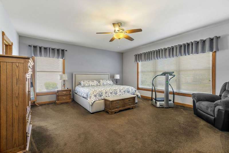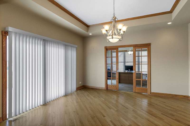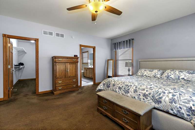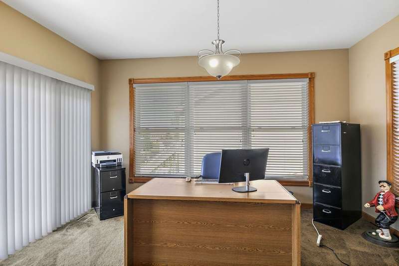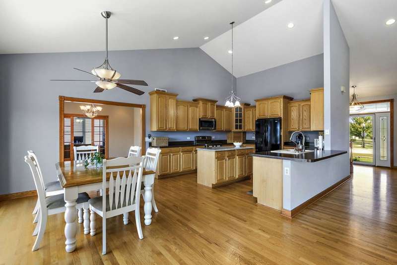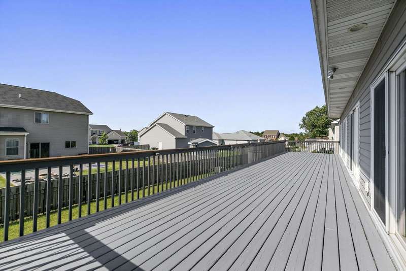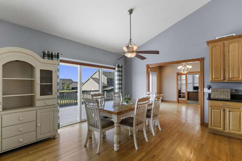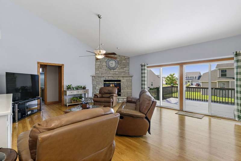 This stunning ranch home features 3 bedrooms, 2.5 baths, a spacious 3-car garage, and a full lookout basement that will truly impress. The versatile flex room-currently used as an office-could easily serve as a 4th bedroom, complete with elegant pocket doors. Gleaming hardwood floors flow throughout, and the great room boasts vaulted ceilings for an airy, open feel. The kitchen is a chef's delight, offering a center island, 36-inch cabinets, and ample counter space. Along the south side, four sliding doors flood the interior with natural light and lead out to a massive 62-foot deck-perfect for backyard entertaining. Professionally landscaped grounds create a picture-perfect setting, complete with a storage shed for all your outdoor tools. Solar panels provide energy efficiency and help keep electric bills low. The three car garage is gas heated. The air conditioning and furnace were replaced in October, 2022 and have 10 year warranties. The hot water heater was replaced in May, 2018. Make sure you check out the tax benefits you receive from having the solar panels!!