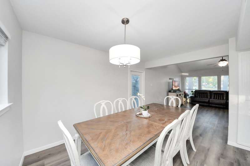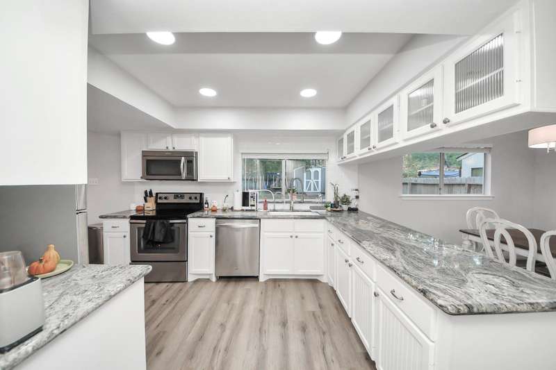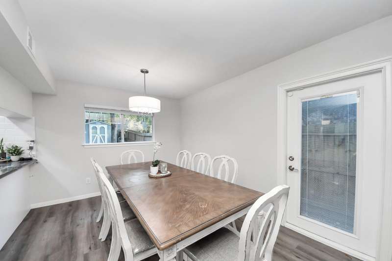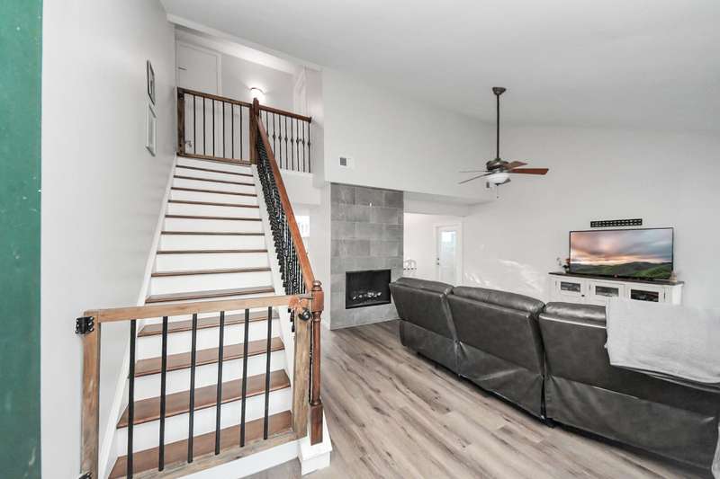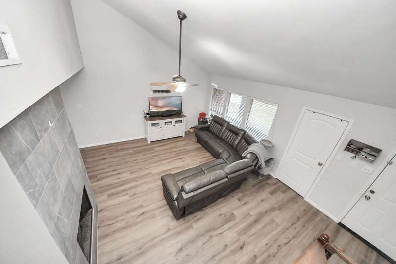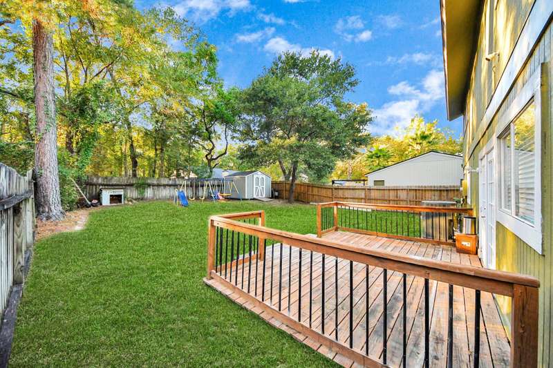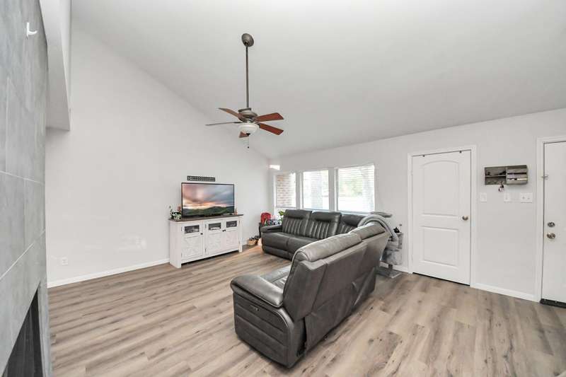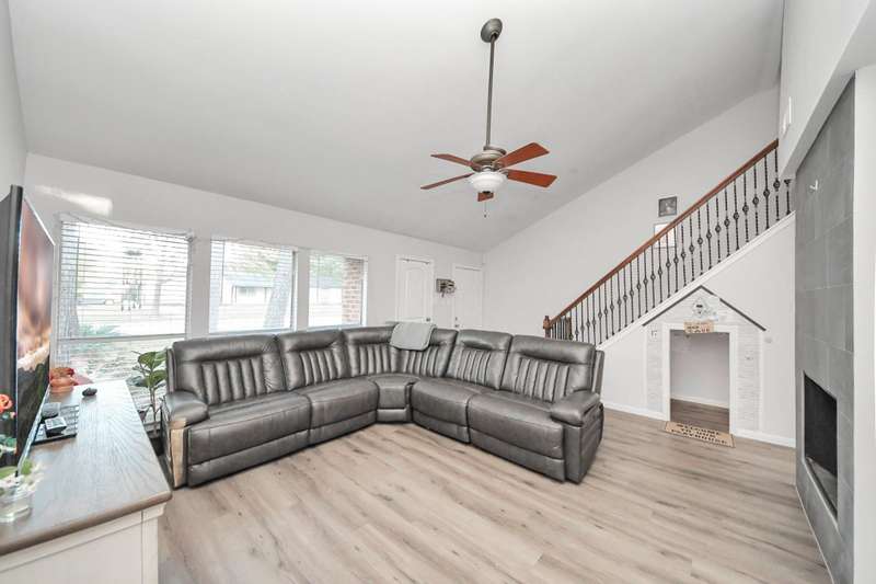 Beautifully home located in Grogan’s Mill, The Woodlands, TX! Step inside to soaring vaulted ceilings and wide luxury vinyl plank wood flooring that spans the entire first floor, creating a warm and elegant feel. Large windows fill the home with natural light, complemented by new 2" cordless blinds throughout. Enjoy a cozy evening by the gas fireplace, highlighted by stunning tile detail. The kitchen is a showstopper with crisp white cabinets, classic subway tile backsplash, and matching stainless steel appliances. The staircase features newly installed oak treads and a custom hand railing. Every light fixture has been replaced, adding a modern touch throughout. Both the interior and exterior were freshly painted in 2021. Step outside to your private backyard oasis with a wooden deck, perfect for entertaining or relaxing. Ideally located in the heart of The Woodlands, close to premier shopping, dining, parks, pools, and scenic nature trails.
