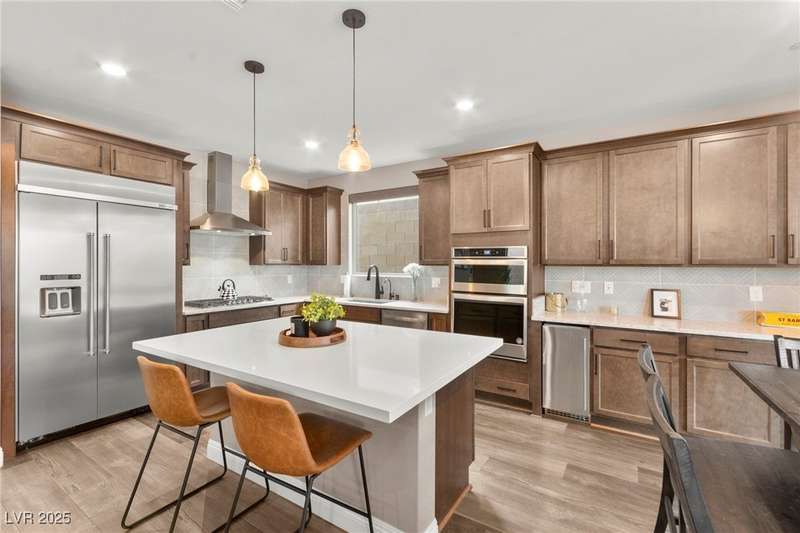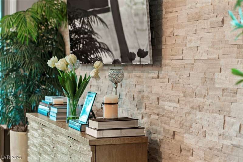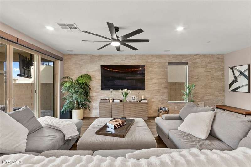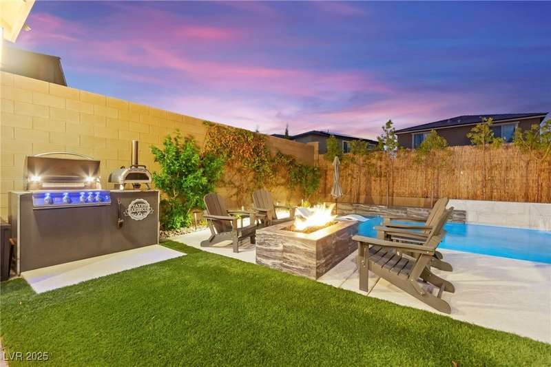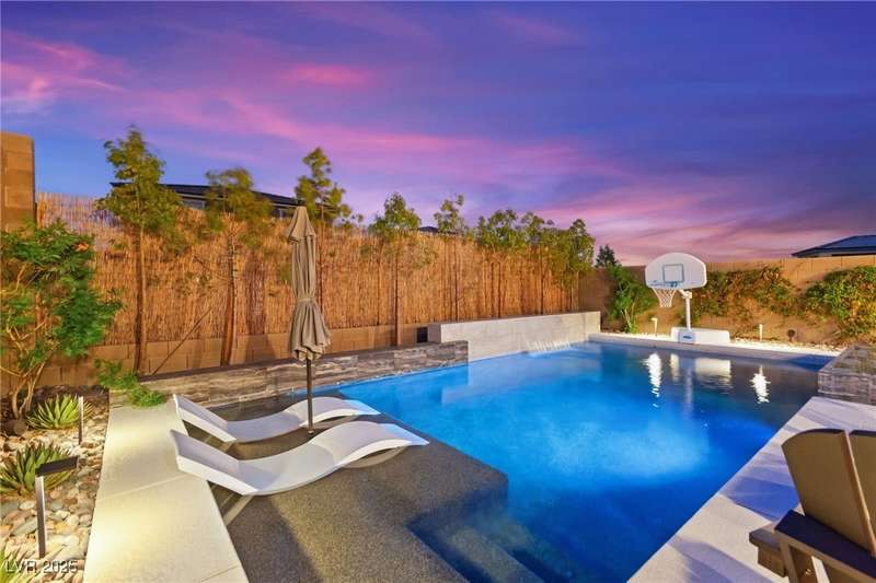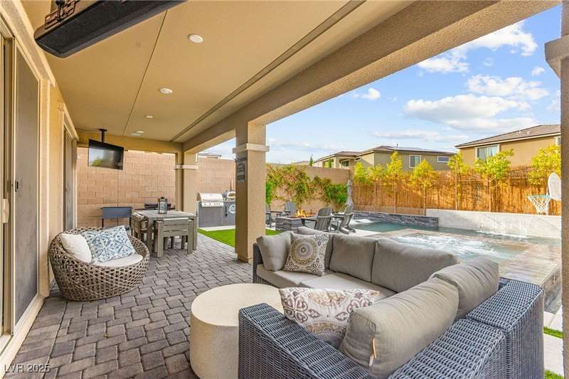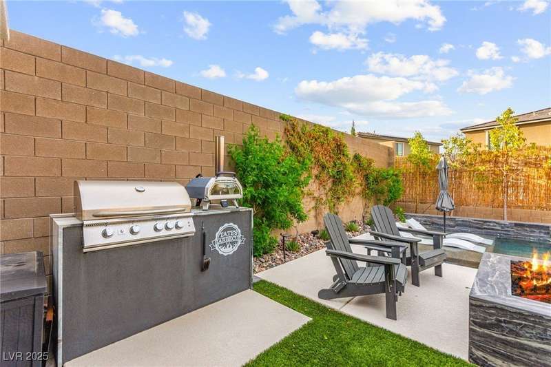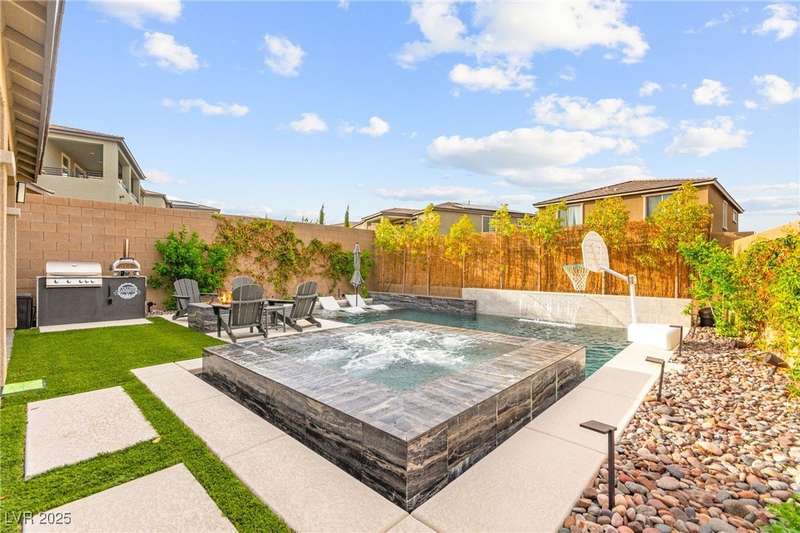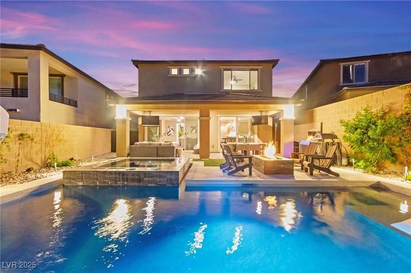 Step into this beautifully upgraded 4-bedroom, 3-bath West Summerlin home, where luxury and comfort meet. The chef’s kitchen is a showstopper, featuring a Sub-Zero fridge, custom ice maker, wine fridge, extended cabinetry, and a generously sized island—perfect for everyday living and entertaining. Light-filled, open spaces are highlighted by LVP flooring, designer window treatments, surround sound, and a striking stone feature wall in the living room. The spacious primary suite includes a custom walk-in closet with built-ins, while dual sliding doors open to a backyard oasis with full-length power shades, sparkling pool with wet lounge deck, elevated spa with water feature, fire pit, and a fully equipped outdoor kitchen. The covered patio with dual TVs is ideal for relaxing or hosting. Additional touches include meticulous landscaping and a dog run with turf, dual gates, and doggie door—every detail designed for comfort and style.