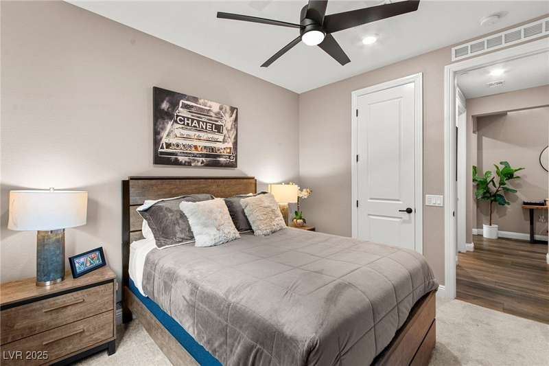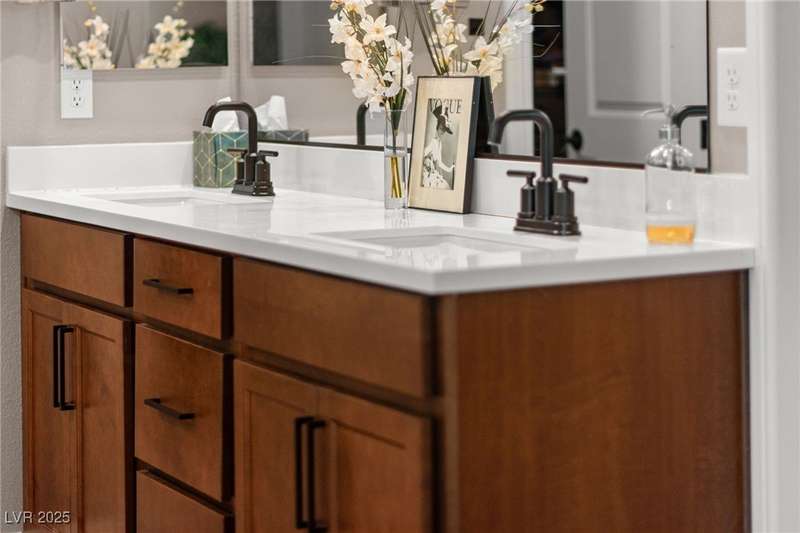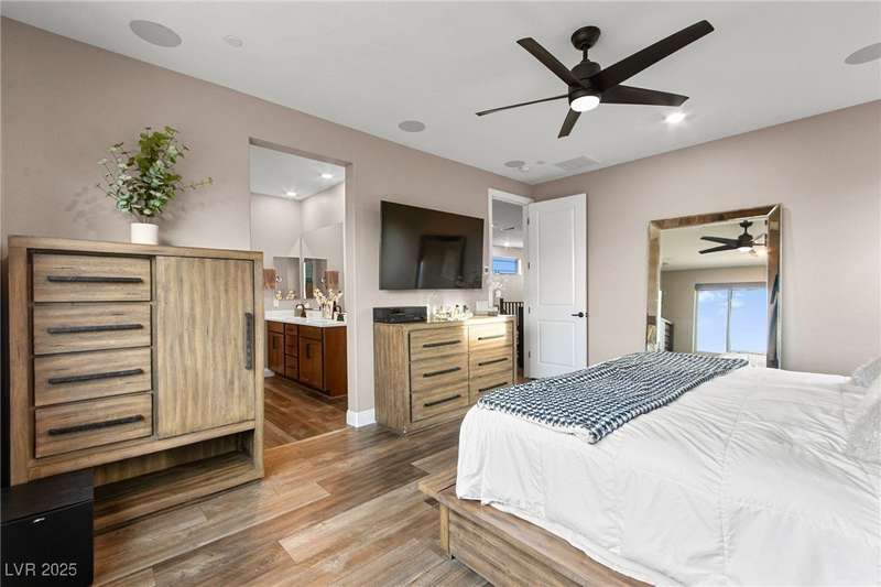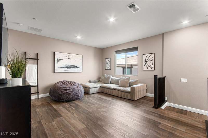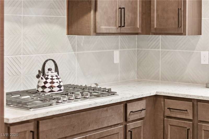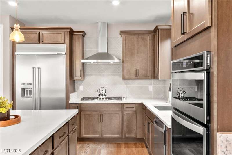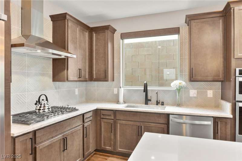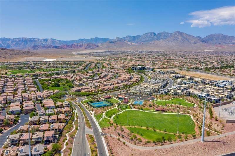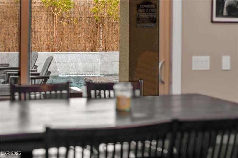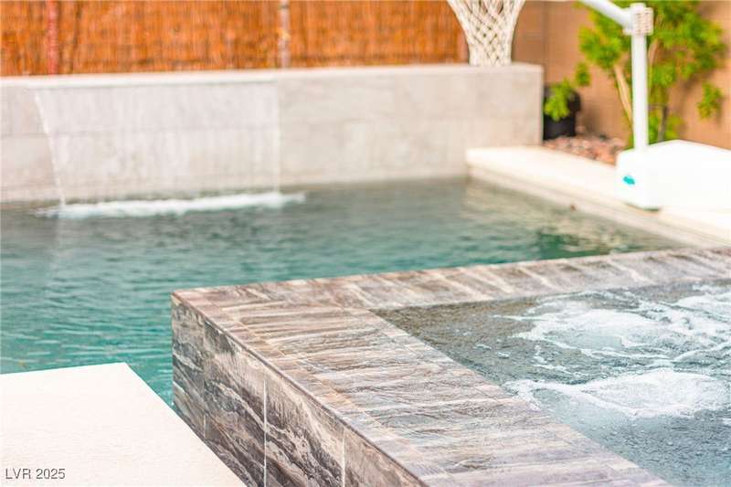 Step into this beautifully upgraded 4-bedroom, 3-bath West Summerlin home, where luxury and comfort meet. The chef’s kitchen is a showstopper, featuring a Sub-Zero fridge, custom ice maker, wine fridge, extended cabinetry, and a generously sized island—perfect for everyday living and entertaining. Light-filled, open spaces are highlighted by LVP flooring, designer window treatments, surround sound, and a striking stone feature wall in the living room. The spacious primary suite includes a custom walk-in closet with built-ins, while dual sliding doors open to a backyard oasis with full-length power shades, sparkling pool with wet lounge deck, elevated spa with water feature, fire pit, and a fully equipped outdoor kitchen. The covered patio with dual TVs is ideal for relaxing or hosting. Additional touches include meticulous landscaping and a dog run with turf, dual gates, and doggie door—every detail designed for comfort and style.
