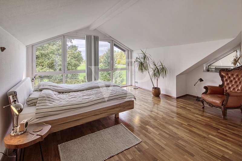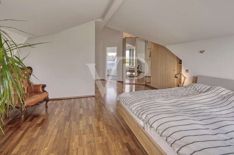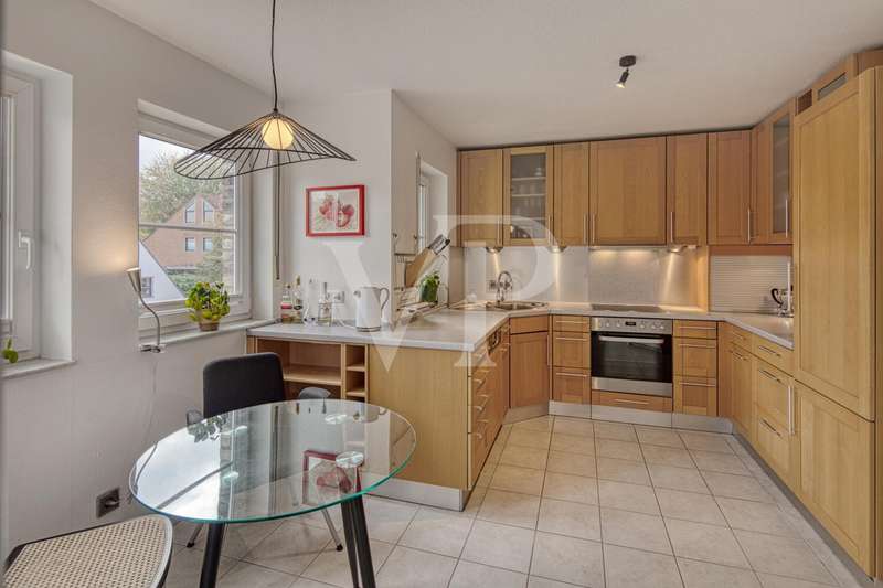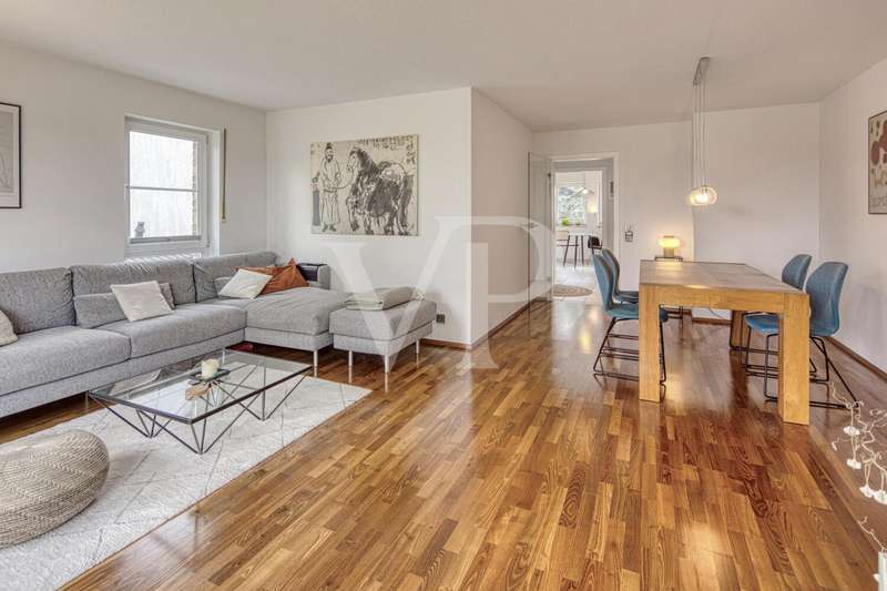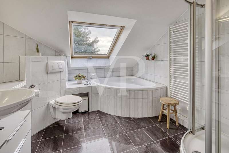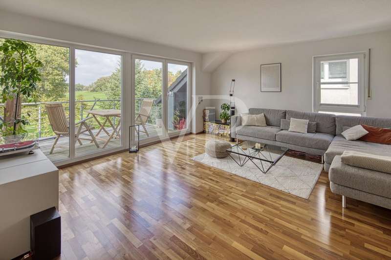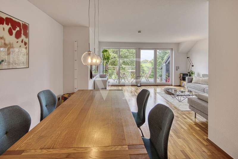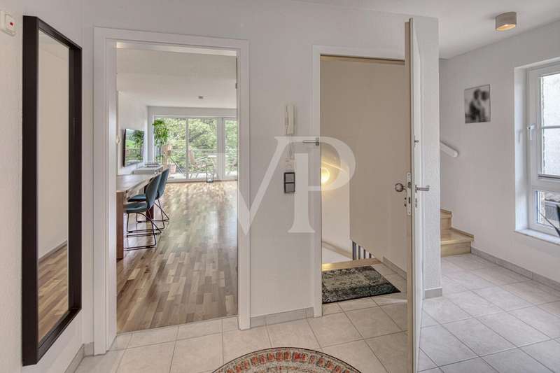 This spacious maisonette apartment, built in 2001, is located in a well-kept two-family house and impresses with its well thought-out room layout and high-quality furnishings. With a living space of approx. 98 m² and a total of three rooms, the property offers excellent conditions for both couples and small families looking for a comfortable home in an appealing ambience. The apartment extends over two levels and its open-plan design creates a pleasant feeling of living. On the lower level, you will find a spacious dining/living room that is flooded with light thanks to the floor-to-ceiling windows. The large windows have electric shutters. From here, you have direct access to the spacious balcony, which is ideal for relaxing in the fresh air and offers an exceptional view of the greenery. The kitchen is equipped with a real wood fitted kitchen and an adjoining storage room. There is also a utility room in the apartment, where you can also connect the washing machine. The well-designed floor plan offers a wide range of furnishing options. Another highlight are the two full daylight bathrooms. The larger bathroom is equipped with a corner bathtub, a shower and an electric towel warmer and is located upstairs, while the second bathroom downstairs has a level-access shower. Both bathrooms are in very good condition and reflect the high standard of fittings in the apartment. There are two rooms in the upper area of the maisonette. A large bedroom with fitted wardrobes and a small children's room or possibly a study, which offer ideal retreats thanks to their quiet location. The rooms are fitted with high-quality parquet flooring, which creates a warm living atmosphere. Most of the windows have roller shutters. An additional cellar room is available for storage and expands the storage space for a wide range of needs. Comfort is a top priority in this property: The apartment is fully equipped with modern underfloor heating, which ensures pleasant temperatures in all rooms. Particularly noteworthy is the new gas heating system, which was only installed in September 2023 and thus ensures modern and energy-efficient operation. A parking space directly in front of the building provides convenient parking and rounds off the offer. Overall, the shared house is in an extremely well-kept condition. This offer is aimed at prospective buyers who are looking for a well-kept maisonette apartment with high-quality furnishings, an impressive room layout and a wonderful panoramic view. Come and see the benefits of this property for yourself during a viewing and arrange an appointment with us.