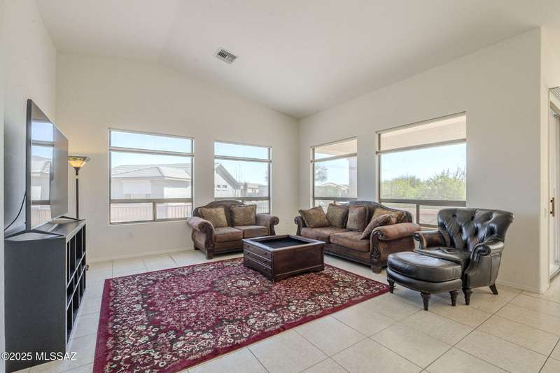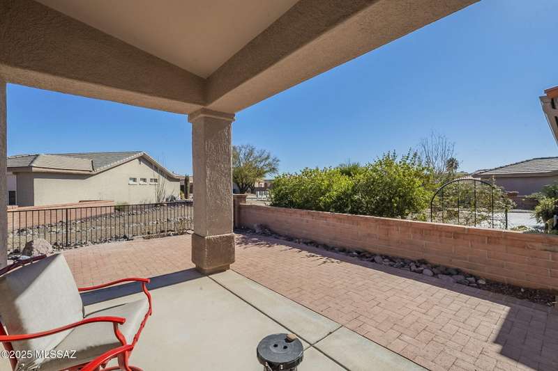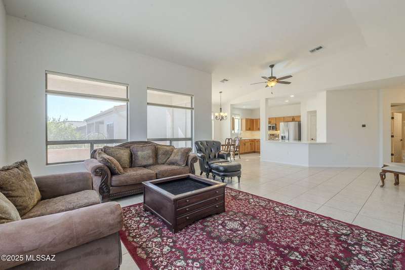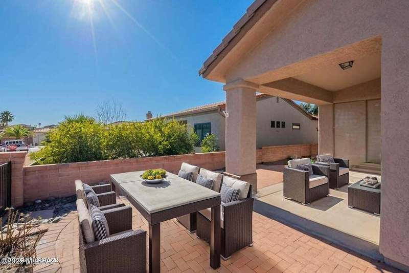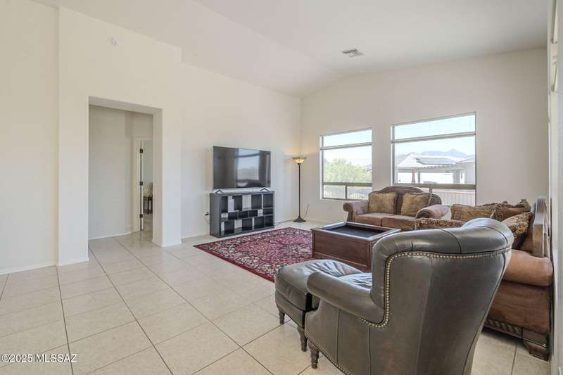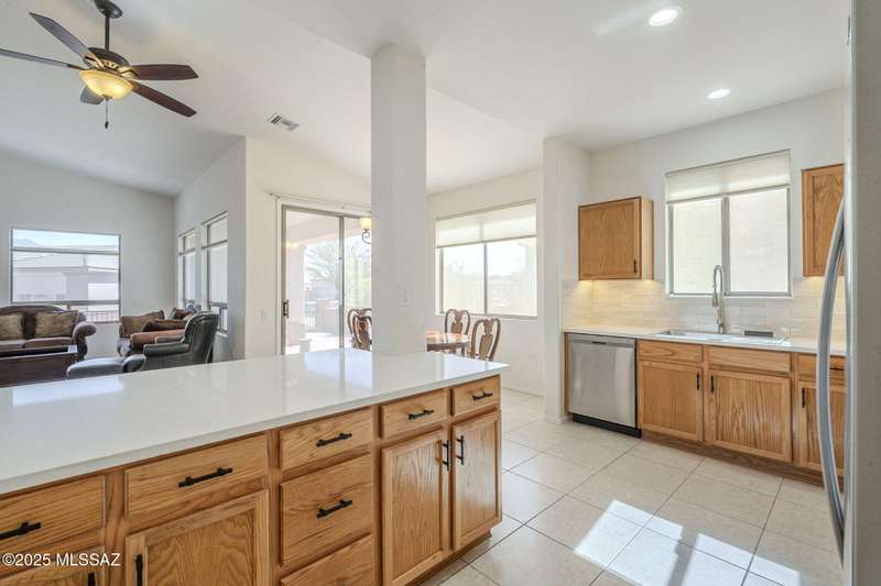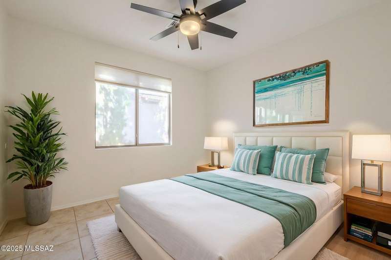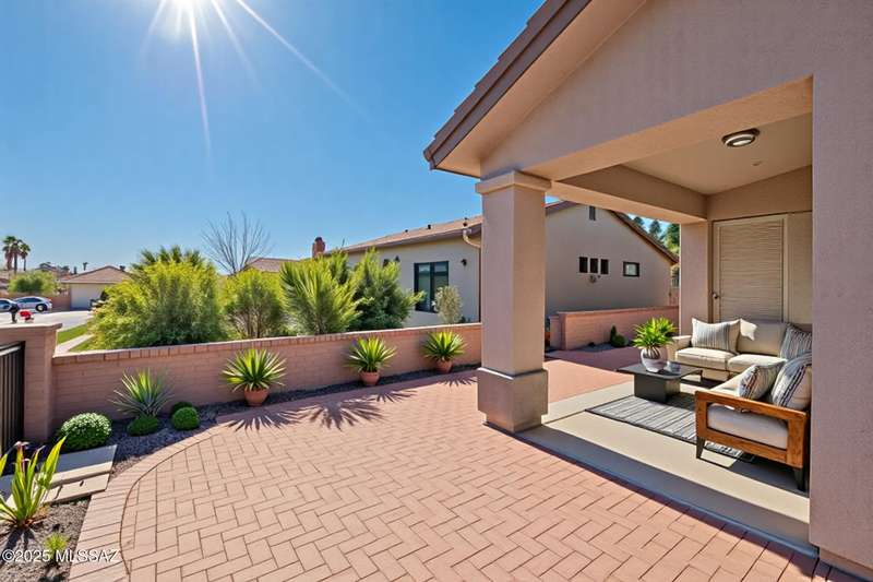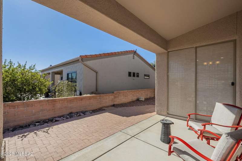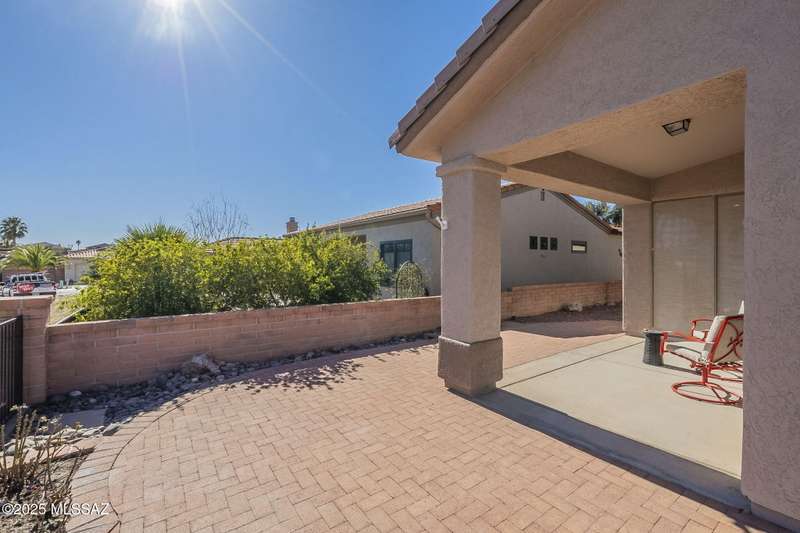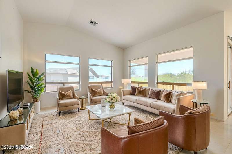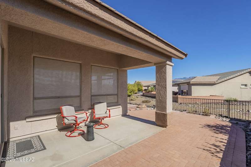 Welcome home to this beautifully updated 2-bed, 2-bath, 1,684 sq ft split floor plan w/ a versatile den ideal for an office, hobbies, or quiet retreat. Oversized windows & soaring cathedral ceilings fill the home w/ natural light, creating a bright, airy vibe. The open layout features neutral tile flooring, fresh interior/exterior paint & smart built-in storage throughout. The kitchen shines w/ a sleek one-level quartz island, subway tile backsplash, SS appliances & ample pantry space. Bathrooms add Southwest charm w/ hammered copper sinks & custom epoxy counters. Energy-efficient upgrades include full-house solar screens, 48'' blown-in insulation & new roof underlayment (2021). Quiet location w/ peek-a-boo mountain views.