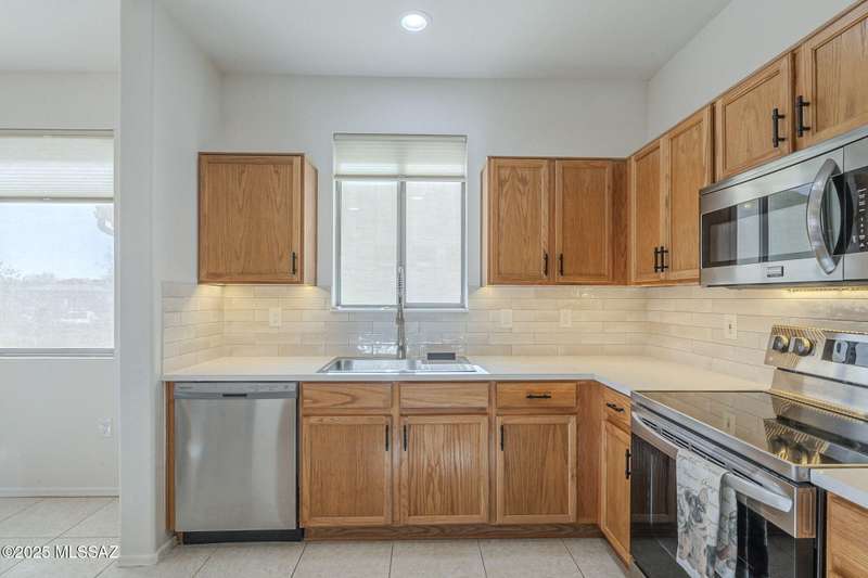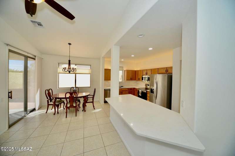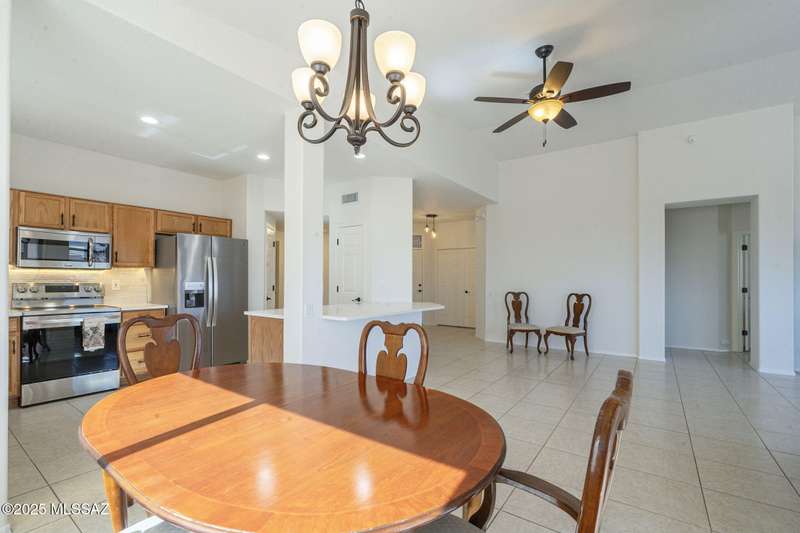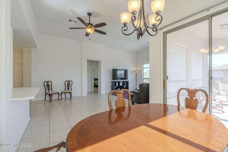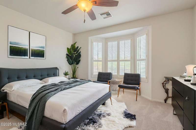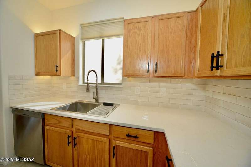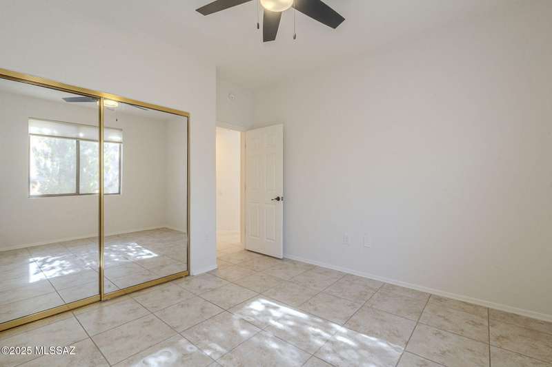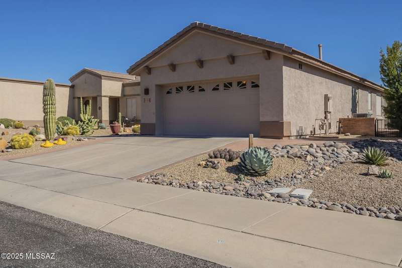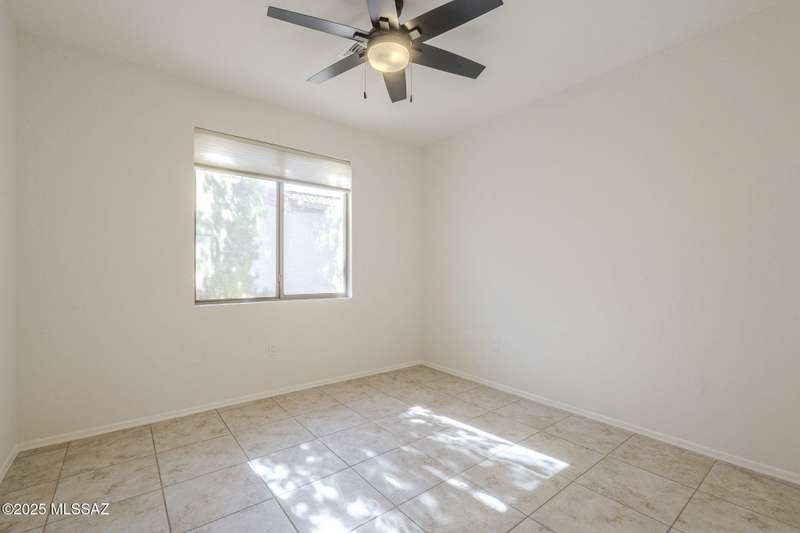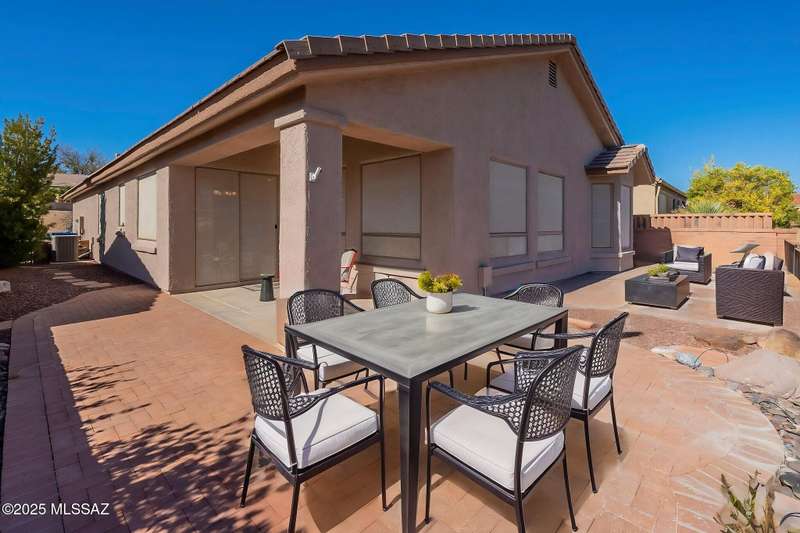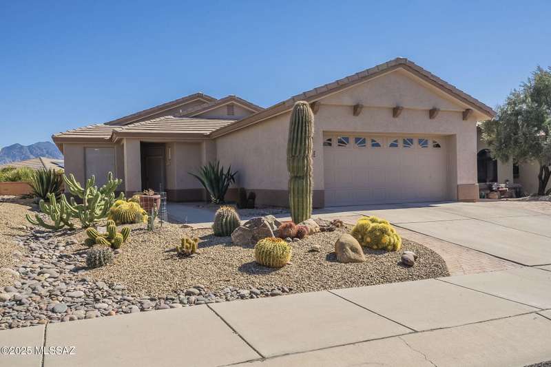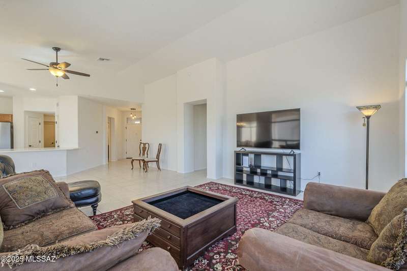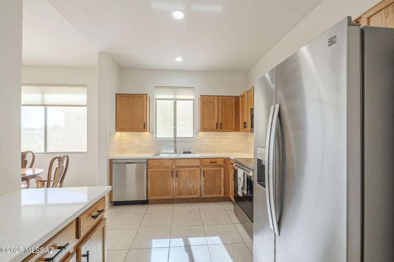 Welcome home to this beautifully updated 2-bed, 2-bath, 1,684 sq ft split floor plan w/ a versatile den ideal for an office, hobbies, or quiet retreat. Oversized windows & soaring cathedral ceilings fill the home w/ natural light, creating a bright, airy vibe. The open layout features neutral tile flooring, fresh interior/exterior paint & smart built-in storage throughout. The kitchen shines w/ a sleek one-level quartz island, subway tile backsplash, SS appliances & ample pantry space. Bathrooms add Southwest charm w/ hammered copper sinks & custom epoxy counters. Energy-efficient upgrades include full-house solar screens, 48'' blown-in insulation & new roof underlayment (2021). Quiet location w/ peek-a-boo mountain views.