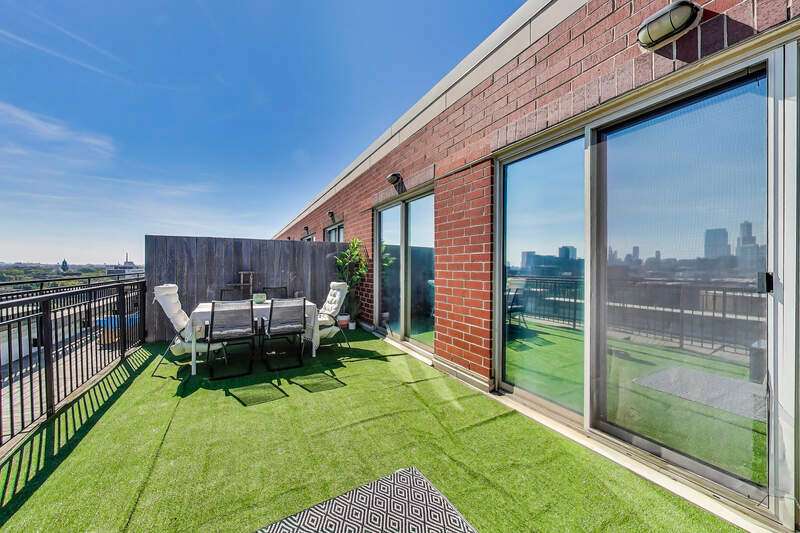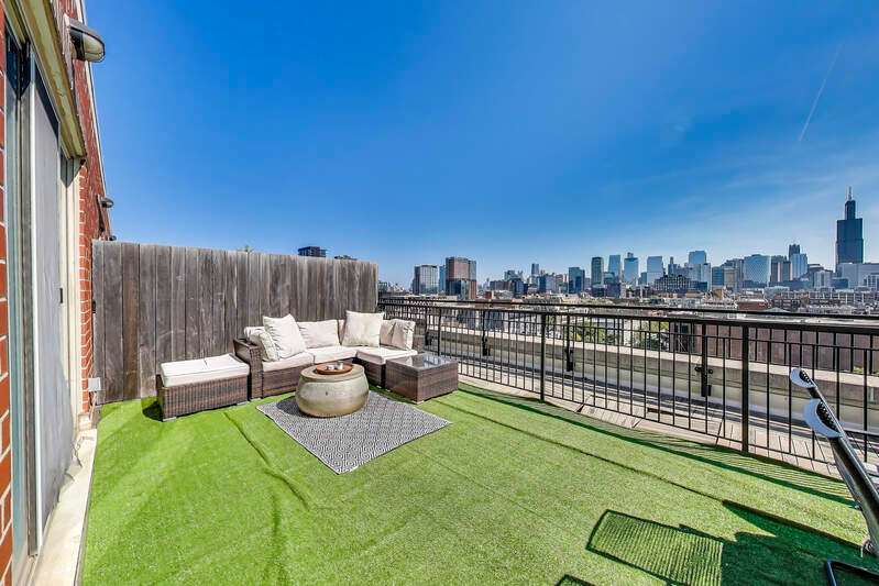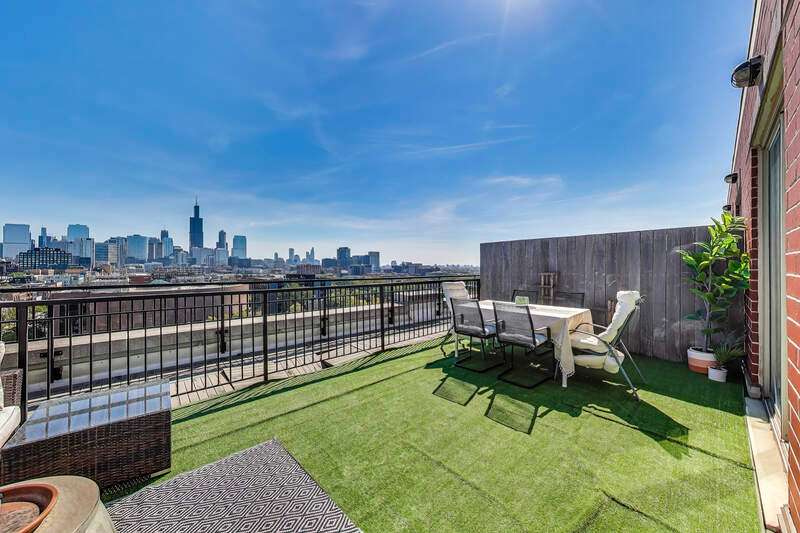 Absolutely stunning duplex-up penthouse with upgrades throughout and the best views of the city! This 3 bed/3 bath unit also includes 2 parking spaces & 2 private outdoor spaces including a rooftop deck. The main level has a brand new kitchen that has been upgraded from top to bottom with all new cabinetry, appliances, light fixtures, and gorgeous new countertops. The open floor plan flows straight from the kitchen into an enormous, extra wide living/dining space with a private outdoor terrace perfect for grilling! The full bath on the main level has new vanity, mirror, light fixtures, and toilet. One full bedroom with brand new built out closet, light fixture, and custom made door along with a full laundry room & extra large closet complete the first level of this home. Upstairs are two full bedrooms with two full bathrooms, an extra large recently built out storage closet, and huge private rooftop deck with incredible views of the skyline. The primary bedroom comfortably fits a king size bed with nightstands & dresser and the attached ensuite bathroom has been fully renovated to provide a 5 star spa-like experience. The second bedroom on the top level is very spacious as well and is perfect for a nursery, home office, or guest suite with it's own full bathroom. Overall, this is a one-of-a-kind home that has been carefully crafted to fit even the most discerning buyer's needs! Perfectly located on a quiet side street, yet right around the corner from the best shopping, eating, and nightlife Chicago has to offer in the West Loop!