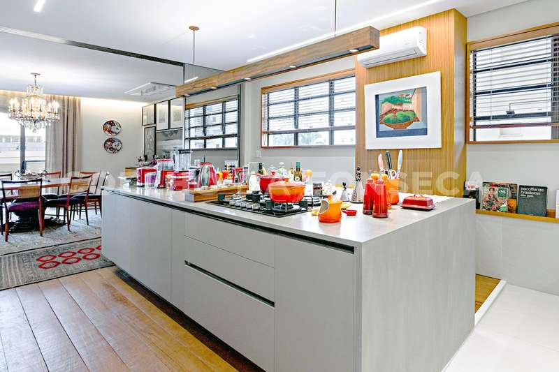 Cozinha moderna e funcional, equipada com ilha e repleta de armários planejados, integrada ao living, facilitando a interação durante o preparo de refeições.