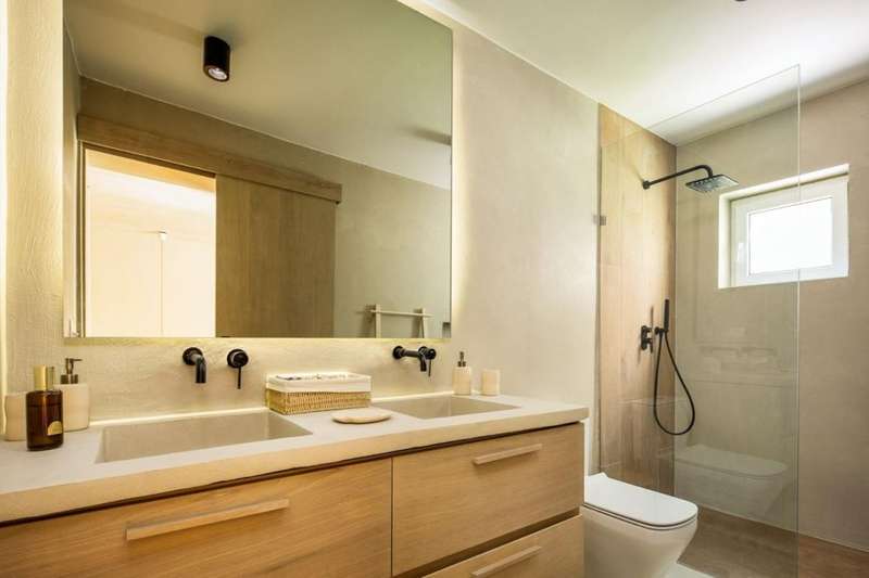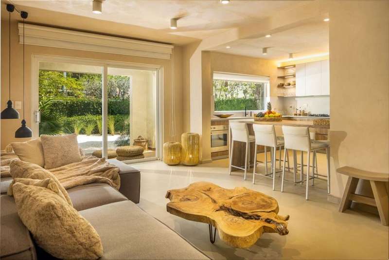 The fully air-conditioned living area has a fully equipped kitchen and a bar seating 6 on the island and opens towards a covered terrace and garden.