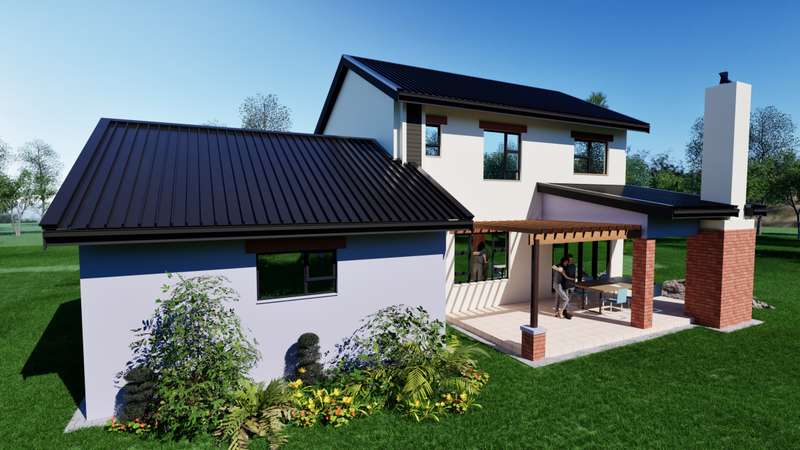 This double-storey building package offers a stylish and functional design ideal for modern living. Ground floor: The open-plan kitchen and living area provide a spacious environment for family life and entertaining. A guest toilet adds convenience, while the living space extends to a covered patio with built-in braai, perfect for outdoor dining and relaxation. First floor: The upper level features two bedrooms. The main bedroom includes a private en-suite bathroom, ensuring comfort and privacy. This building package combines contemporary design with practicality, making it the perfect home for small families or couples. Don't miss out on this opportunity, call us today!