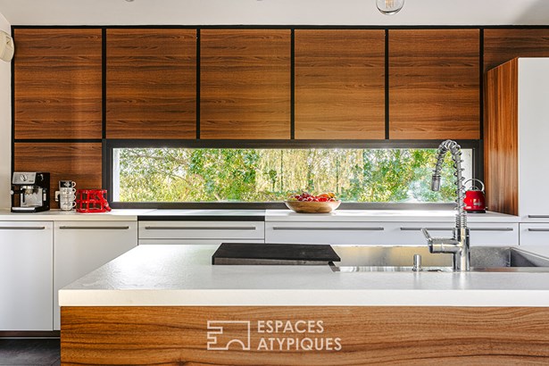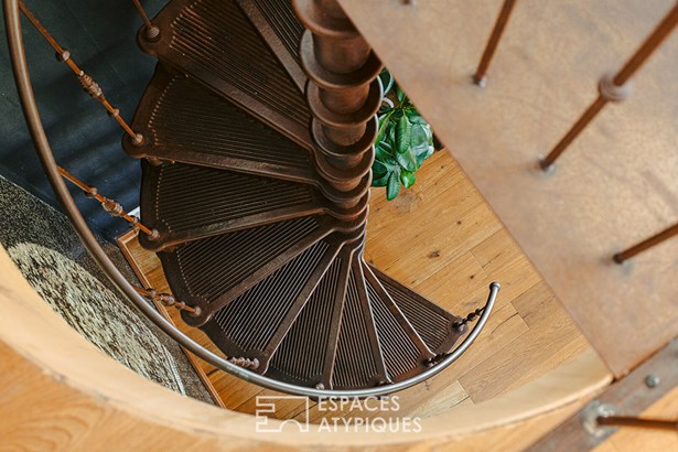 The entrance is on the living room space, an extension on one side of the living room and the kitchen. This first room accommodates a wrought iron staircase creating a unique decorative element in the house. The large modern kitchen benefits from a triple exposure and an opening onto the terrace intended for summer lunches or moments of relaxation in the spa. The living room, a real cocooning space of the house, also benefits from large through openings offering a contemplative picture of the 4 seasons.