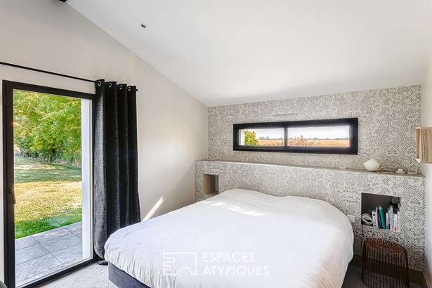 The plunging view into the marsh is just as spectacular. For guests, an independent gite of nearly 95 m2, will accommodate guests, rental projects or work spaces with a living room, an open kitchen, a lounge with bright bays and two bedrooms with shared bathroom. The property is also distinguished by its carefully designed outdoor space: a terrace with spa for moments of relaxation and the possibility of adding a swimming pool in the future.