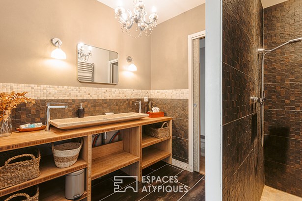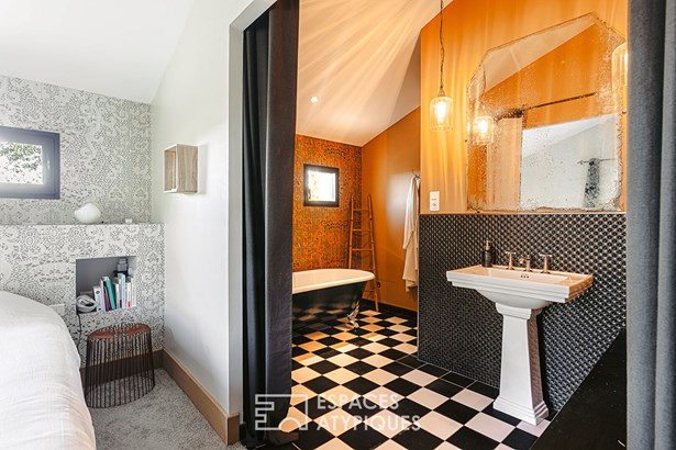 The suspended stove brings a designer and warm touch to the whole. In the last space of the ground floor, the master suite with dressing room and Art Deco bathroom preserves the couple's privacy. The upper floor benefits from comfortable and individual spaces by levels with two bedrooms, a landing, storage and a pleasant bathroom.