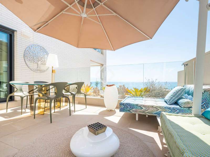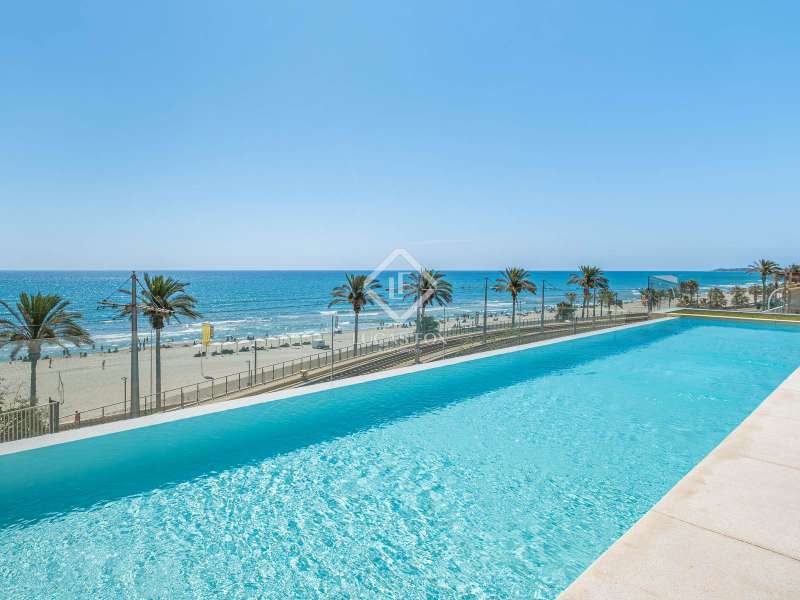 This contemporary coastal residence offers a rare combination of sleek design, cutting-edge technology, and the calm of living directly by the sea. Set in a quiet residential neighbourhood, the home enjoys an unbeatable location just steps from the beach. From here, everyday essentials such as supermarkets, pharmacies, shops, and even a tram stop connecting with both Alicante and Benidorm are within easy walking distance. The development itself is intimate, with only 24 apartments, ensuring privacy and an exclusive atmosphere. The apartment is technically classed as a ground floor unit but sits at the height of a first floor, offering 110 m² of built space (98 m² of interiors) carefully designed to maximize light and comfort. A spacious living room opens directly onto a covered 10 m² terrace for relaxing under the awning and enjoying uninterrupted views of the sea. In addition, a larger 20 m² open-air terrace has been designed as a chill-out zone, which is perfect for entertaining friends, hosting dinners, or simply soaking up the Mediterranean sun. Inside, the open-plan kitchen comes fully fitted with premium Bosch appliances, while a separate laundry area provides added convenience with washing machine, dryer, and water heater. The sleeping area includes a welcoming guest bedroom with fitted wardrobes and a generous master suite complete with its own bathroom and built-in storage. A second full bathroom serves the rest of the home. Comfort is assured with underfloor heating throughout, ducted air conditioning, and motorized blinds on every window. The property is fully equipped with an advanced smart-home system, allowing you to control lighting, climate, blinds, and hot water from your mobile phone. Security has also been thoughtfully integrated with a video surveillance system. Two private parking spaces and a storage room are included in the price. (Furniture is not included, but the property can be purchased fully furnished by separate arrangement.) Residents also enjoy beautifully landscaped Mediterranean gardens, a fully equipped fitness centre, a modern coworking lounge, and a spectacular infinity pool that seems to flow directly into the sea. Please contact us for further information.