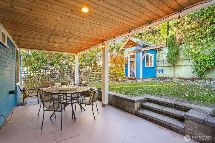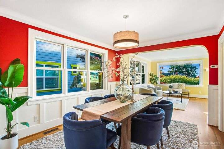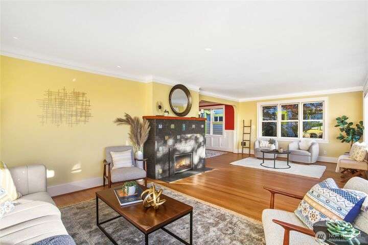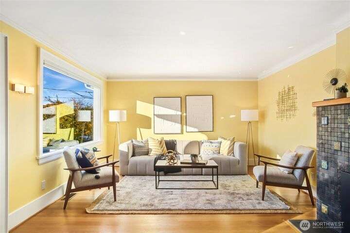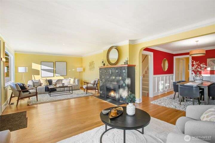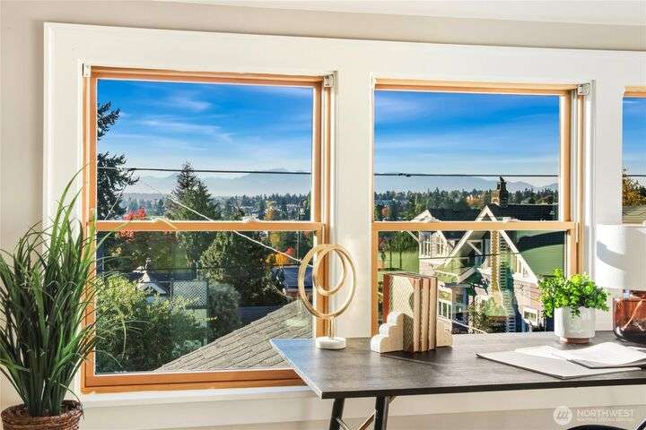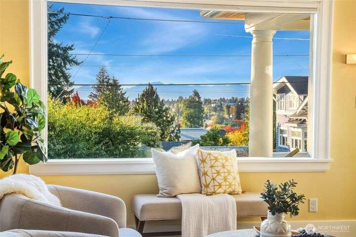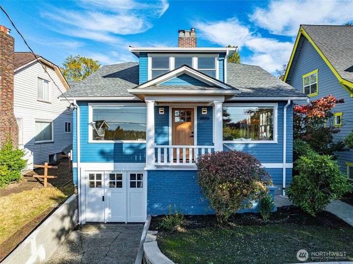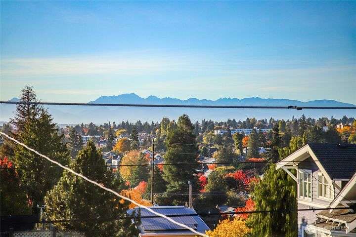 Perched high above the street with dreamy western views of the Olympics this 1924 Craftsman lives large with bright open spaces. Enter into the generously sized living room with whimsical tiled gas fireplace & big windows that usher in the sun. Formal dining room built for entertaining & efficient & updated kitchen with stainless appliances & doorway to covered back deck. 2 bedrooms & refreshed bathroom complete the main floor. Upstairs offers 2 additional bedrooms (one with office & a WOW view)+ 3/4 bath. Ample storage in the attic. Below is a BIG basement with separate entry, perfect rec room/5th BR or future ADU with new 3/4 bathroom, laundry & hobby room. Attached gear garage to store all your PNW toys. Epic Phinney location!