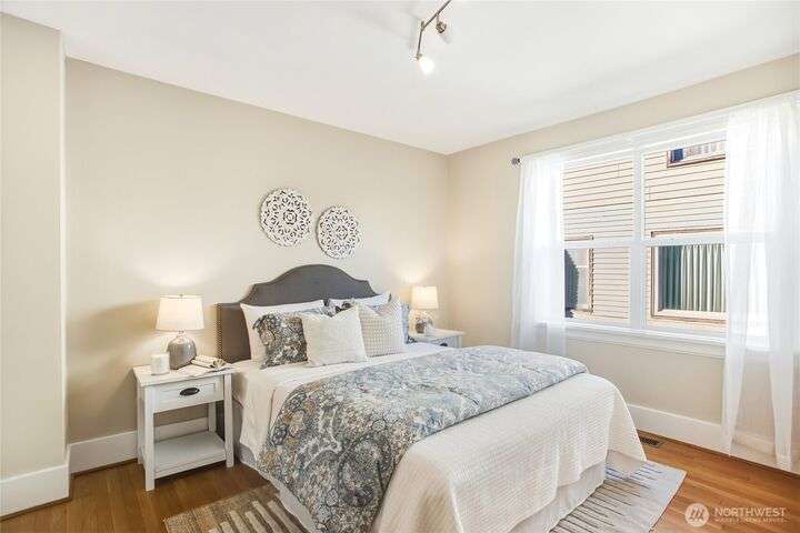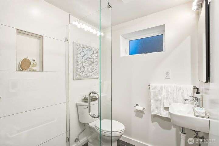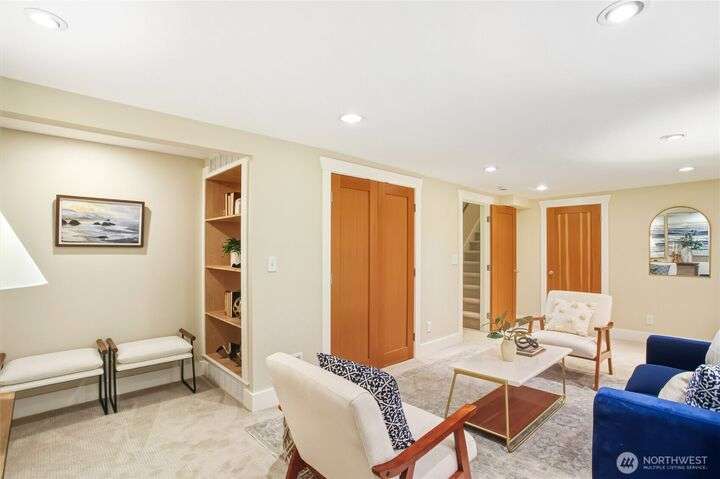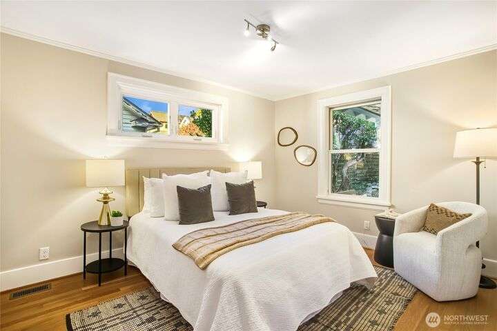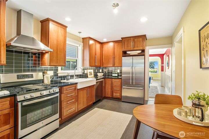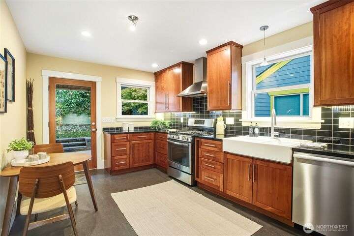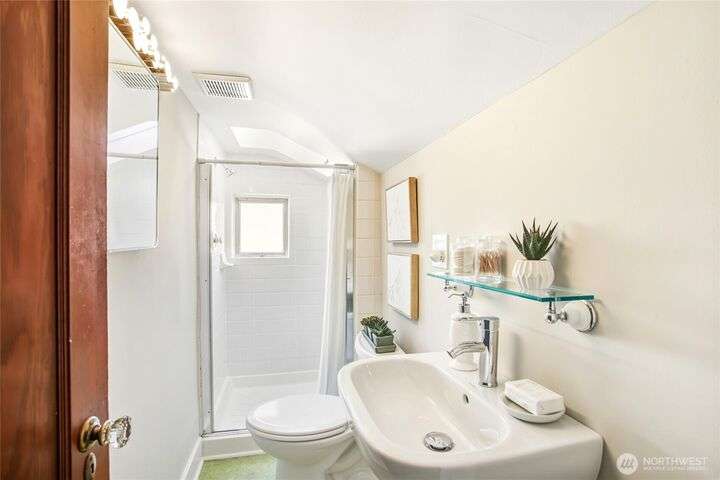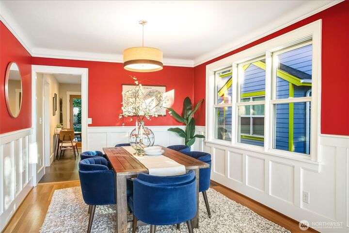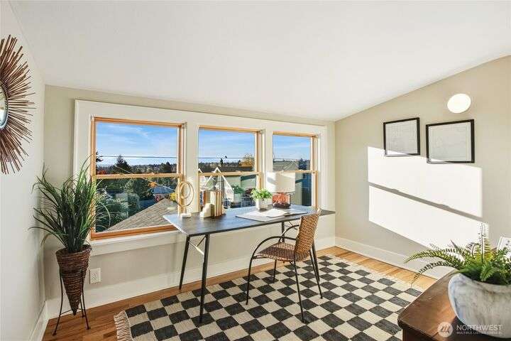 Perched high above the street with dreamy western views of the Olympics this 1924 Craftsman lives large with bright open spaces. Enter into the generously sized living room with whimsical tiled gas fireplace & big windows that usher in the sun. Formal dining room built for entertaining & efficient & updated kitchen with stainless appliances & doorway to covered back deck. 2 bedrooms & refreshed bathroom complete the main floor. Upstairs offers 2 additional bedrooms (one with office & a WOW view)+ 3/4 bath. Ample storage in the attic. Below is a BIG basement with separate entry, perfect rec room/5th BR or future ADU with new 3/4 bathroom, laundry & hobby room. Attached gear garage to store all your PNW toys. Epic Phinney location!