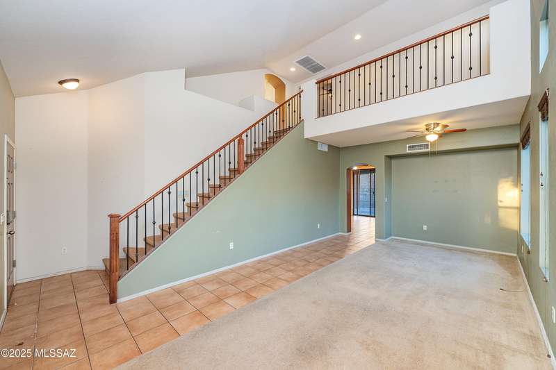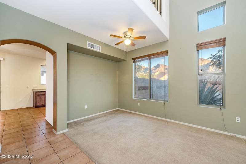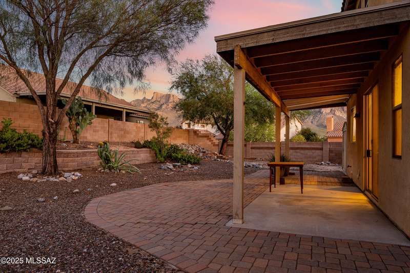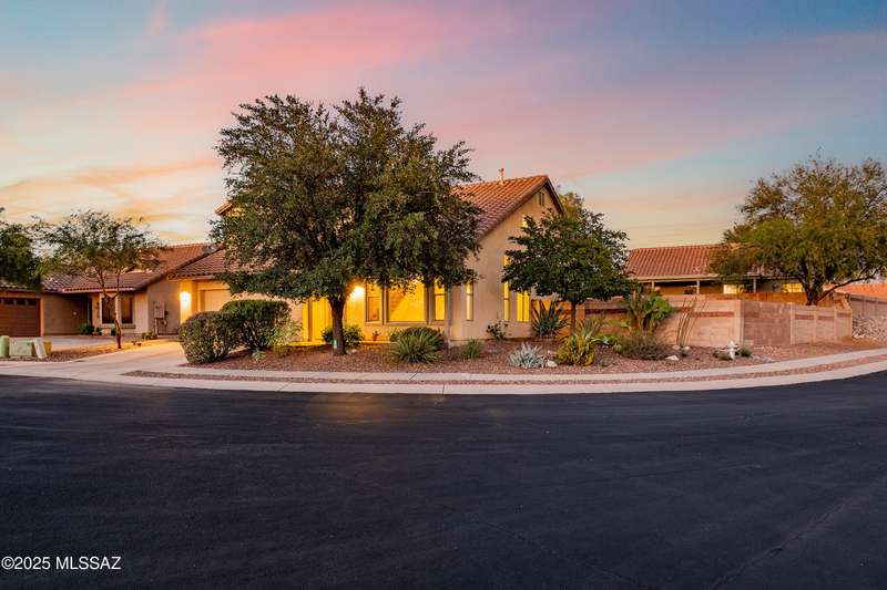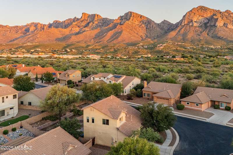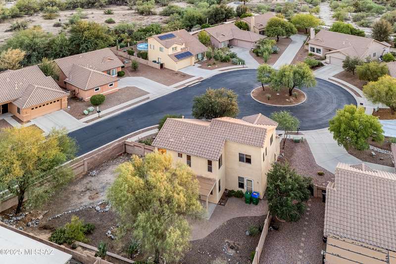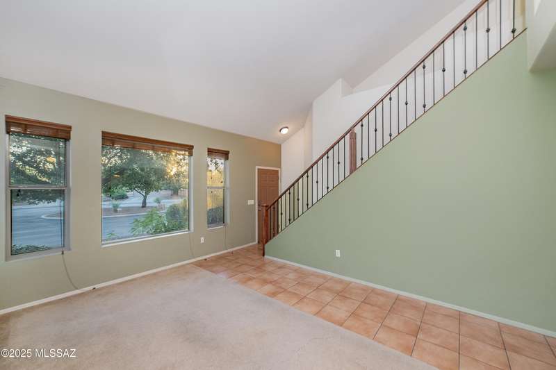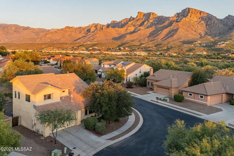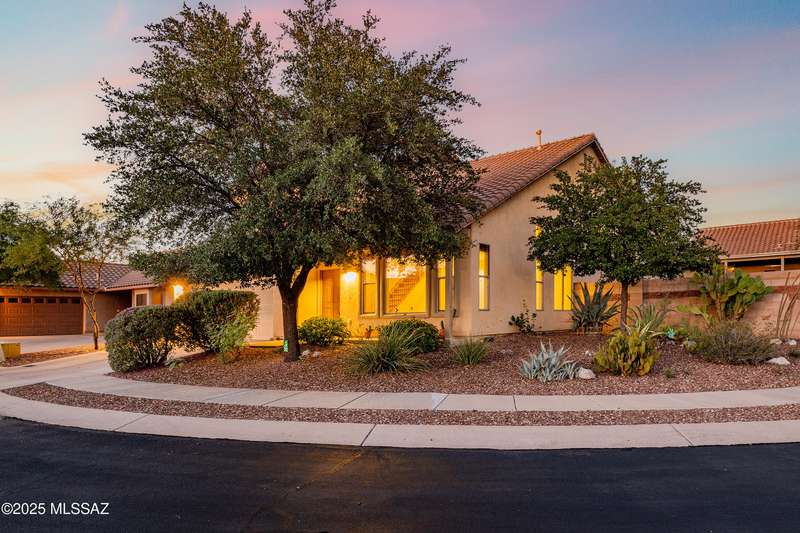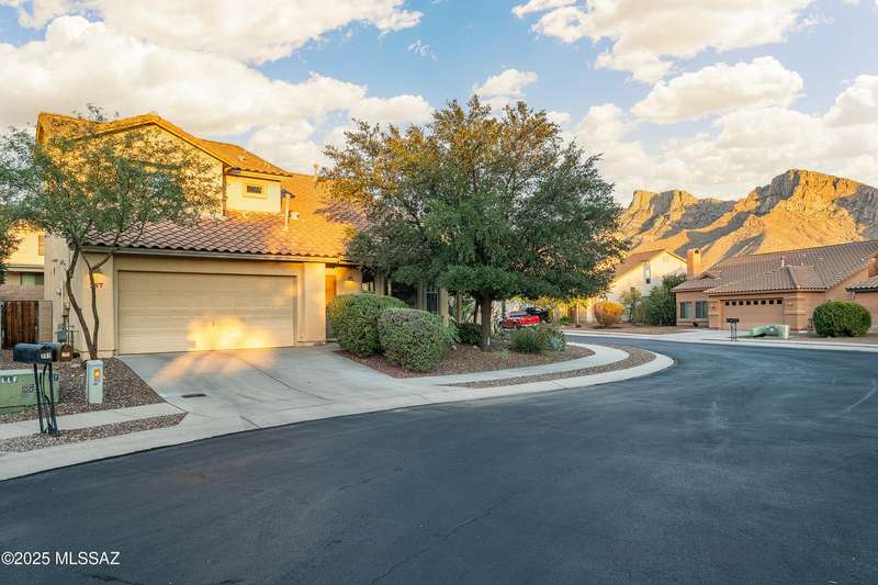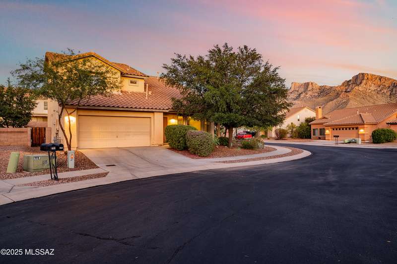 Welcome Home to Oro Valley Living! Ideally situated on a quiet cul-de-sac and corner lot with mature trees, this 3-bedroom, 3-bath home offers flexibility and comfort. The versatile first floor includes a full bedroom and bath with a private rear entrance, perfect for use as an office, guest quarters, or a mother-in-law suite.The front entry opens to a living and dining area, beautifully accented by a wrought-iron staircase and an open loft above. Toward the back of the home, you'll find the kitchen, casual dining area, and family room, an inviting space for everyday living and entertaining.Upstairs, the spacious primary suite includes an attached sitting room or dressing area that can easily be converted into a fourth bedroom.