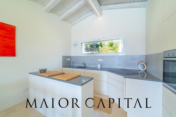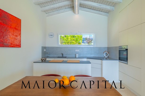 The house stands out for the quality of its finishes and architectural elegance. Modern lines blend with traditional elements such as the bleached wooden roofs and Orosei marble floors, creating a perfect balance between contemporary style and local materials.