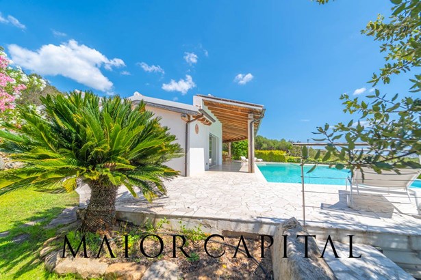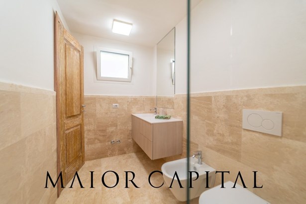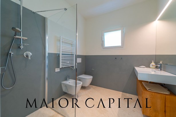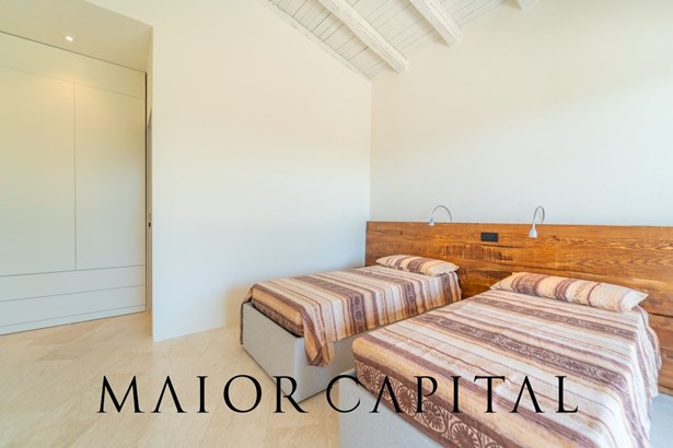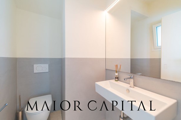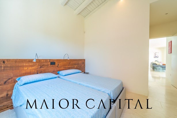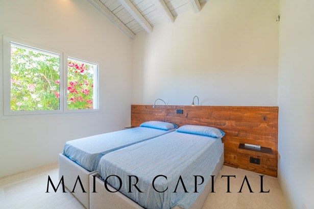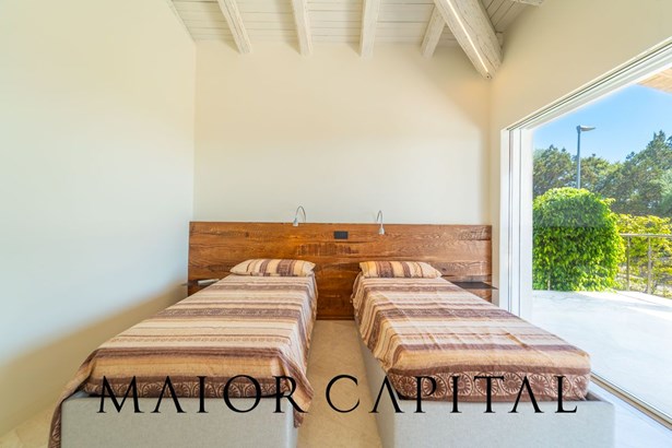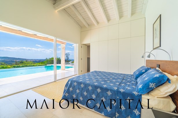 The sleeping area consists of a refined master suite with an enchanting view of the pool and the sea, a second double bedroom with en-suite bathroom and a view of the garden, a twin guest room with en-suite bathroom, as well as an additional guest bathroom, designed to offer maximum comfort and functionality.