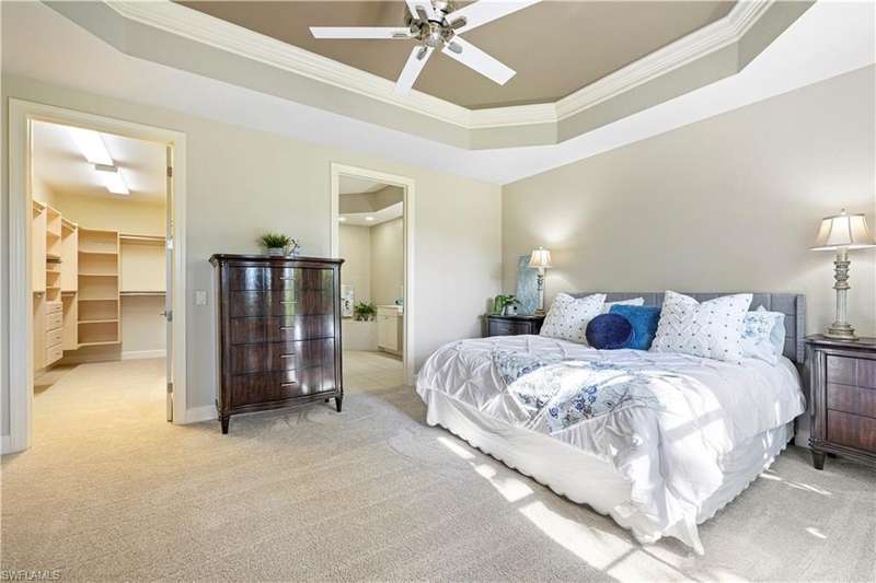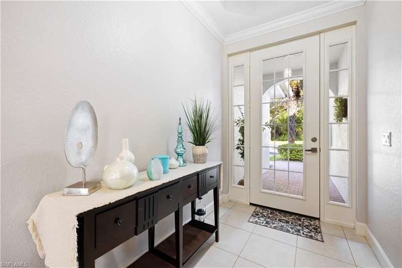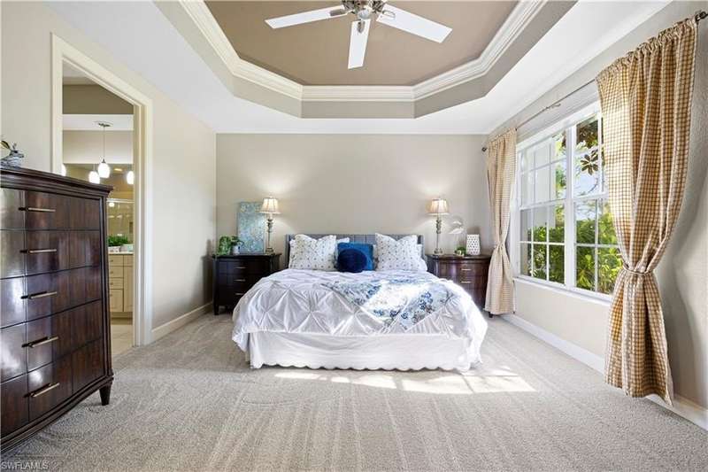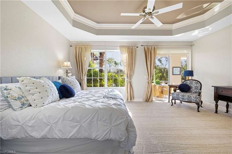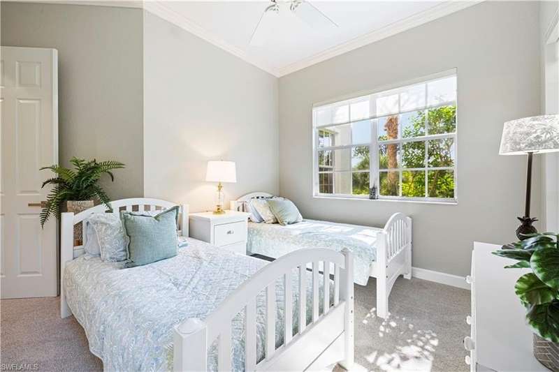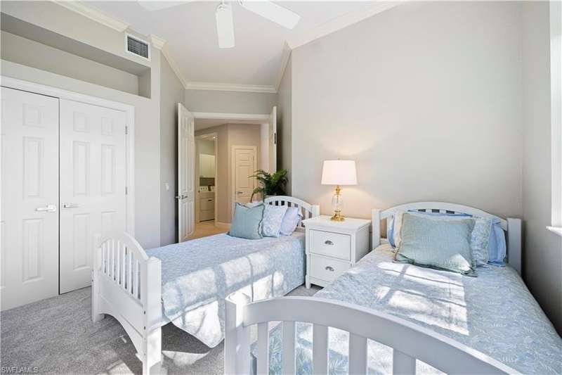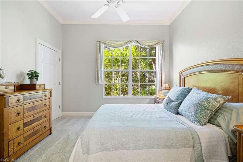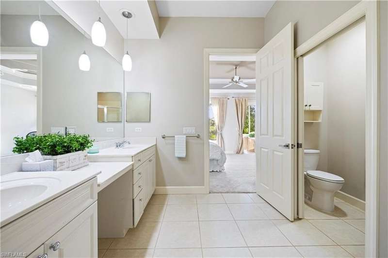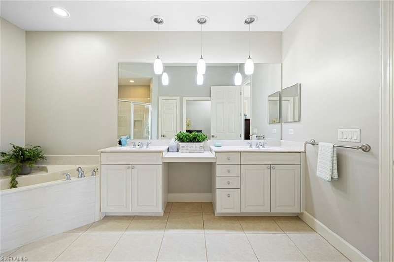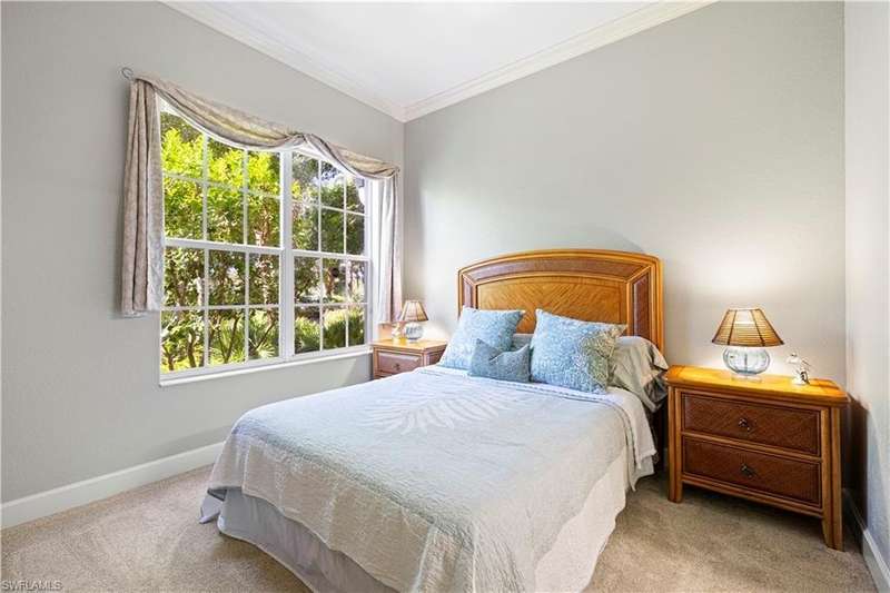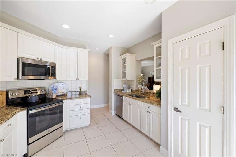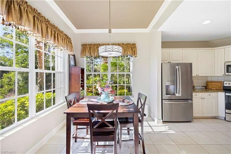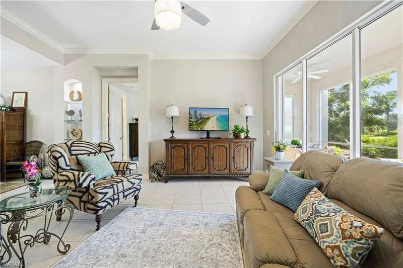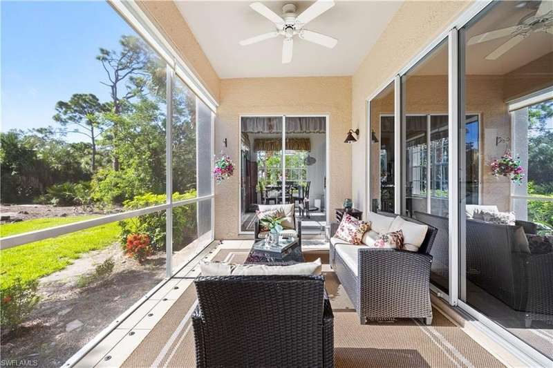 Discover your new sanctuary in this exceptional ground floor end unit condominium, perfectly positioned to offer views of the 6th hole tee box and lush preserve beyond your windows. This unit features 3 bedrooms, 2 full bathrooms and a powder room, and 2 car garage. Enter the Great Room, where triple sliders open up to an extended lanai with a tiled floor. This outdoor space is perfect for morning coffee or evening relaxation, all while soaking in the calming views. Fully equipped kitchen with morning room, and pantry. Primary Suite featuring a king bed, a huge walk-in closet that provides ample storage. The Master Bath is a true oasis, equipped with dual vanities, a walk-in shower, and a corner soaking tub. Guest-Friendly Layout with guest bedroom with ensuite bathroom featuring a queen bed, other bedroom features 2 twin beds. This condo also has laundry room, and comes with WIFI and cable. Located directly across from the community swimming pool and mailboxes, this home offers both accessibility and leisure at your doorstep. Enjoy The Colony's unique resort lifestyle with abundant amenities including your optional transfer membership to The Bay Club ($200), or take the shuttle to the private beach park, 2 Canoe/Kayak parks, Butterfly Garden, Bocce Ball, Sailing club, Community & Fitness Centers, Pickleball Courts and one of the area's biggest Tennis programs. Convenient distance to shopping, entertainment, dining, airport & beaches.