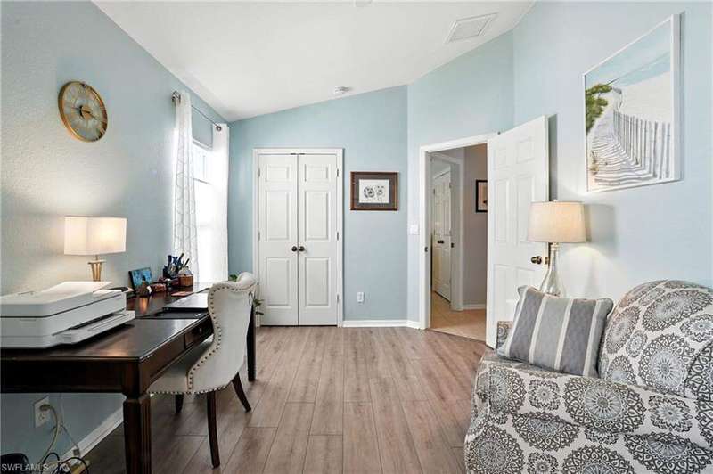 Wake up to serene preserve views in this thoughtfully updated 4-bedroom home nestled on the only secluded loop in the gated community of Gladiolus Preserve. Inside, soaring vaulted ceilings and abundant natural light fill nearly 2,000 sq. ft. of living space with a bright and airy ambiance. Two spacious living and dining areas provide the perfect setting for entertaining or relaxing, while the modern kitchen impresses with updated countertops, a tiled backsplash, breakfast bar, double-door pantry, and a built-in desk. The luxurious primary suite features premium vinyl plank flooring, a generous walk-in closet, and a spa-like ensuite bath with dual vanities, soaking tub, and separate walk-in shower. The versatile 4th bedroom adjoins the primary suite through elegant French doors, enabling it to effortlessly transform into a home office, wellness room, nursery, or cozy sitting area. Move right in and enjoy updated flooring (no carpet), new water heater and A/C compressor (2025), plus a newer roof and kitchen appliances (2022). Your private screened lanai and new paver patio invite you to unwind or entertain while overlooking the spacious backyard and tranquil preserve. Rest easy with low HOA fees, No CDD fees, and No history of flooding! Gladiolus Preserve offers residents a variety of amenities including a clubhouse, heated pool, fitness center, and playground. Ideally located in the heart of South Fort Myers, you'll be just minutes from Sanibel, Fort Myers Beach, Lakes Public Library, and both HealthPark and Golisano Children's Hospitals.