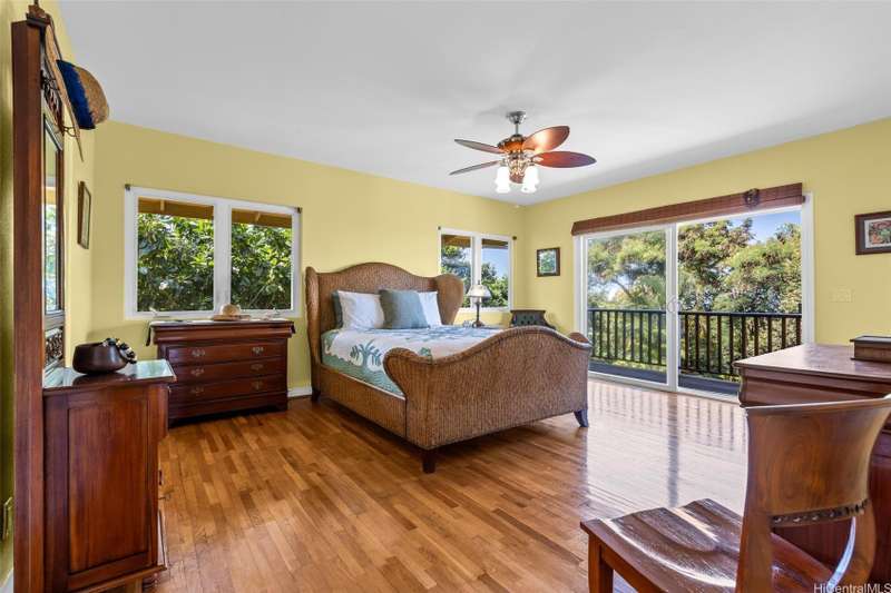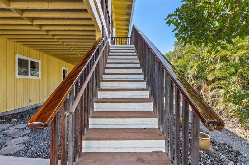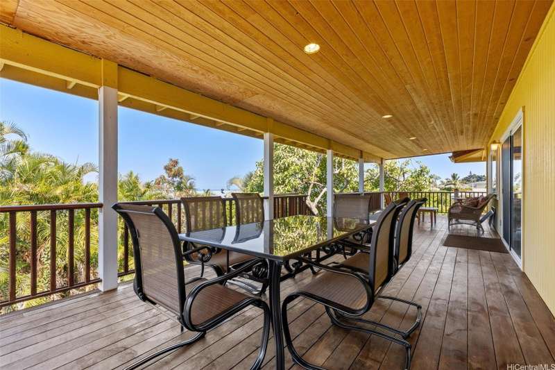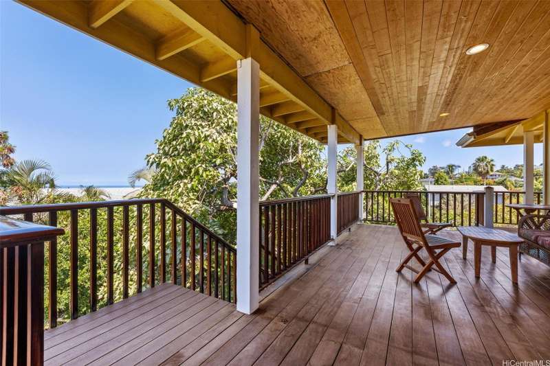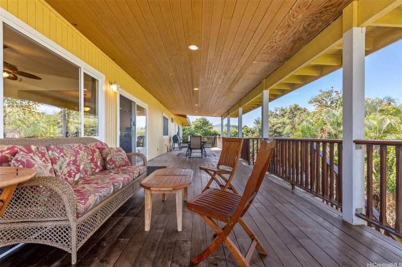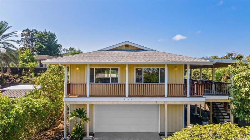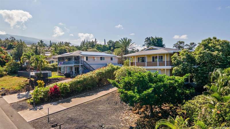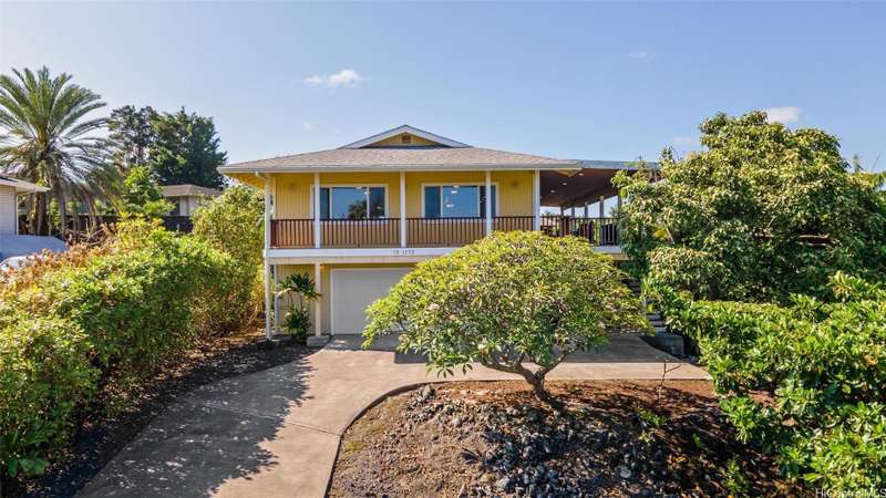 Island style living with high ceilings, generous spaces, and handcrafted wood details. This 3-bedroom, 3-bath home (built 2006) is designed with elevated positioning and high ceilings that capture breezes and blue horizon views. Hardwood floors flow throughout, complemented by custom wood finishes that reflect the craftsmanship of its owner - a shipbuilder and restorer of classic wooden yachts. An expansive wrap-around lanai enhances indoor-outdoor living, while a convenient downstairs bath is perfect for rinsing off after the beach or outdoor activities before heading upstairs. Several select hardwoods remain onsite, ready for the next owner to incorporate into cabinetry, built-ins, or other personalized finishes. Practical features include insulated windows for year-round comfort, a full-size two-car garage with generous storage and workshop space, and a septic wastewater system. Beneath the home, a ground-level area currently used for storage offers potential for future expansion, subject to county requirements. This is a home for those who value space, breezes, the beauty of island craftsmanship, plus lei-making trees; puakenikeni, plumeria, and kukui.