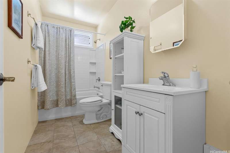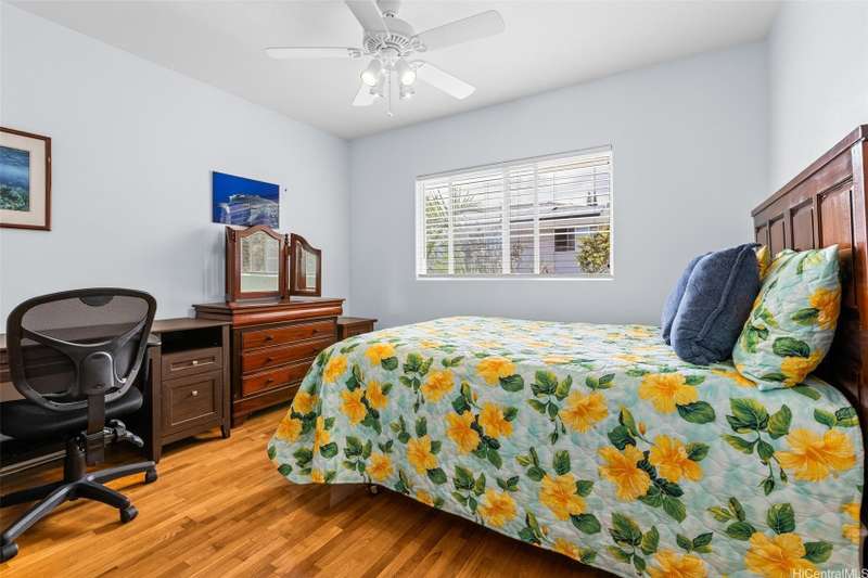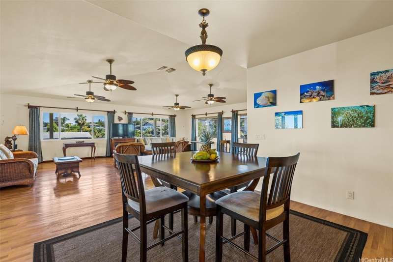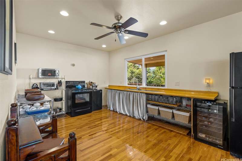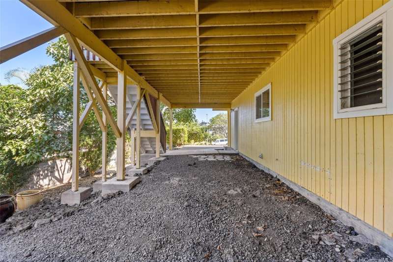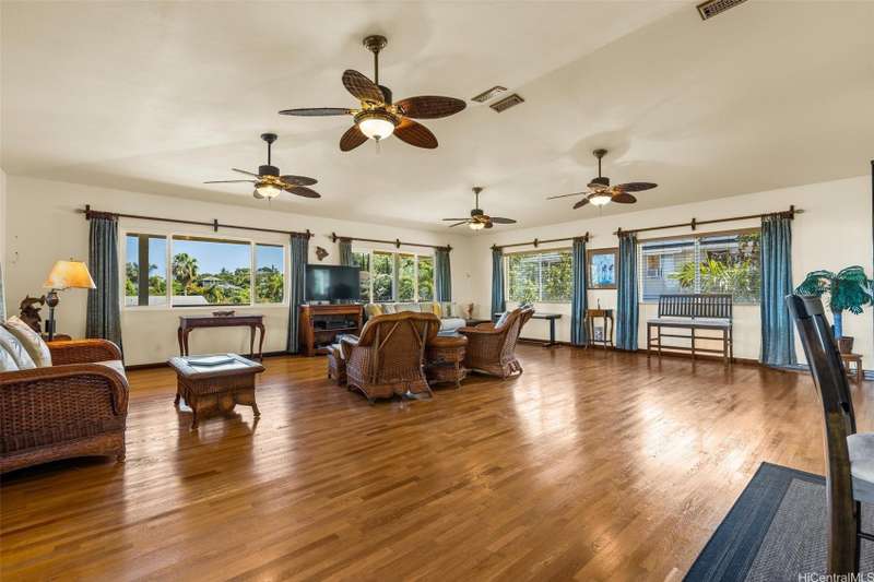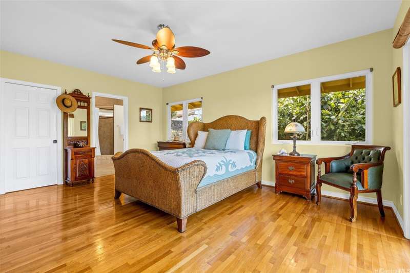 Island style living with high ceilings, generous spaces, and handcrafted wood details. This 3-bedroom, 3-bath home (built 2006) is designed with elevated positioning and high ceilings that capture breezes and blue horizon views. Hardwood floors flow throughout, complemented by custom wood finishes that reflect the craftsmanship of its owner - a shipbuilder and restorer of classic wooden yachts. An expansive wrap-around lanai enhances indoor-outdoor living, while a convenient downstairs bath is perfect for rinsing off after the beach or outdoor activities before heading upstairs. Several select hardwoods remain onsite, ready for the next owner to incorporate into cabinetry, built-ins, or other personalized finishes. Practical features include insulated windows for year-round comfort, a full-size two-car garage with generous storage and workshop space, and a septic wastewater system. Beneath the home, a ground-level area currently used for storage offers potential for future expansion, subject to county requirements. This is a home for those who value space, breezes, the beauty of island craftsmanship, plus lei-making trees; puakenikeni, plumeria, and kukui.