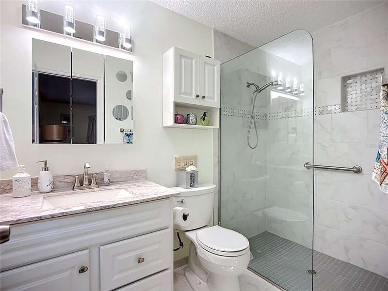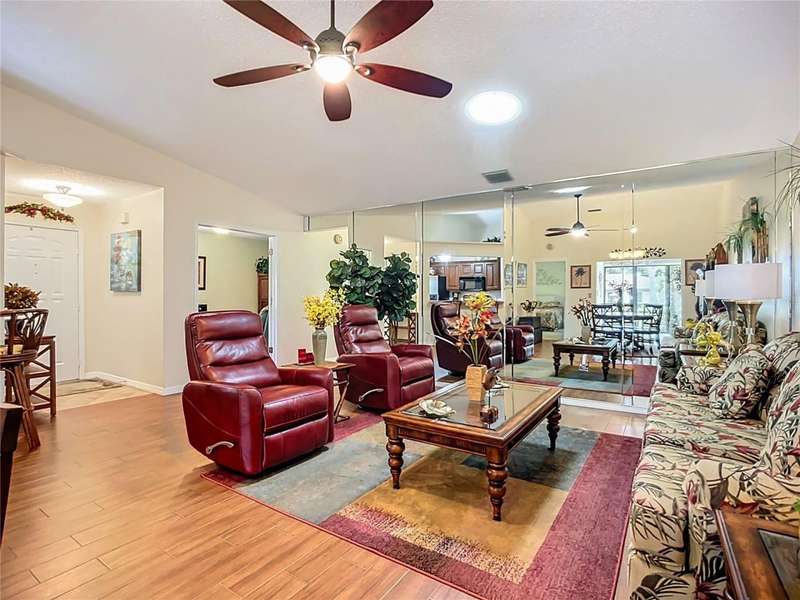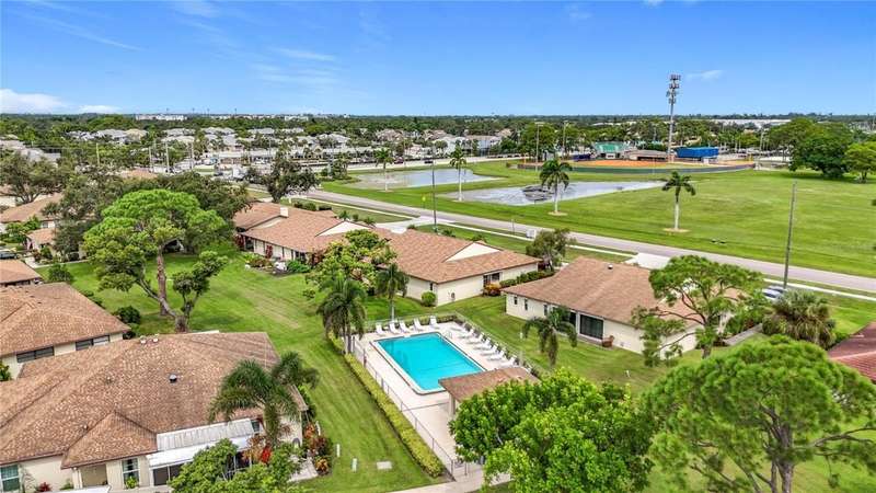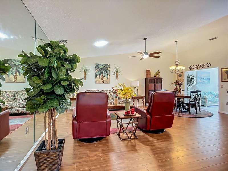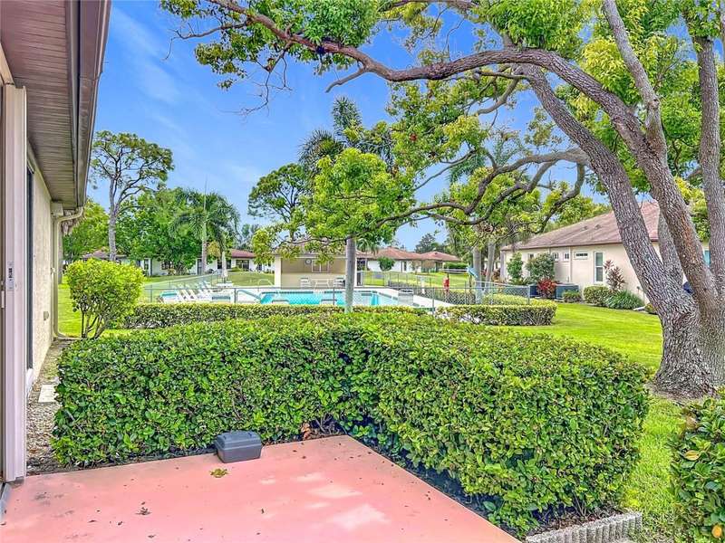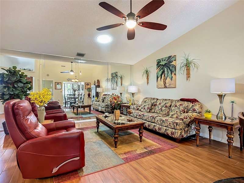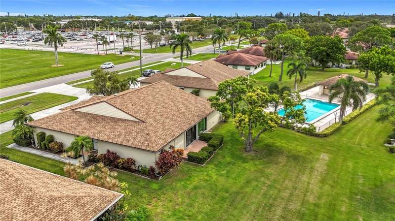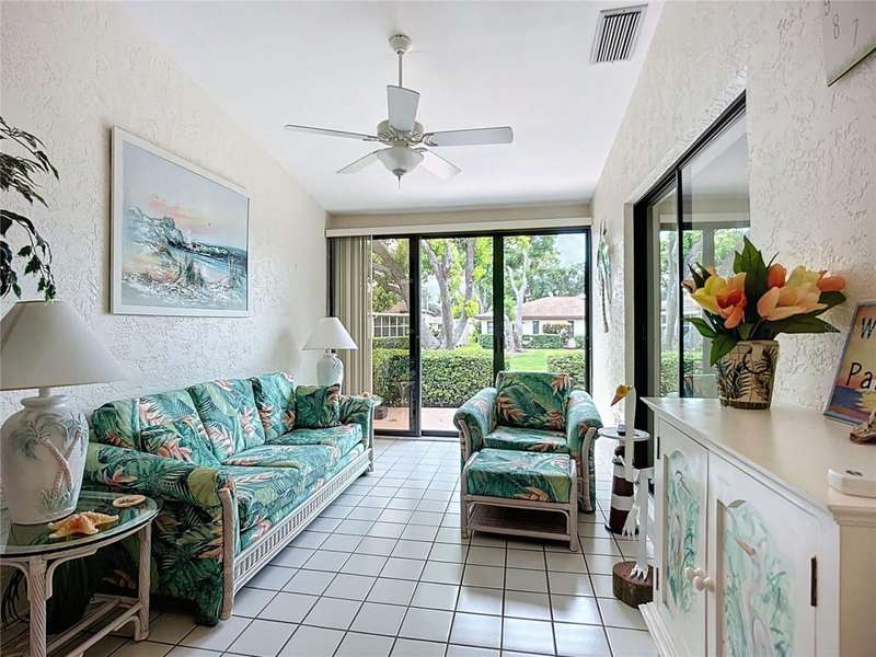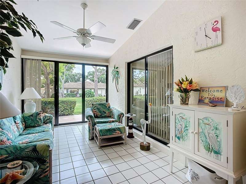 This 2-bedroom villa with a DEN and garage showcase vaulted ceilings, elegant staggered porcelain tile, and upscale furnishings. Additional desirable features include an extensive view of the garden area and the close proximity to the pool. UPDATED KITCHEN offers newer cabinets, stainless steel appliances, and diagonal tile flooring. Both bathrooms have been renovated with modern vanities, toilets, and flooring. PRIMARY BATH includes a beautifully updated walk-in shower with shampoo niche and the safety of a grab bar. Enjoy peace of mind with recent upgrades: AC (2023), water heater (2020), roof (2022 - covered by HOA), newer interior doors, hurricane accordion shutters (front/back), clear panels (sides), and a garage door brace bar. The AIR CONDITIONED garage adds comfort and the Florida room is integrated into the living area for year-round use. There's also a private outdoor patio for grilling. Plenty of storage (deep hall closet) and parking (1-car garage + 3 spaces for guest parking). HOA covers roof, exterior pest control, Sentricon termite protection, painting, lawn care, and community pool. Vivienda offers a prime location near Sarasota Airport, IMG Academy, SCF, Publix, Target, Detwiler's, library, restaurants, and the beaches of Bradenton & Anna Maria Island. Being sold As-Is.