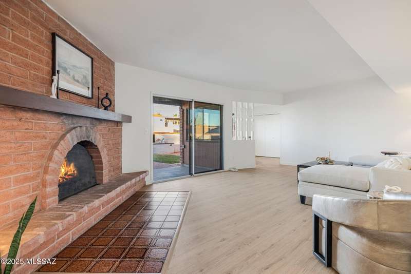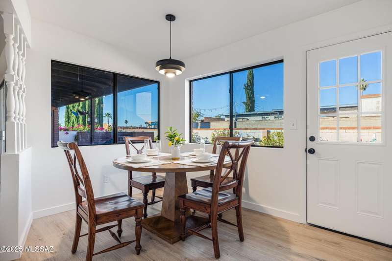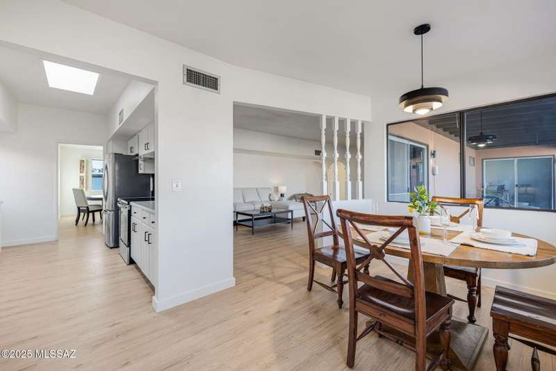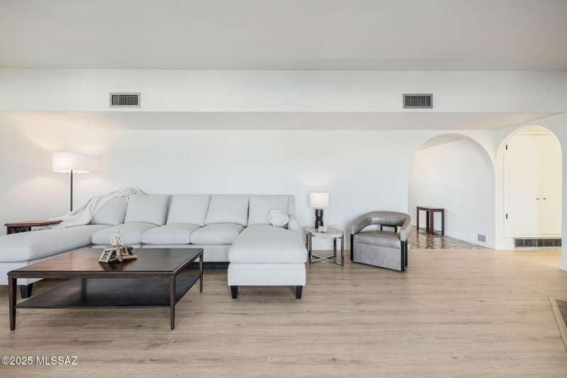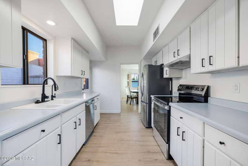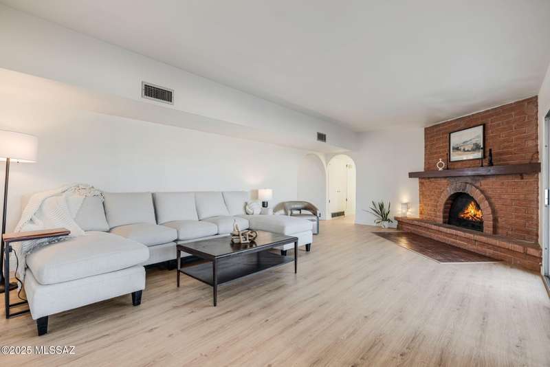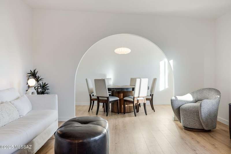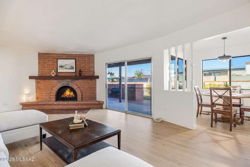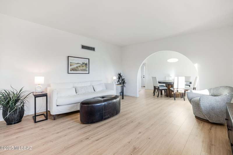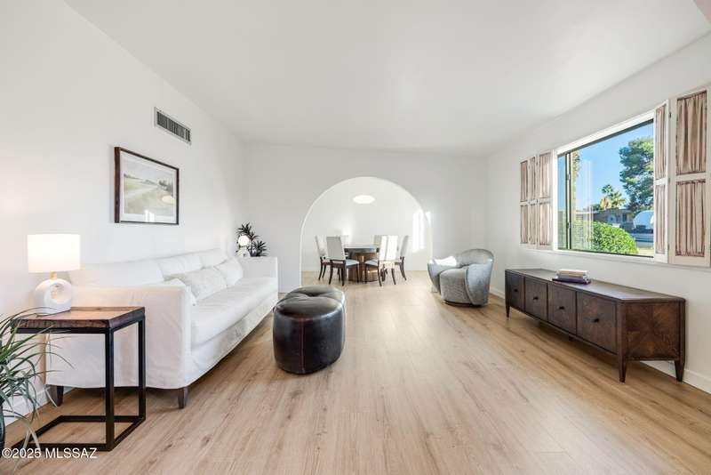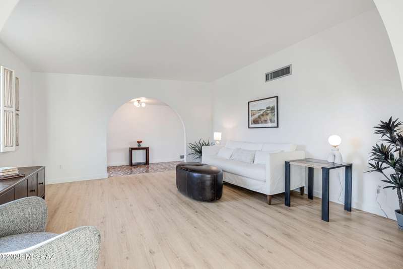 This home features stunning archways, a burnt adobe fireplace, and new luxury laminate floors throughout, seamlessly blending modern design and vintage materials. The kitchen has brand new energy efficient GE appliances, white cabinetry and a skylight that invites incredible natural light. With two large living rooms and two dining rooms this home is perfect for entertaining and hosting holidays. There are three large bedrooms with walk-in closets; the primary bedroom offers two closets, an ensuite and views of the lush backyard. Out back the walls are studded with established rose bushes, grass, a built-in grill and plenty of exterior storage. A workshop shed sits off to the side yard equip with electricity and a worktable, perfect for a wood worker, painter or extra storage.