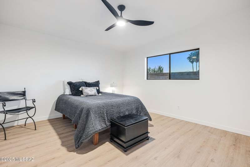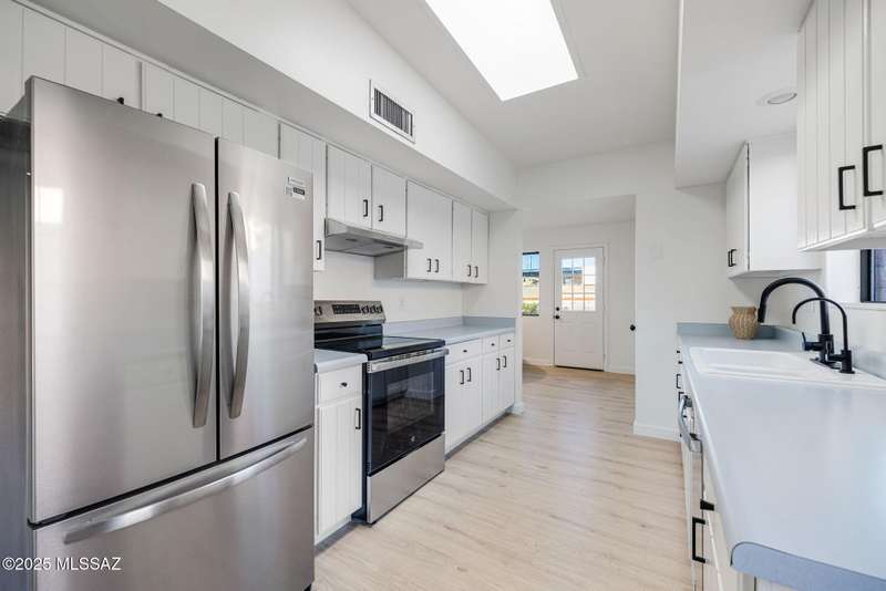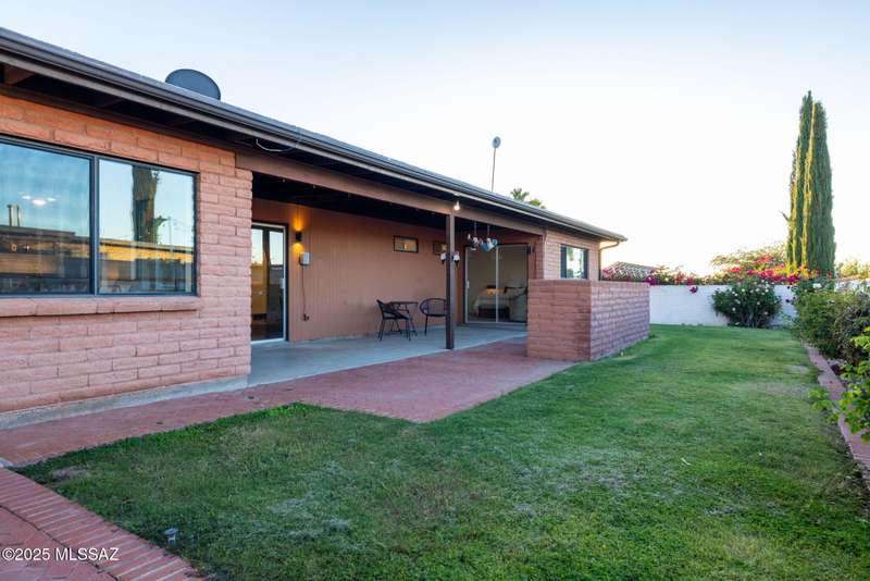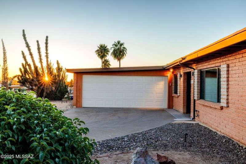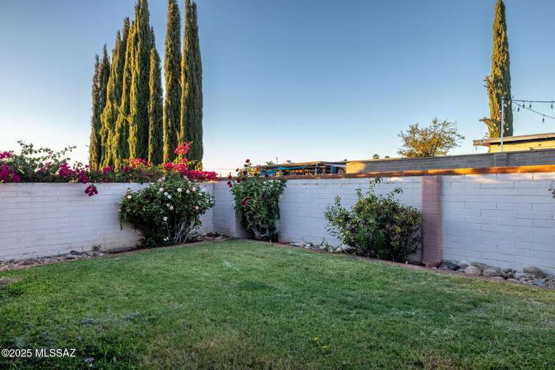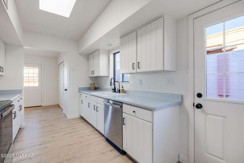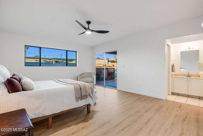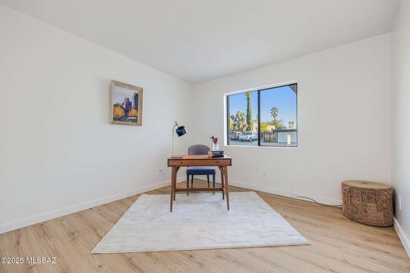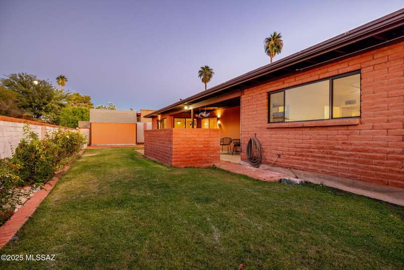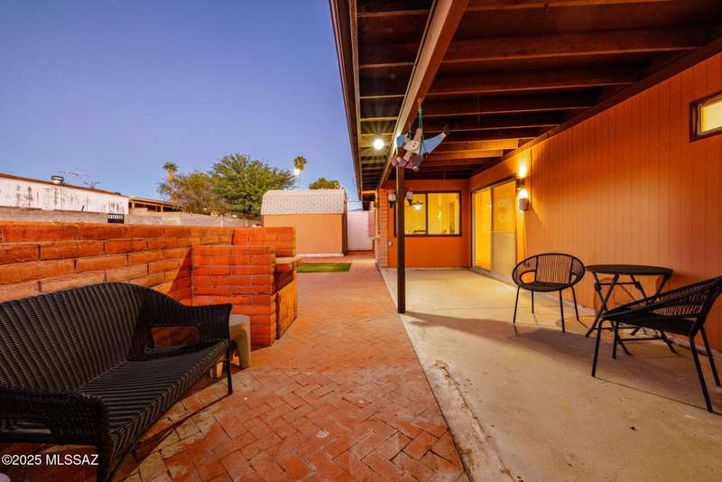 This home features stunning archways, a burnt adobe fireplace, and new luxury laminate floors throughout, seamlessly blending modern design and vintage materials. The kitchen has brand new energy efficient GE appliances, white cabinetry and a skylight that invites incredible natural light. With two large living rooms and two dining rooms this home is perfect for entertaining and hosting holidays. There are three large bedrooms with walk-in closets; the primary bedroom offers two closets, an ensuite and views of the lush backyard. Out back the walls are studded with established rose bushes, grass, a built-in grill and plenty of exterior storage. A workshop shed sits off to the side yard equip with electricity and a worktable, perfect for a wood worker, painter or extra storage.