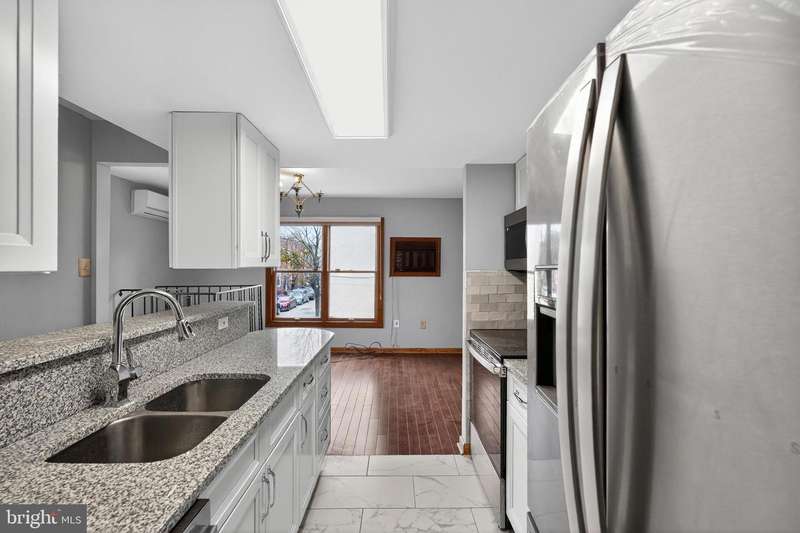 2111 N 18th ST is a two bedroom and three bathroom home. The three story corner property is located close to Temple University and is surrounded by continuous development. The first floor consists of a garage located in the front of the home. The first floor also has a room behind it that has a laundry area, extra living space, a powder room and an enclosed glass deck with large yard. The extra room has a spiral staircase leading to the second floor and main living area. The second floor and main living area has bay windows with hardwood flooring throughout. The living room and two dining areas are spacious. The kitchen is brand new with appliances including refrigerator, oven, microwave and dishwasher. The tiled kitchen has new counter tops and subway tile backsplash with plenty of cabinet space. The second of two powder rooms is also on this floor. The third floor has two very large bedrooms carpeted with plenty of closet space. The full bathroom has a walk in shower. The home has zoned A/C and heating throughout.