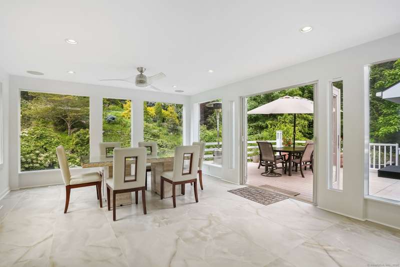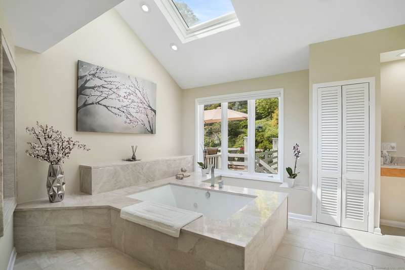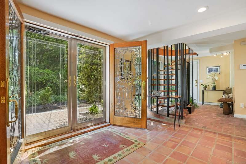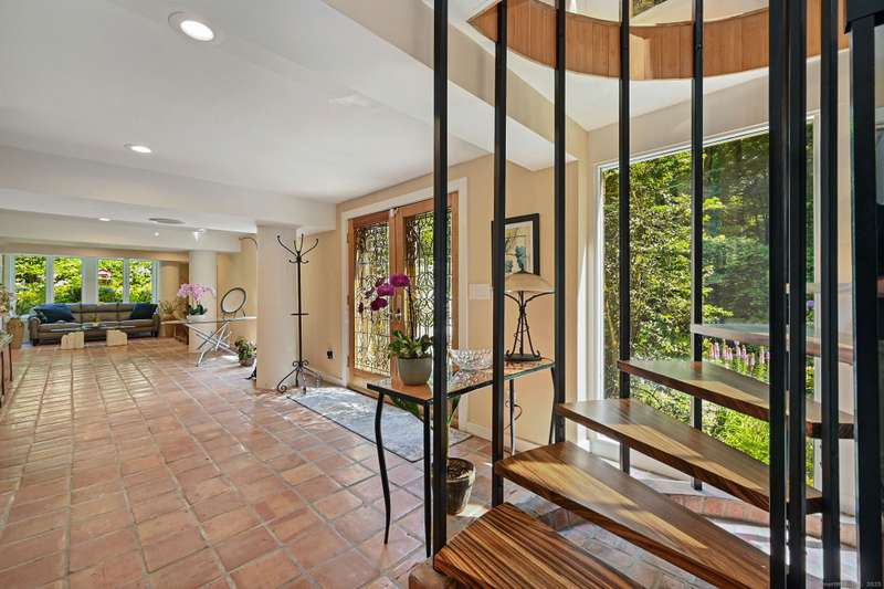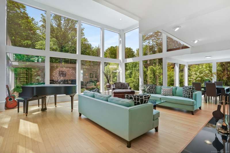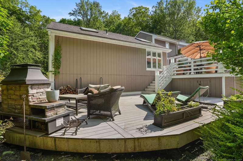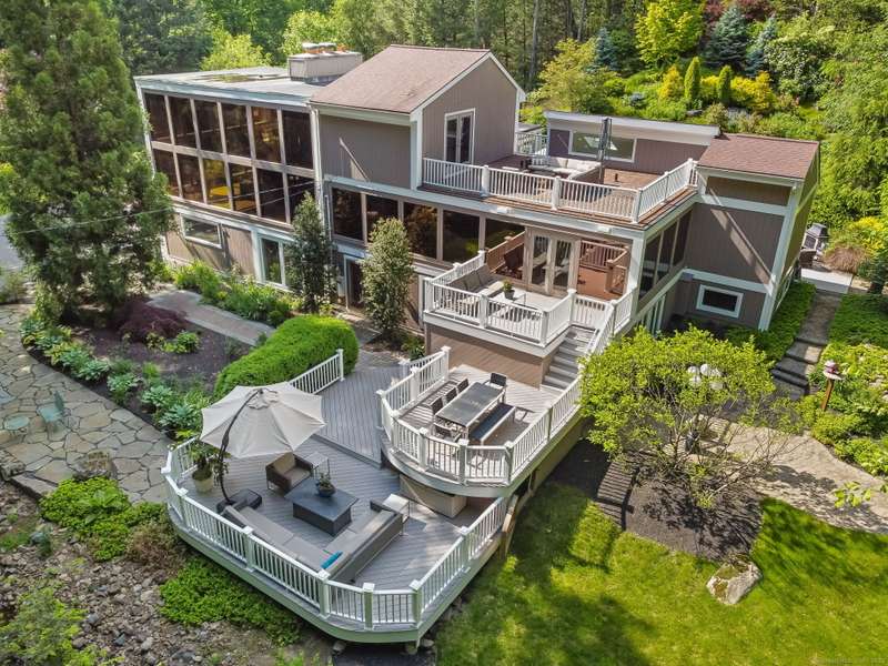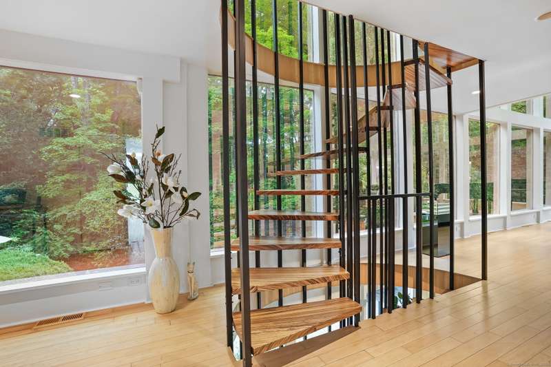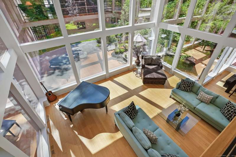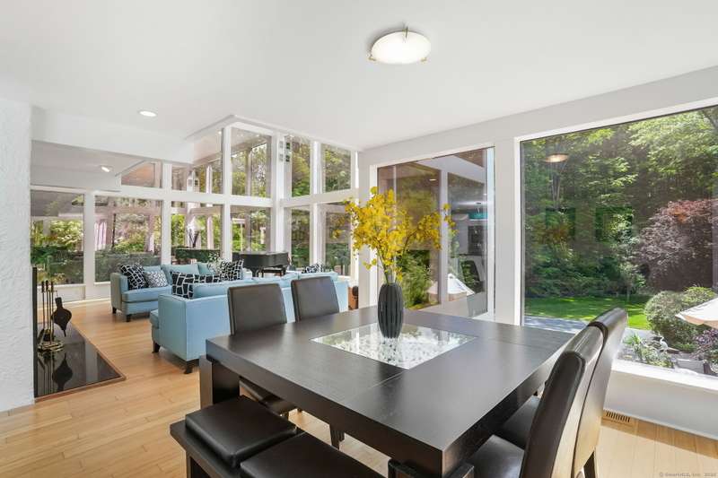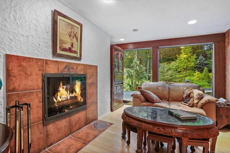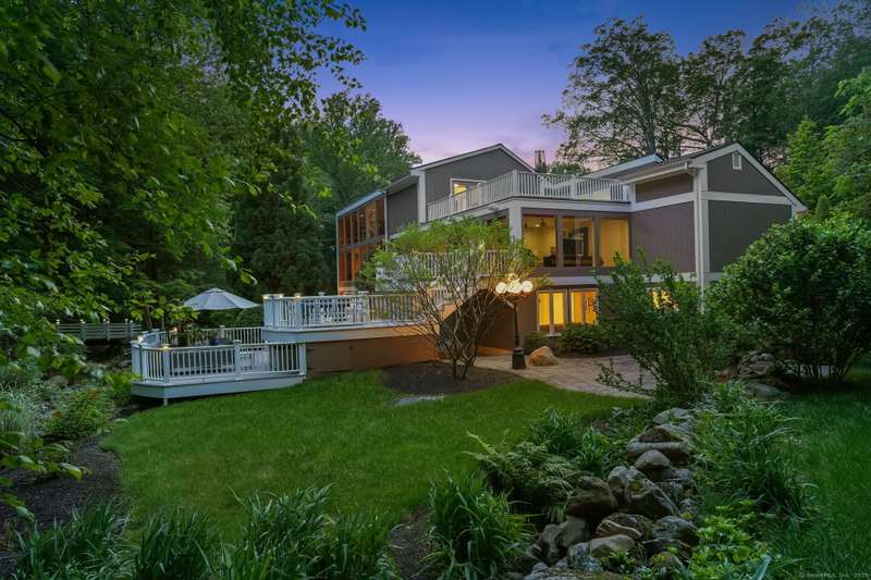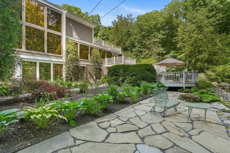 Welcome to the glass house of Southbury! Truly a home of style and distinction with its three levels of 5000+ sqft. Enjoy your own private oasis on over 3 secluded wooded acres landscaped for color from early Spring until the beautiful New England Fall. This one of a kind contemporary style home with glass walls in every major room brings the outside world in 24/7. Enter the lower level through the Garden Room hallway which leads to a Family Rm with fireplace & entrance to Patio with view of the KOI pond. The main level boasts of a Living Room with fireplace and floor to ceiling glass walls on three sides offering stunning views of the outdoors. Adjacent, is a recently remodeled Eat-in Kitchen with Thermador appliances, reflective big blue granite countertops and a deck right off the dining area. Also featured, is a lovely Primary Bedroom suite with motorized blinds, large custom Walk-in closet, and a newly renovated Bath featuring heated floors, large granite enclosed heated tub, bide