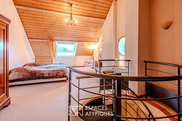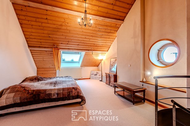 The first, approximately 180 sqm, offers a warm atmosphere: a beautiful entrance, a fitted kitchen opening onto a large living room with a fireplace, a bedroom or office, and a bathroom. The upper floor, accessible by a spiral staircase or elevator, houses two additional bedrooms and a shower room. Under the eaves, a large attic bedroom completes the property. A laundry room, boiler room, cellar, workshop, and storage room enhance the functionality of this main space.