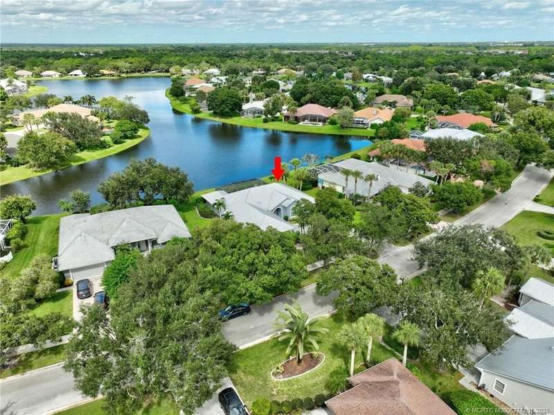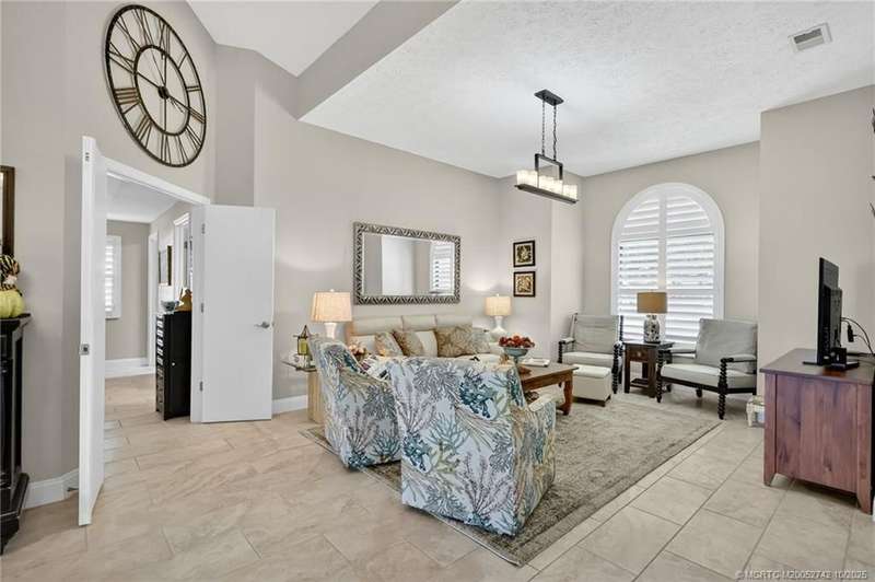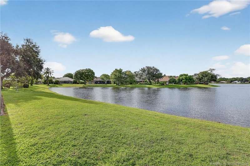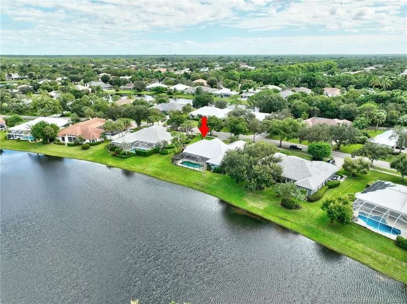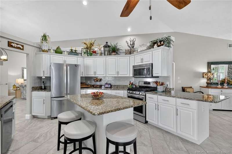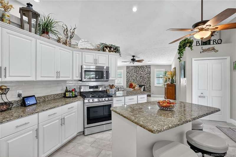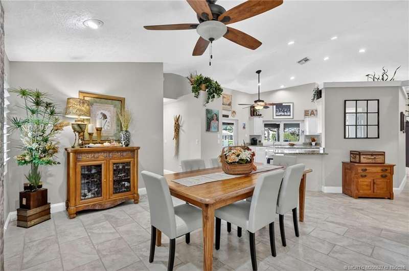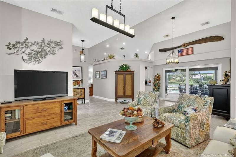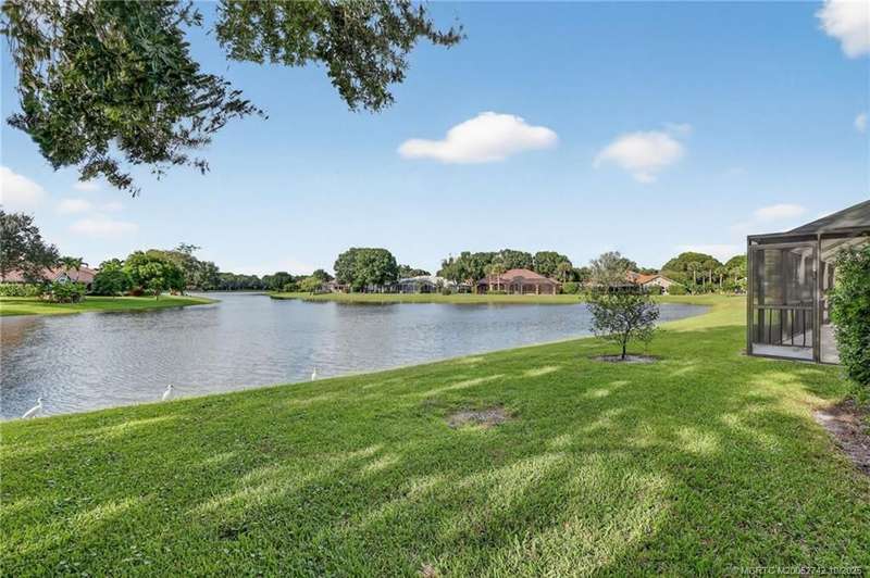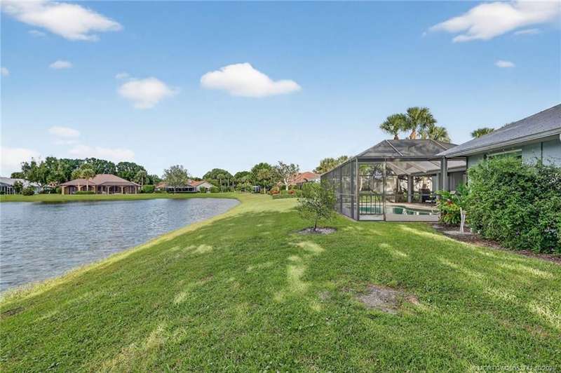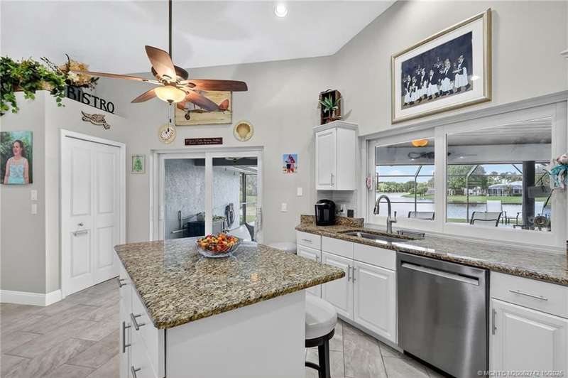 Danforth, a ch?rming g?ted c?mmun??t?? ??n ??lm City, Florida, offers ? s?rene, family-friendly lifestyle with lush tropical surroundings. Residents enjoy walkable access to top-rated A schools, proximity to shopping, dining, parks, golf courses, and easy Turnpike connectivity. Low HOA fees, blending privacy, convenience, and warmth for families, professionals, and retirees. This stunning single-story home features a thoughtful layout with a living room boasting vaulted ceilings. The modern kitchen highlights granite countertops, stainless steel appliances, and a gas cooktop, complemented by a dining area with a custom fireplace. Three bedrooms and three updated bathrooms offer stylish fixtures and ample storage. Outside, a pool, spacious screened lanai, and breathtaking lake views create an ideal retreat. The lush, palm-accented yard adds tropical charm. Other features include impact windows/doors, a 500-gallon gas tank, 22 KW generator, two-car garage, and elegant tile flooring.
