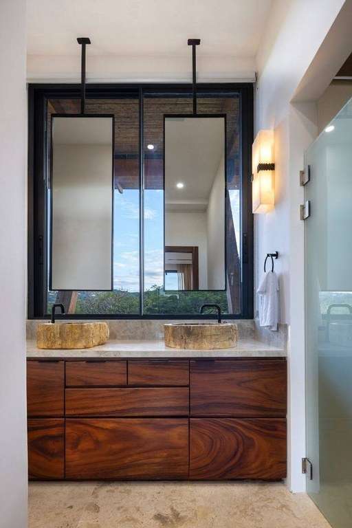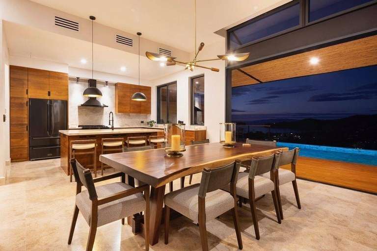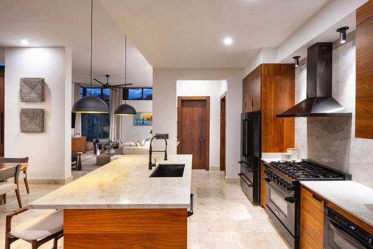 The gourmet kitchen is a showpiece in itself, with bespoke teak cabinetry, Taj Mahal quartzite countertops, and premium Z-Line black steel appliances. Solid Guanacaste wood doors with sleek black steel hardware reflect a modern yet organic design approach, while electric blackout shades in each bedroom ensure restful nights. The spa-inspired bathrooms feature granite countertops and designer Brizo faucets, creating a serene, resort-style environment at home.