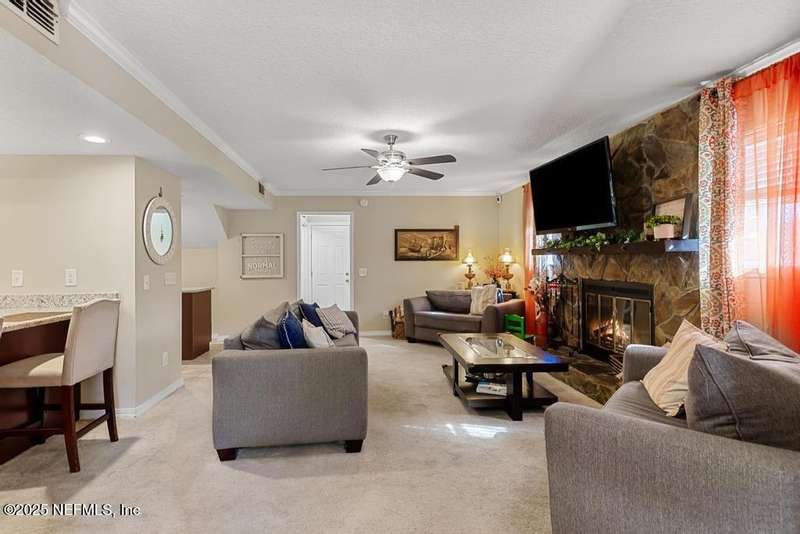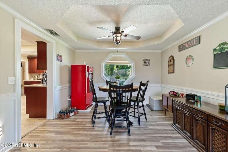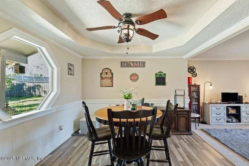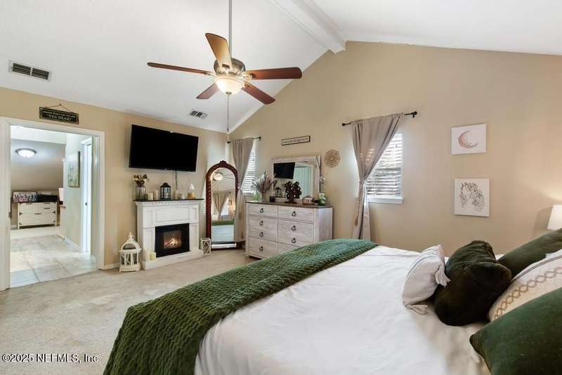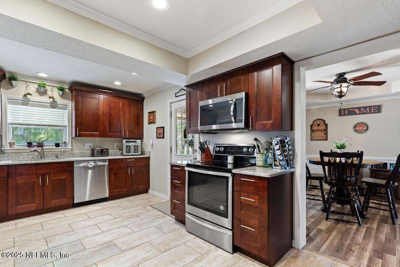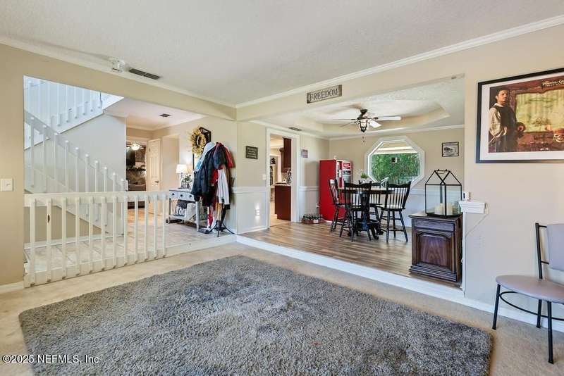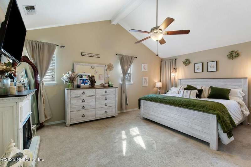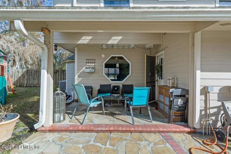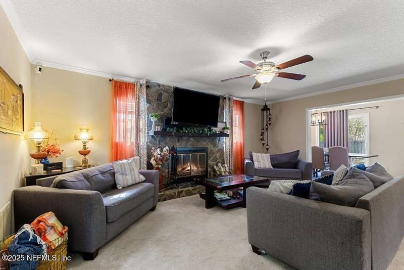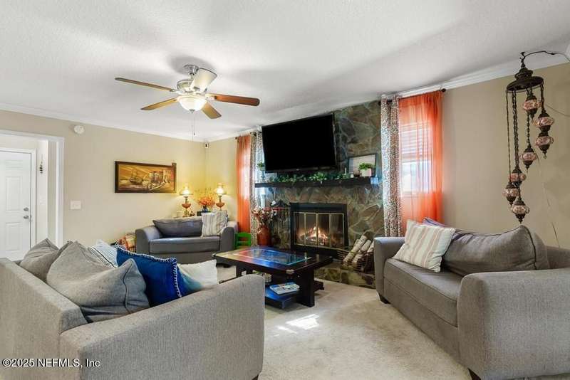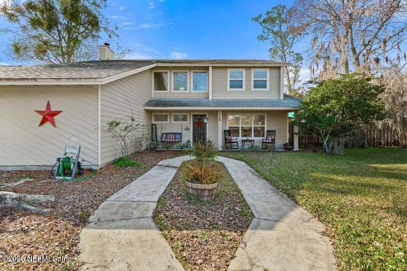 VA ASSUMABLE LOAN with 2.875% interest rate!! NEW ROOF (Sep 2025)! This stunning pool home is perfect for family gatherings and entertainment! Remodeled and situated in the highly desirable, gated Loch Rane and Orange Park CC community, this spacious 4-bedroom, 2.5-bath home offers 2,800 SF of beautifully updated living space.The kitchen is a chef's dream, boasting newer appliances, granite countertops, shaker-style cabinets, and gorgeous tiled floors. A breakfast bar overlooks the family room, while the sunken living room adds a touch of elegance. The home is further enhanced with hardie board siding, new light fixtures, blinds, and a charming stone fireplace in the family room. All bedrooms are generously sized, offering plenty of closet space, especially in the owner's suite. Both bathrooms are beautifully updated, featuring the same stylish floor tiles, cabinets, and countertops found in the kitchen. Additional features include a wet bar, extensive storage under the stairs, a parking pad behind the gate, and a detached shed for extra storage. Key features include, newer Pella windows, two A/C units, and convenient laundry options with a master closet laundry and a separate laundry room off the garage. The sunroom provides a relaxing space with room for casual dining as well as a cozy sitting or office area.Situated on an expansive, over 1/3-acre lot, this home offers plenty of room to enjoy both indoor and outdoor living.