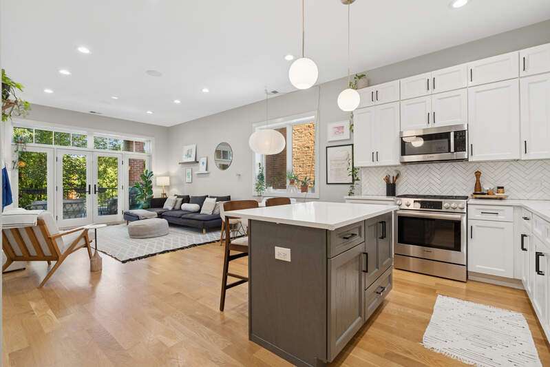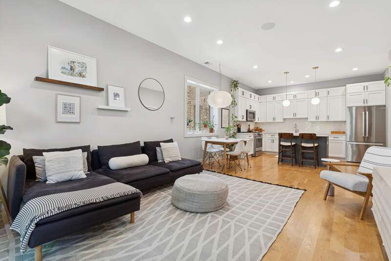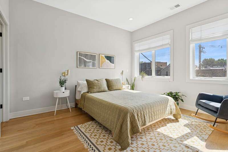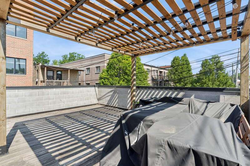 Stunning newer all-brick 3-bedroom, 2-bathroom condo located on historic Humboldt Boulevard, just steps from the 606. This home offers two private outdoor spaces, including half of the garage roof deck with a pergola that is perfect for entertaining. Thoughtfully designed, it features 10-foot ceilings, wide-plank soundproof hardwood floors, premium soundproofing between walls, Andersen specialty insulated windows, and Ipe wood finishes. High-end kitchen showcases Bosch stainless steel appliances, quartz countertops with undermount sink, contrasting white and dark greige cabinetry, herringbone tile backsplash, and an island with additional storage + overhang for seating. Open living and dining area flows seamlessly off the kitchen and opens to a private west-facing balcony overlooking the tree-lined street. Private primary suite is a true retreat with a spacious walk-in closet and spa-like ensuite bathroom with double-sink vanity and step-in shower with body sprayer. Two additional bedrooms are bright and well-proportioned, with convenient access to the second full bathroom with a shower/tub combo. Additional highlights include full-size in-unit laundry, Nest Thermostat, recessed lighting, ample storage, and unbeatable access to the 606 Trail, Blue Line, Palmer Park, Humboldt Park, and the vibrant Logan Square dining and brewery scene. Garage parking space is included in the price.