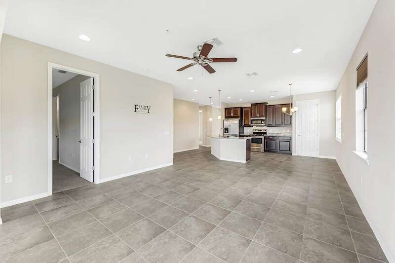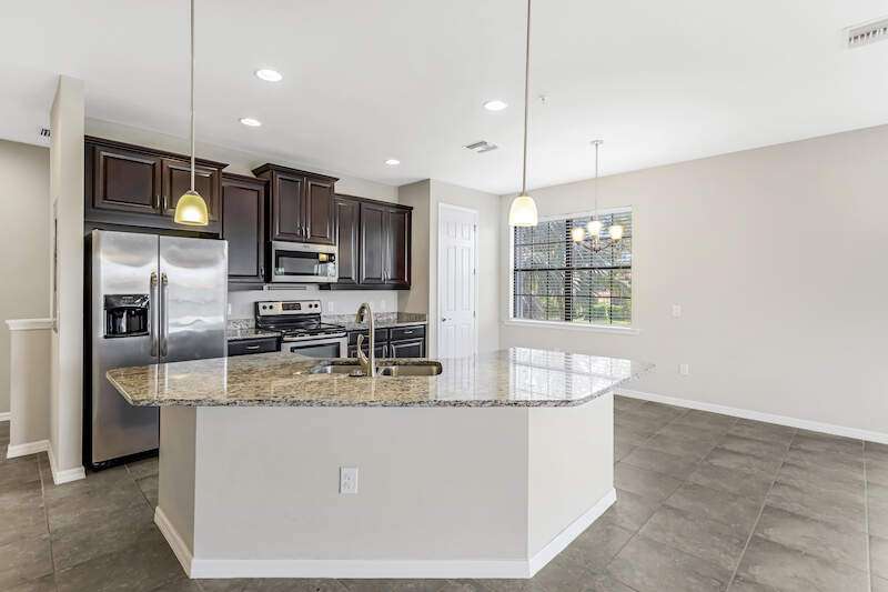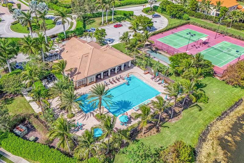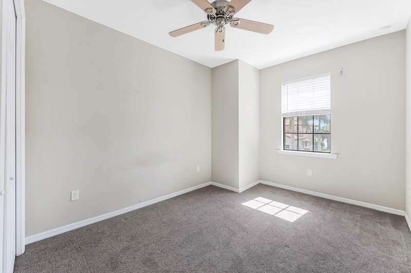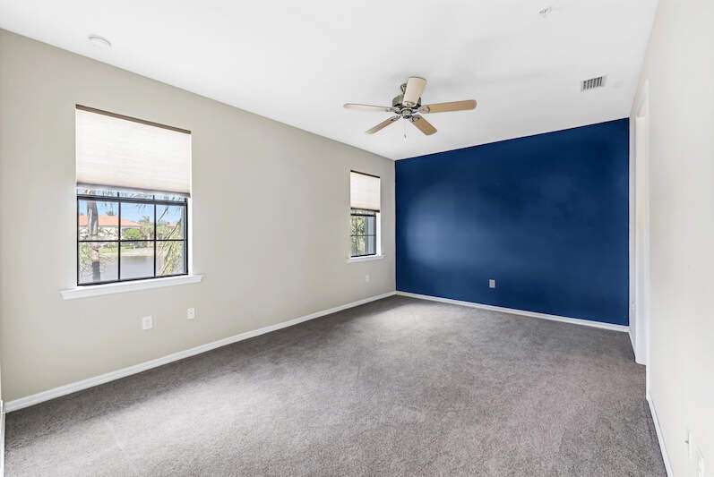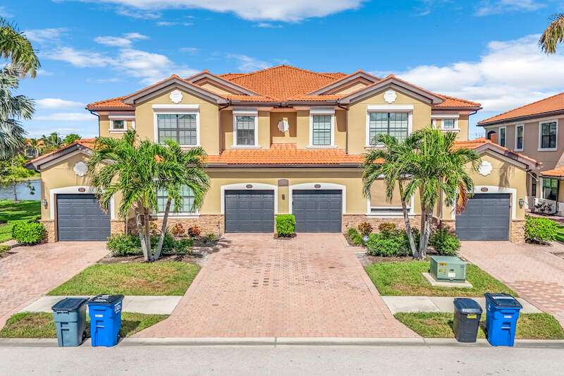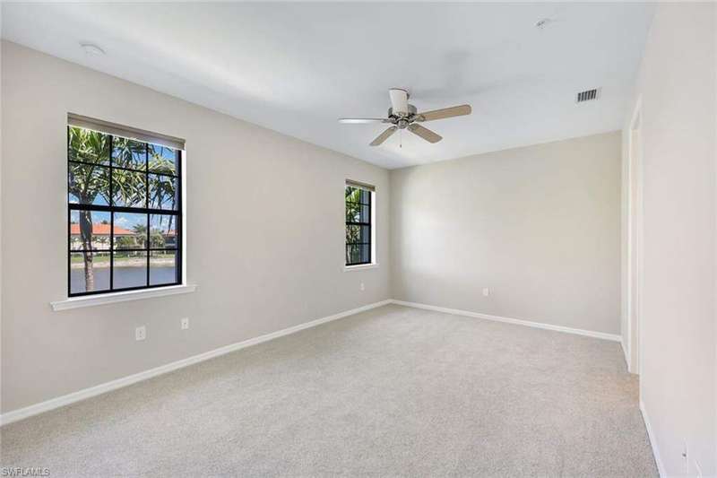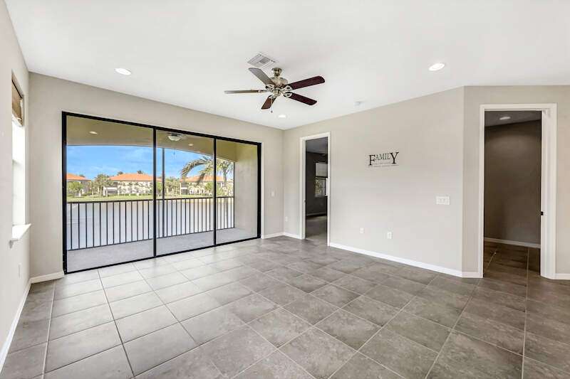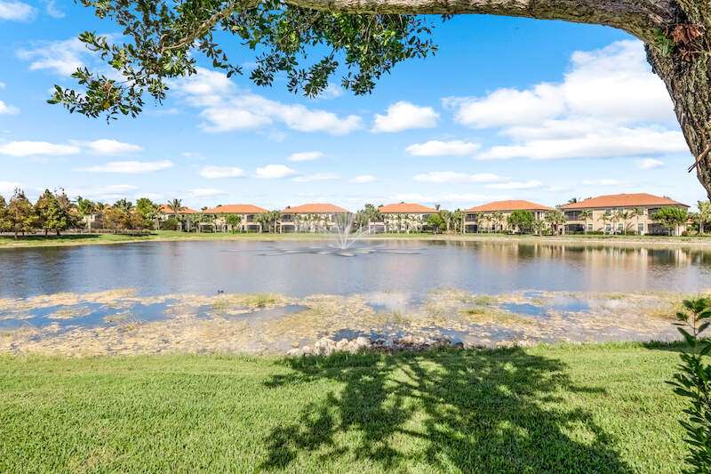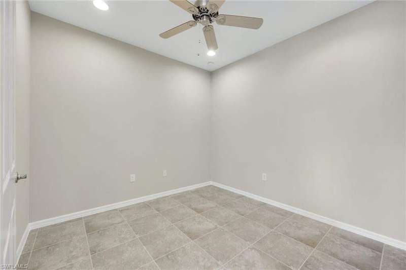 A MUST SEE Light & Bright second floor end unit offers a fantastic lake and fountain view. Just freshly painted throughout this 3 bedroom plus den features a spacious open floor plan with ceramic tiled living areas and 2 full baths. Beautifully appointed with 42" upper kitchen cabinets, granite counter tops, stainless steel kitchen appliances and a huge walk-in pantry makes for a cooks kitchen. For your convenience there are New accordion and rollup shutters added in 2022. At Paloma you'll enjoy a maintenance free lifestyle and resort style amenities with swimming pool, bocce court, fitness and club house with card room, gathering room, catering kitchen and tennis courts! Paloma is a gated community located in Bonita Springs, just off Imperial Pkwy with only minutes to the beach and Coconut Point Mall.