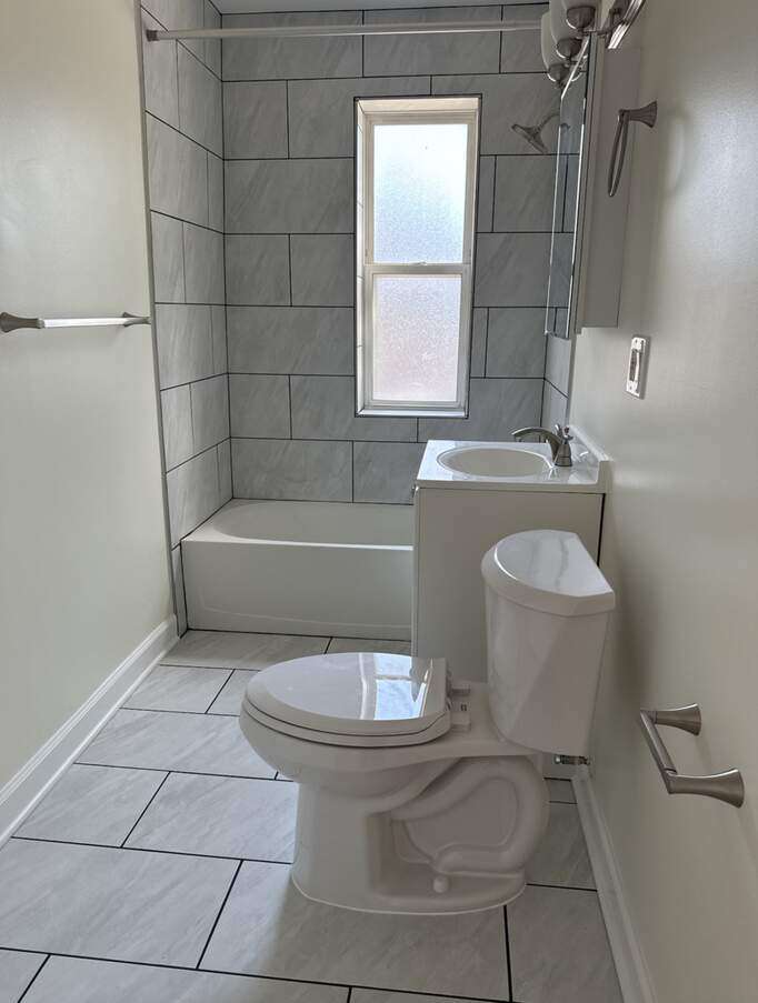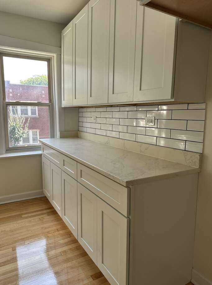 Just renovated ultra bright split two bed, one bathroom floorplan! Refinished hardwood floors throughout with an updated kitchen boasting white shaker cabinets, stainless steel appliances, quartz countertops and a stylish backsplash. Open concept living room adjacent to huge dining room which could be used for a fab home office! Bedrooms are split for privacy and can both accommodate a queen sized bed. Small porch outside kitchen door for grilling and shared backyard. Central heat and A/C and in-unit washer & dryer!